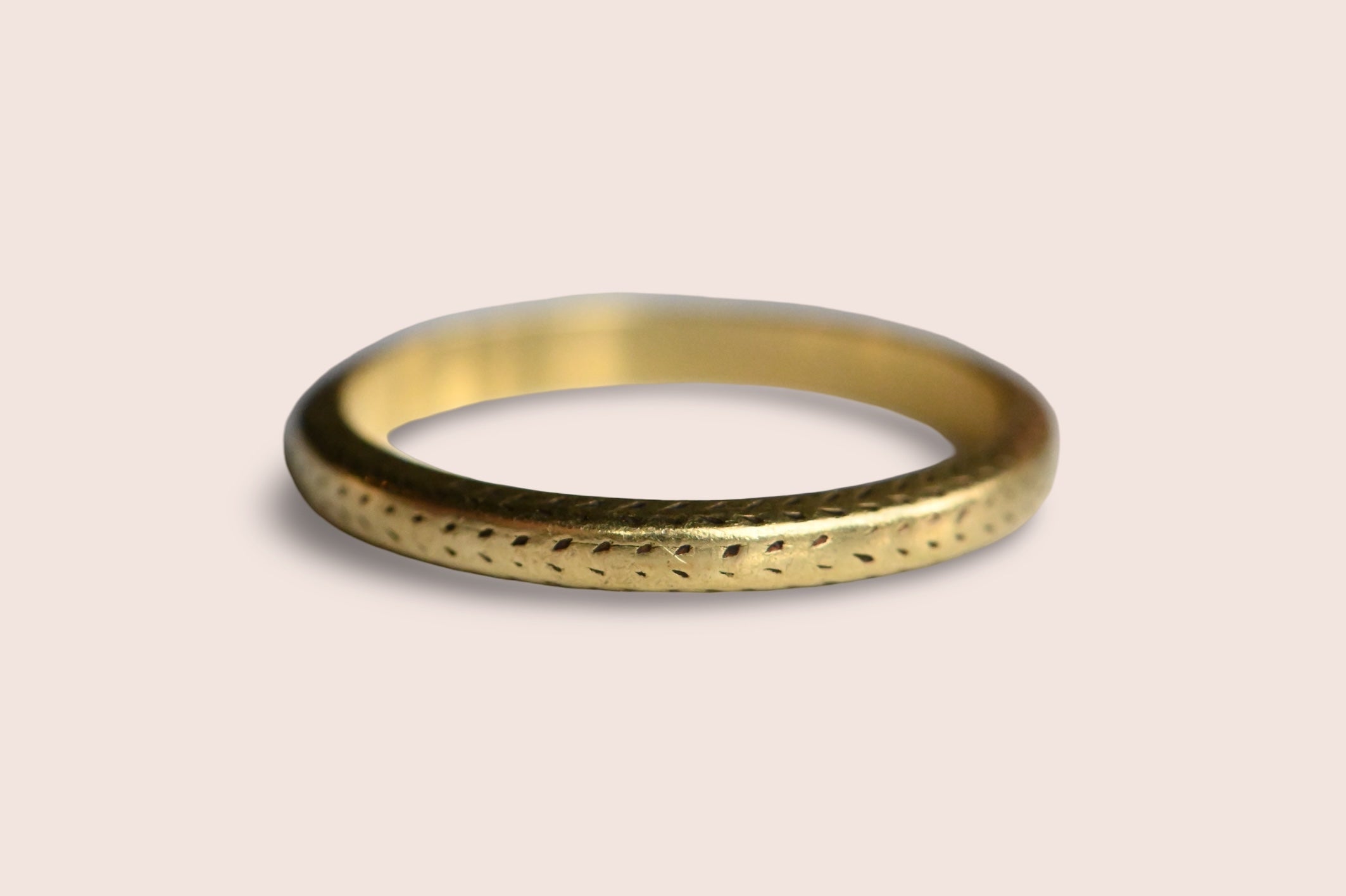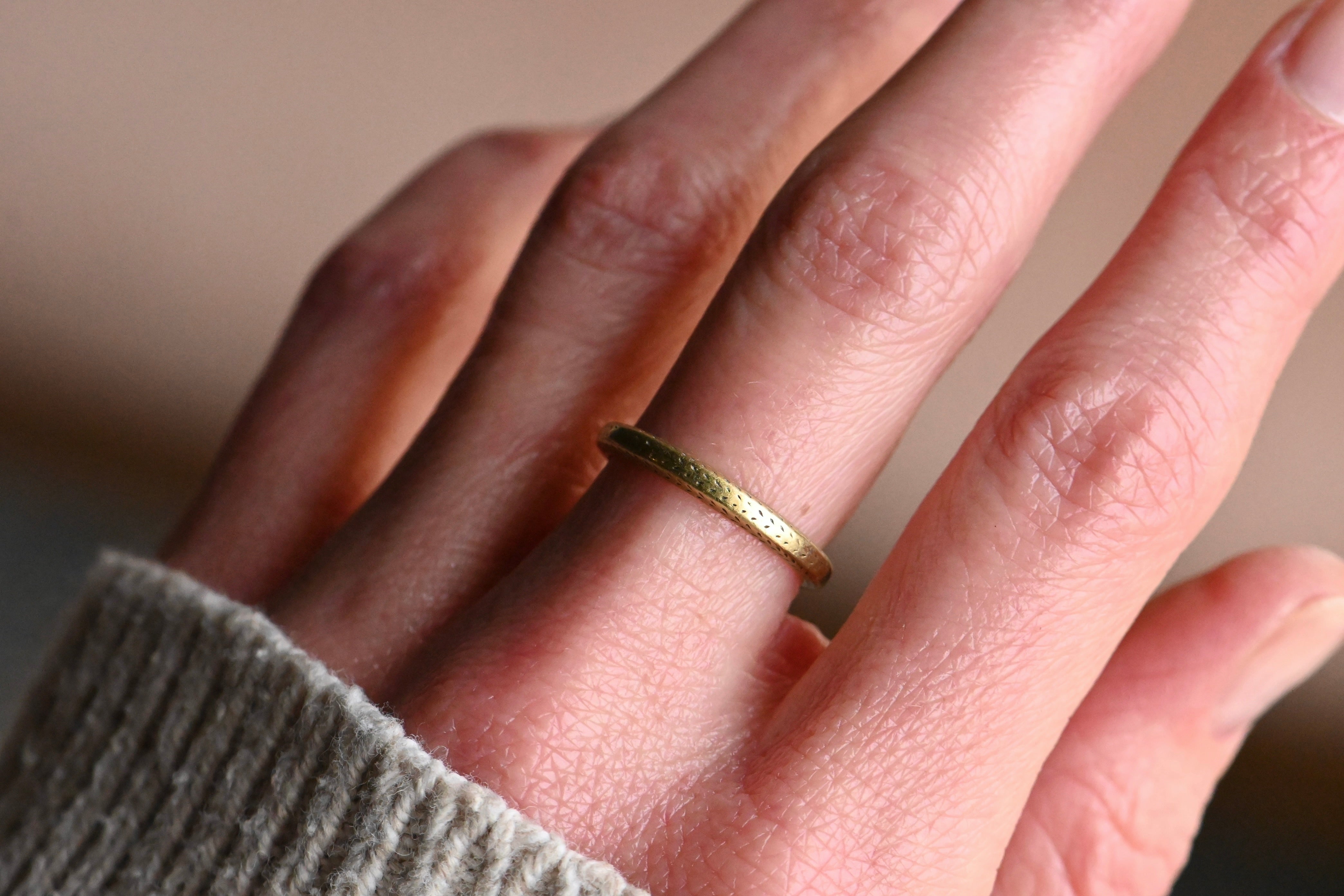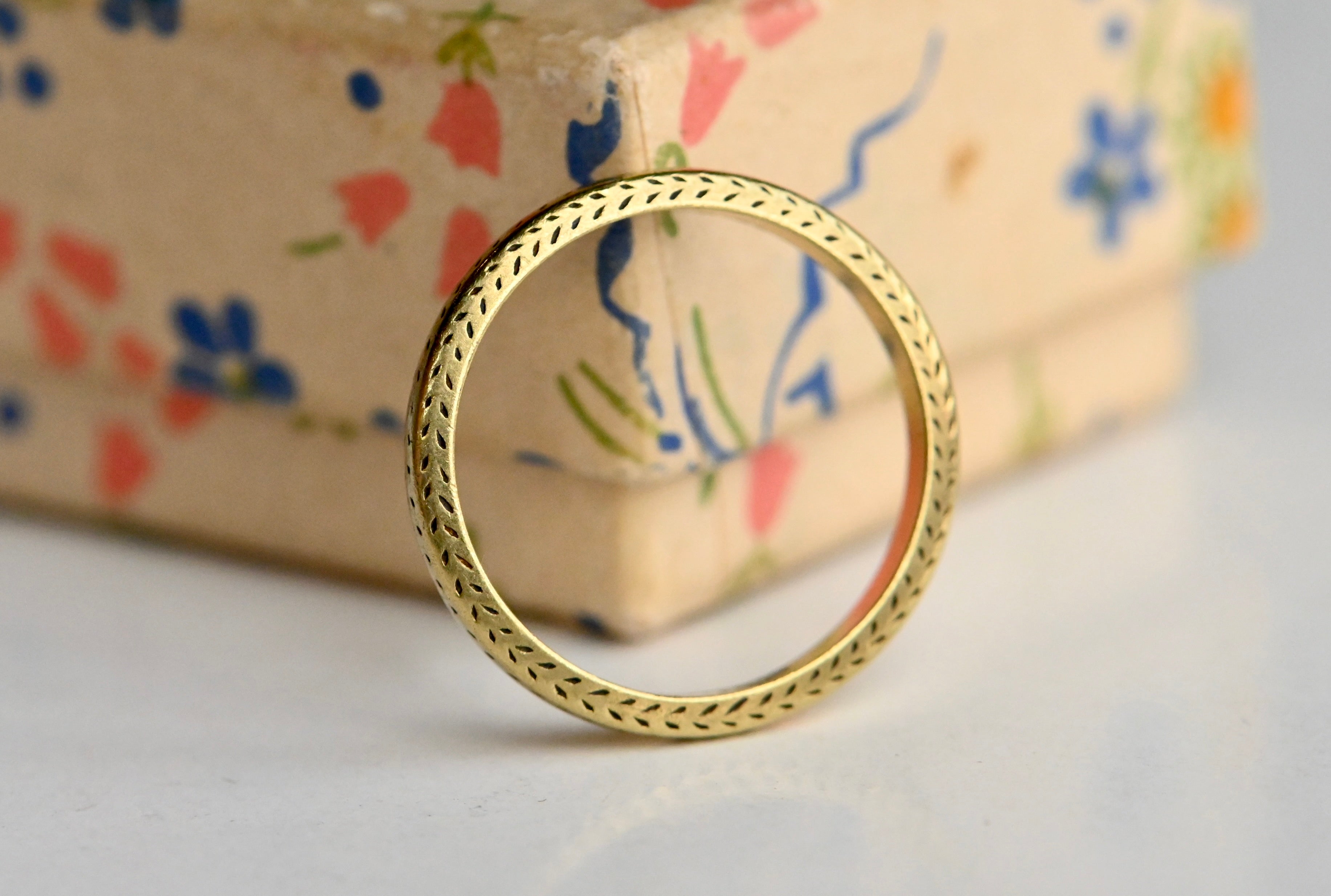 A subtly engraved 18K green gold wedding band with faded chevrons on three sides of the shank. Beautifully be-speckled! Beveled edges.