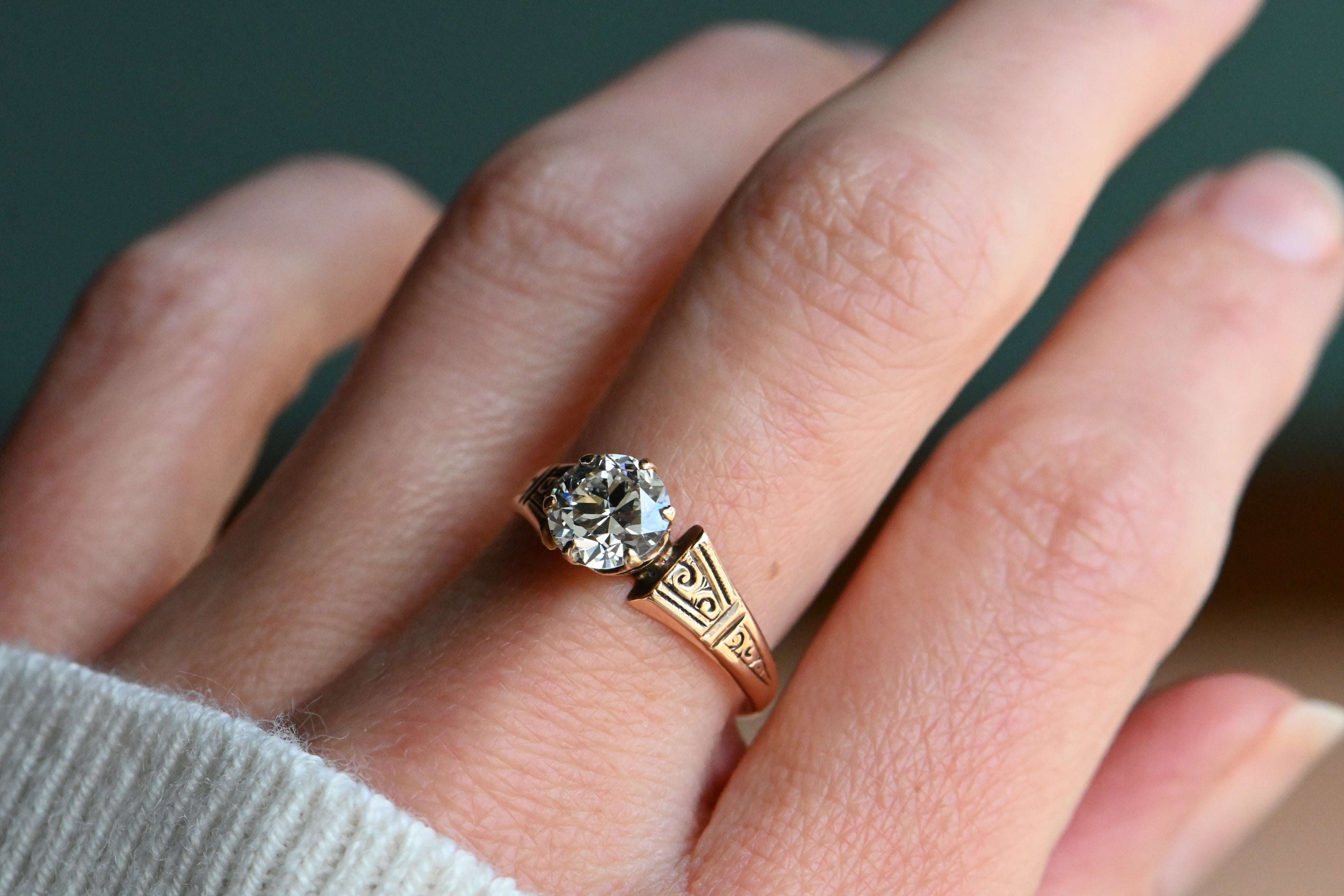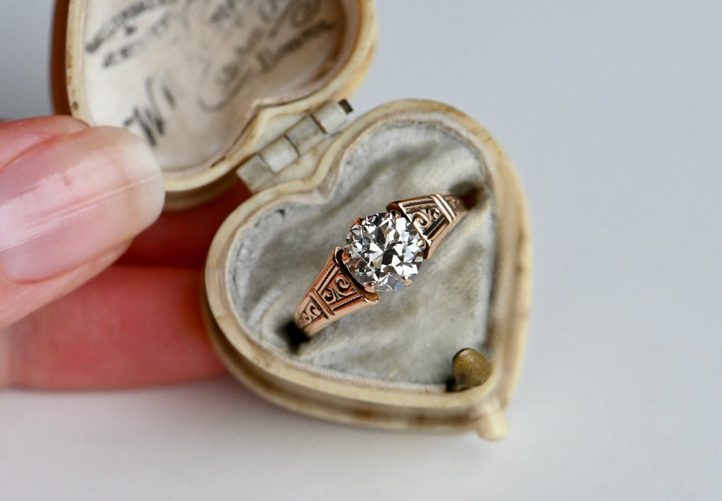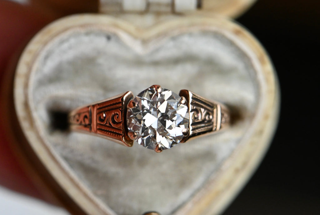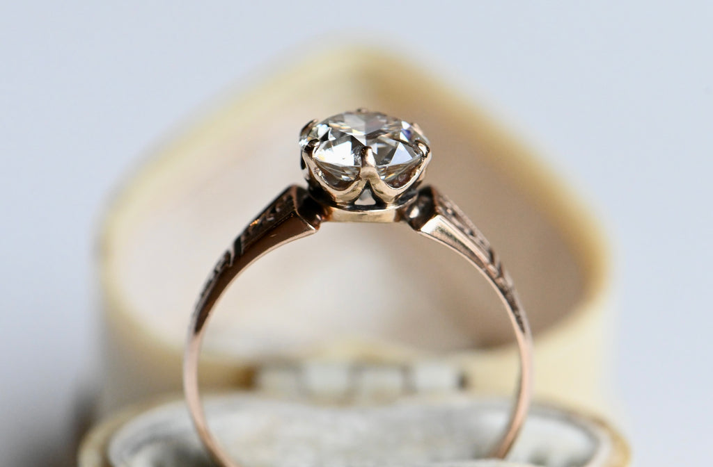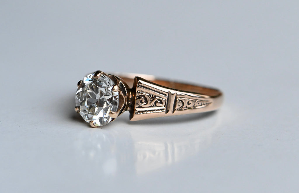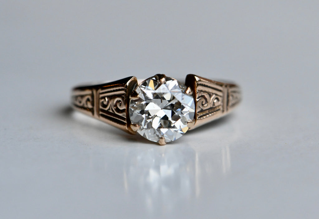 A plush 1.19 carat Old European Cut diamond matched with a turn-of-the-century, rosy-gold mounting. We searched high and low for the perfect setting for this twinkle-filled old cut diamond (which came to us loose) I think that we found it! The wide, flat, bell-shaped shoulders flare to meet the low-slung crown. The hand engraved detail on the mounting adds intrigue to the design but does not distract from the diamond. This stone - likely cut in the 1920s or 1930s - offers up superb proportions and heaps of sparkle.