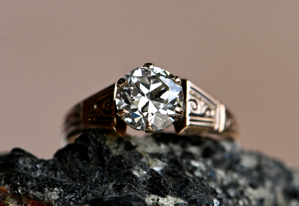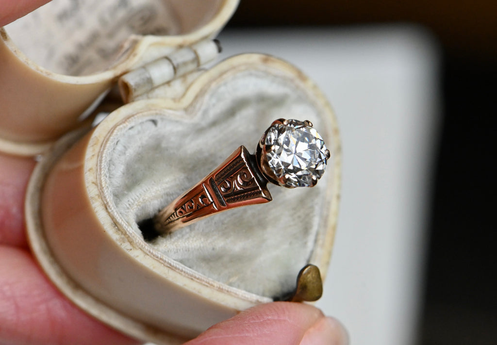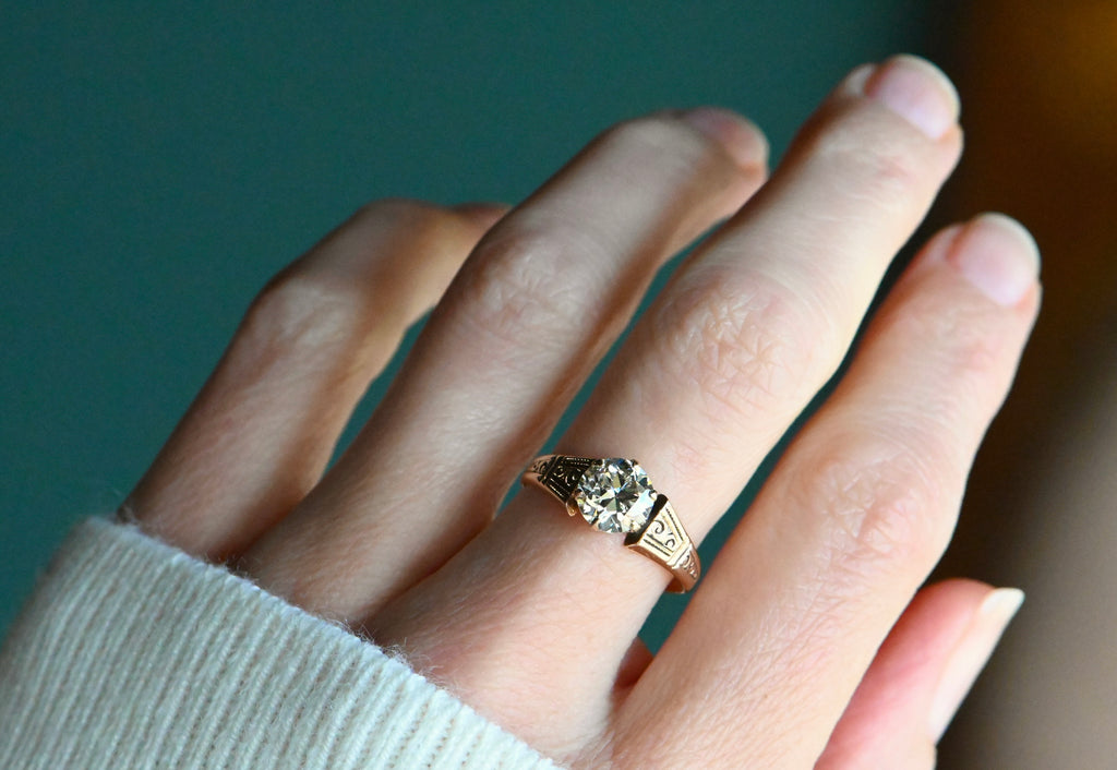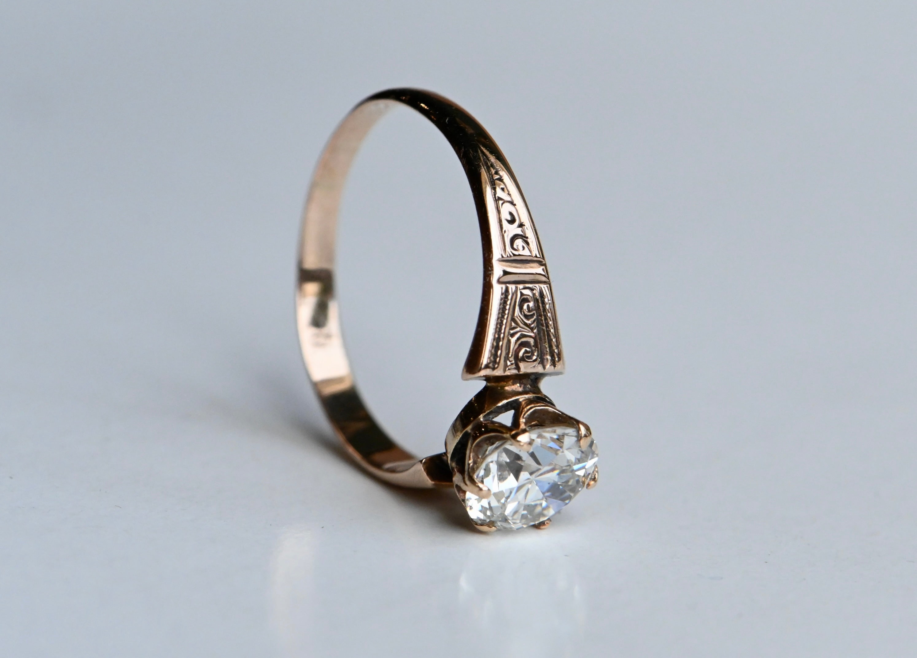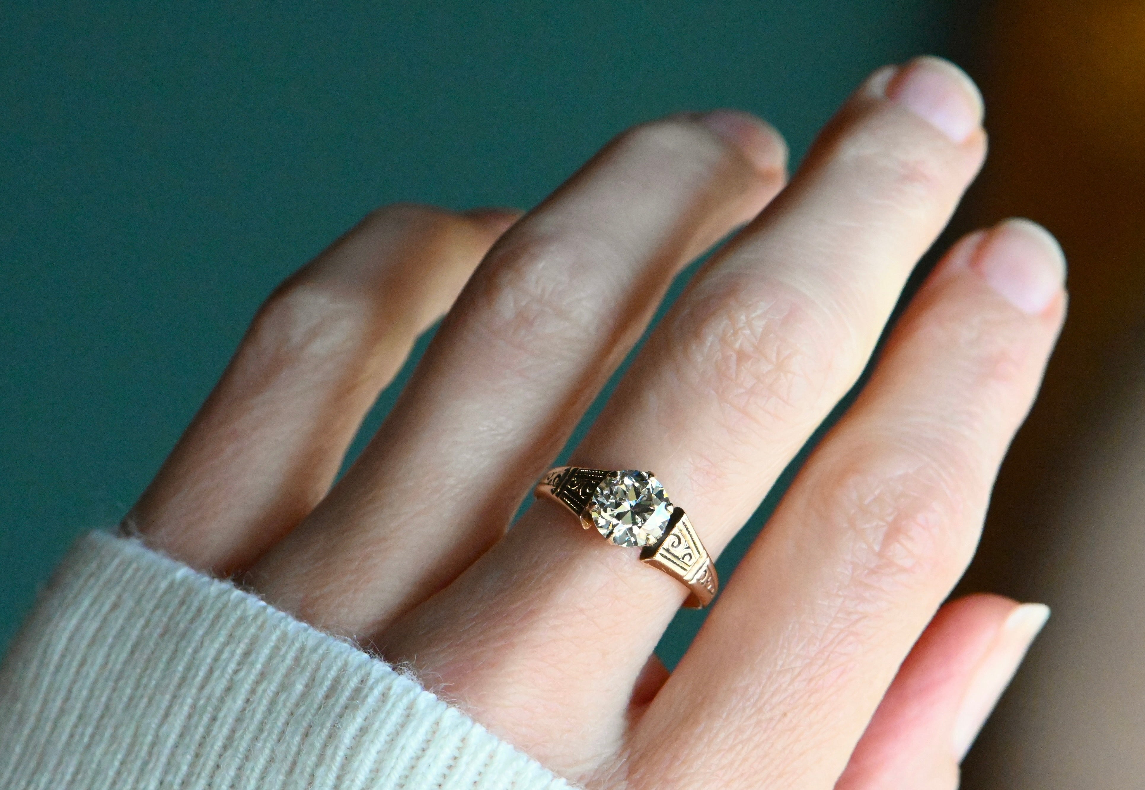 A plush 1.19 carat Old European Cut diamond matched with a turn-of-the-century, rosy-gold mounting. We searched high and low for the perfect setting for this twinkle-filled old cut diamond (which came to us loose) I think that we found it! The wide, flat, bell-shaped shoulders flare to meet the low-slung crown. The hand engraved detail on the mounting adds intrigue to the design but does not distract from the diamond. This stone - likely cut in the 1920s or 1930s - offers up superb proportions and heaps of sparkle.