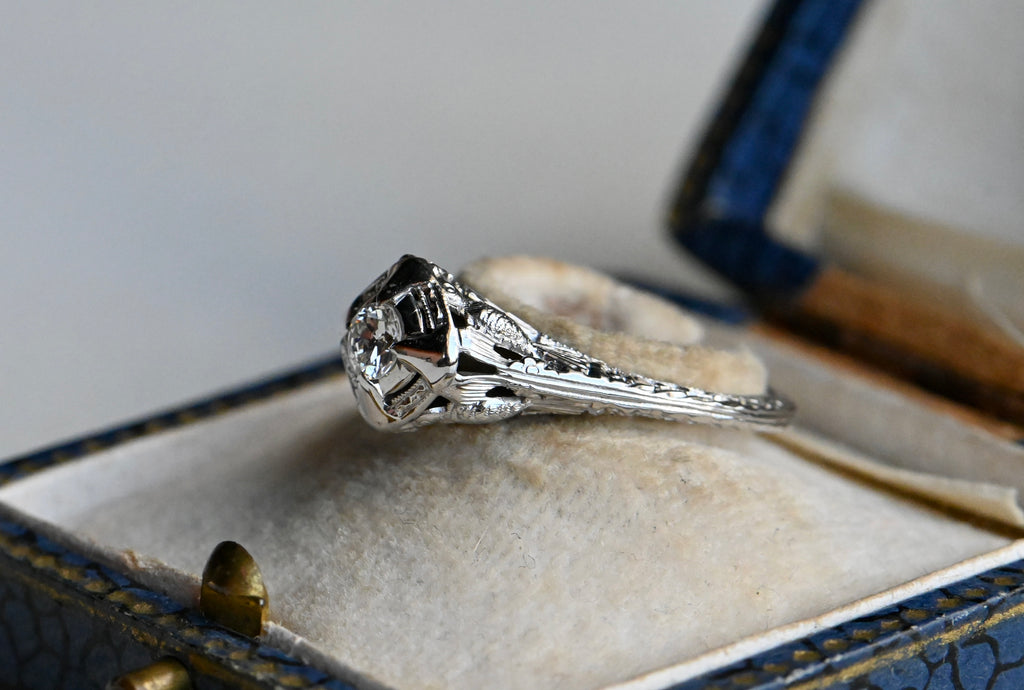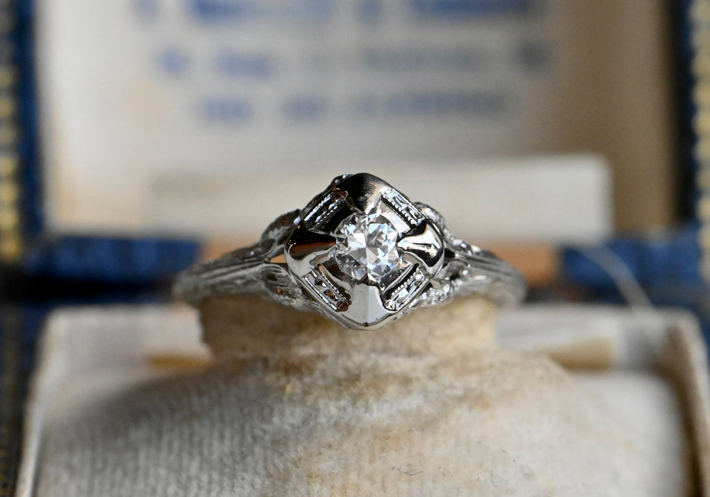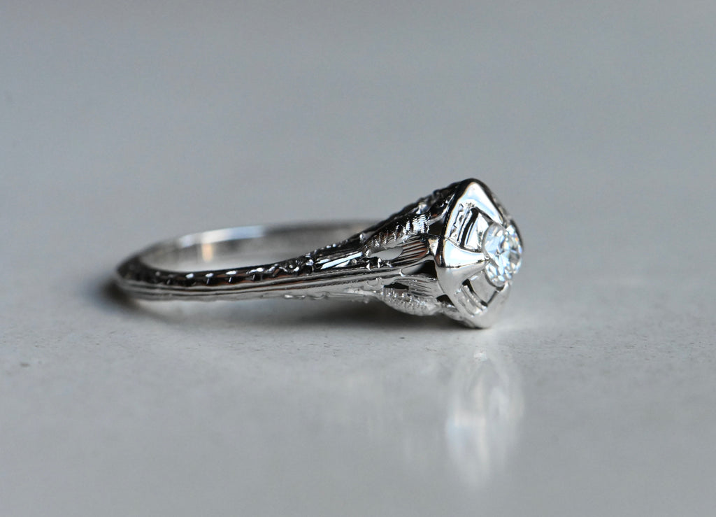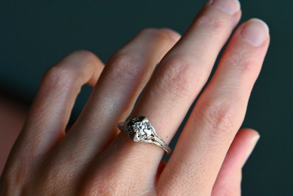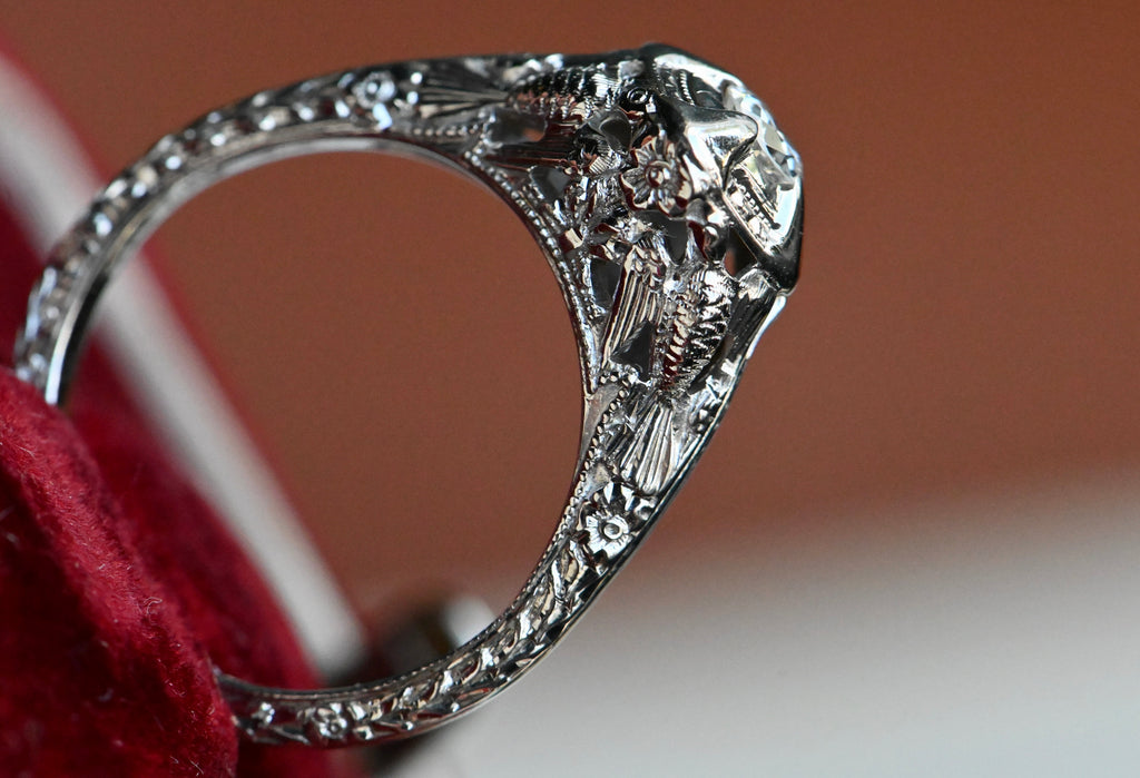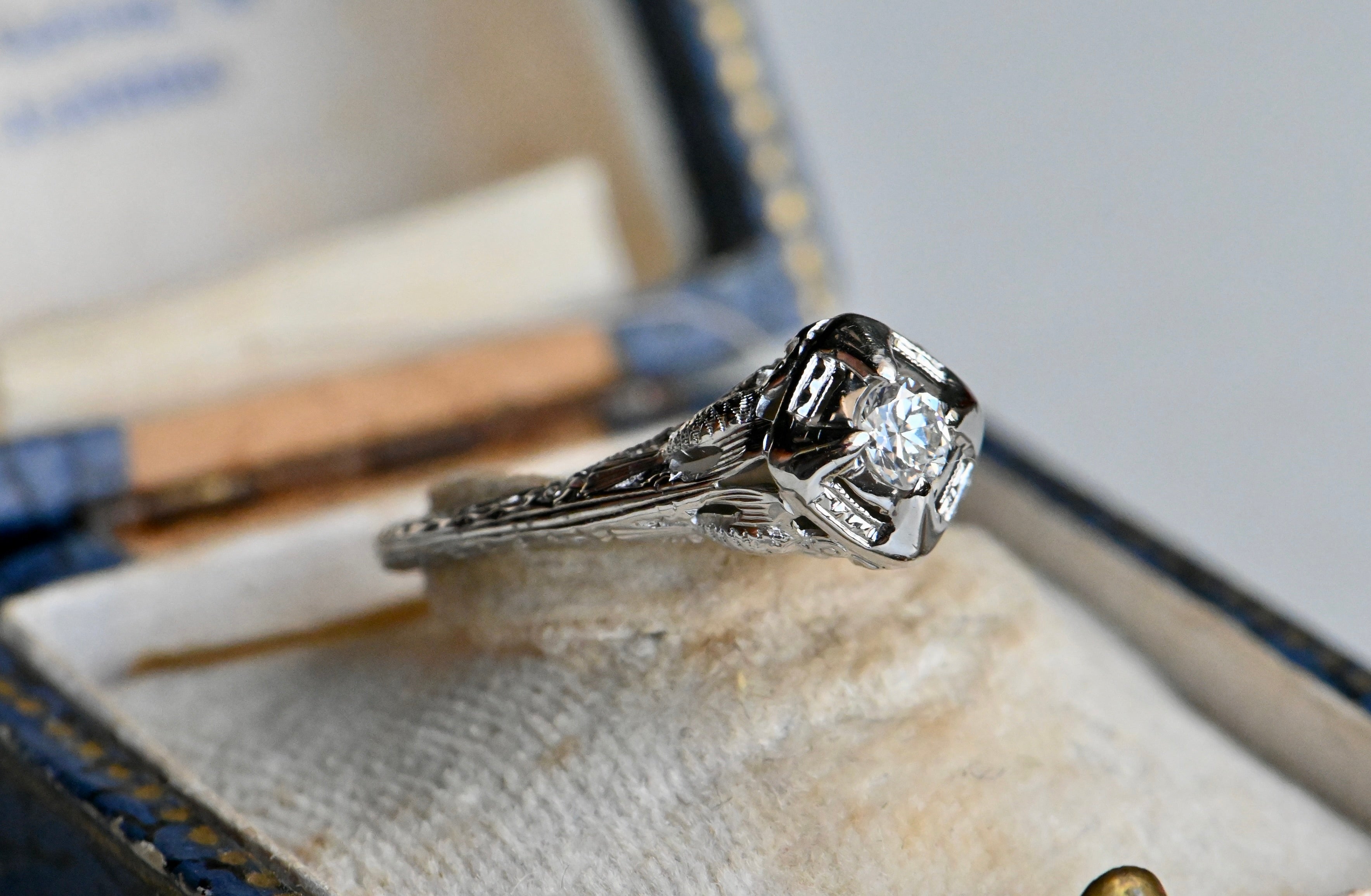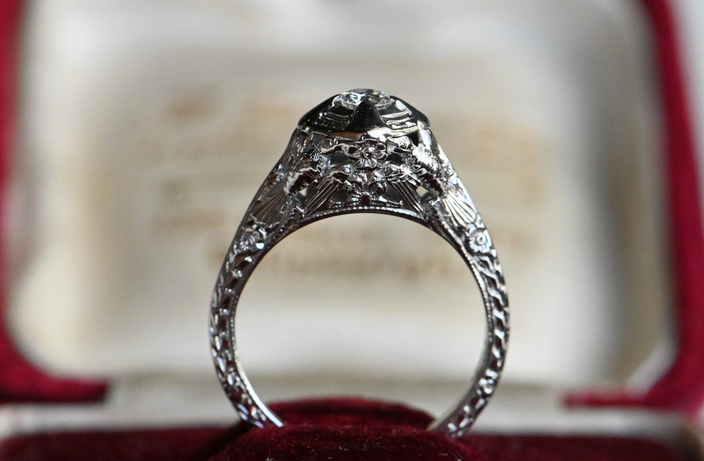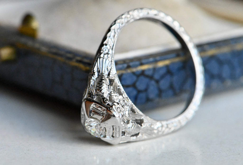 A ca. 1920s 18K Art Deco engagement ring with symbols of love etched into the setting. This appears at first glance to be a classic filigree ring but look closer and you will see pairs of canoodling lovebirds! The nesting pairs are etched into the gallery around the diamond, which is a sparkling .25 carat Old European Cut. The stone is set in a rotated square head with pierced details and compass-point prongs. The ring is die-struck with crisp, timeless details. A perfect choice for the ornithophile that you love!