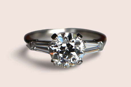 A mid-century diamond solitaire ring with a gorgeous 2.05 carat Old European Cut diamond in platinum. The ring is a classic beauty, with a streamlined mounting and tapered baguette diamond shoulders. The solitaire diamond boasts an 8+ millimeter spread and a low, refined profile. It draws the eye in and flashes with the romantic, slow-burning fire that we love in old cut diamonds. The brilliance here is spectral and soft, offering a luxurious, long-lasting, "checkerboard" sparkle in even the lowest light. The proportions of this ring are perfect and it is stunning on the hand. Refined bridal design at its best.