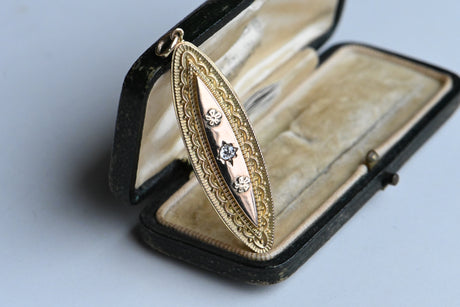 A turn-of-the-century navette pendant, beautifully converted from a hairwork brooch. The pendant is 9 CT yellow and rose gold with Neoclassical design details around the trim and a trio of accents - two raised blossoms and one .15 carat old mine cut diamond - spaced across the center. The verso is neatly inset with a fitted frame that lifts out to reveal a roomy hidden compartment. Full hallmarks for the year 1900, right around the time that hairwork jewelry beginning to fall out of style (hairwork jewelry peaked around 1870). This makes a stunning pendant and the compartment is easy to remove so that you can place your own special memento!