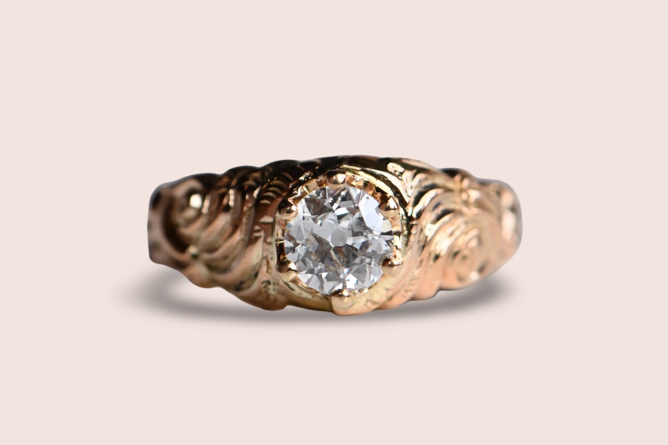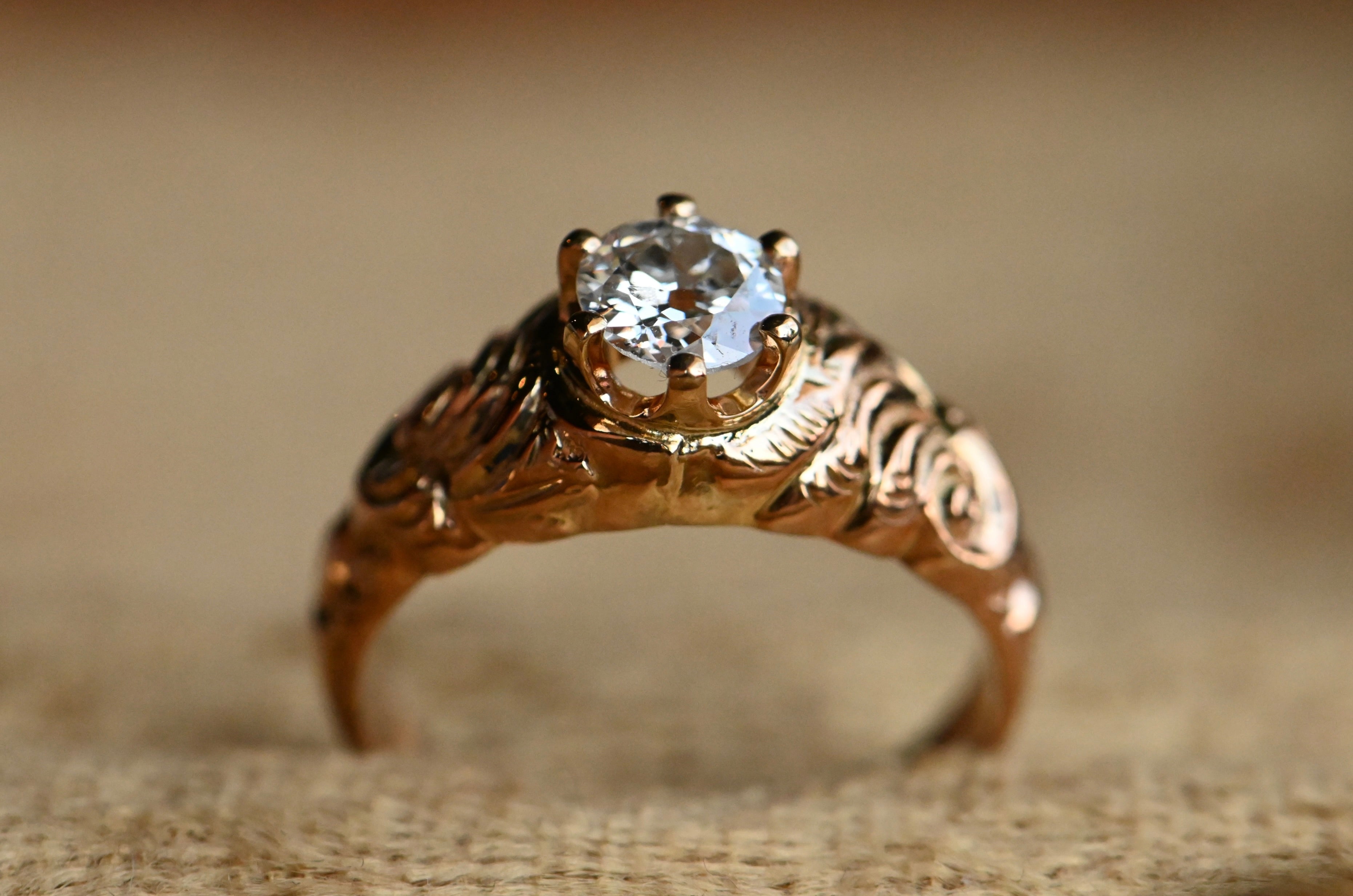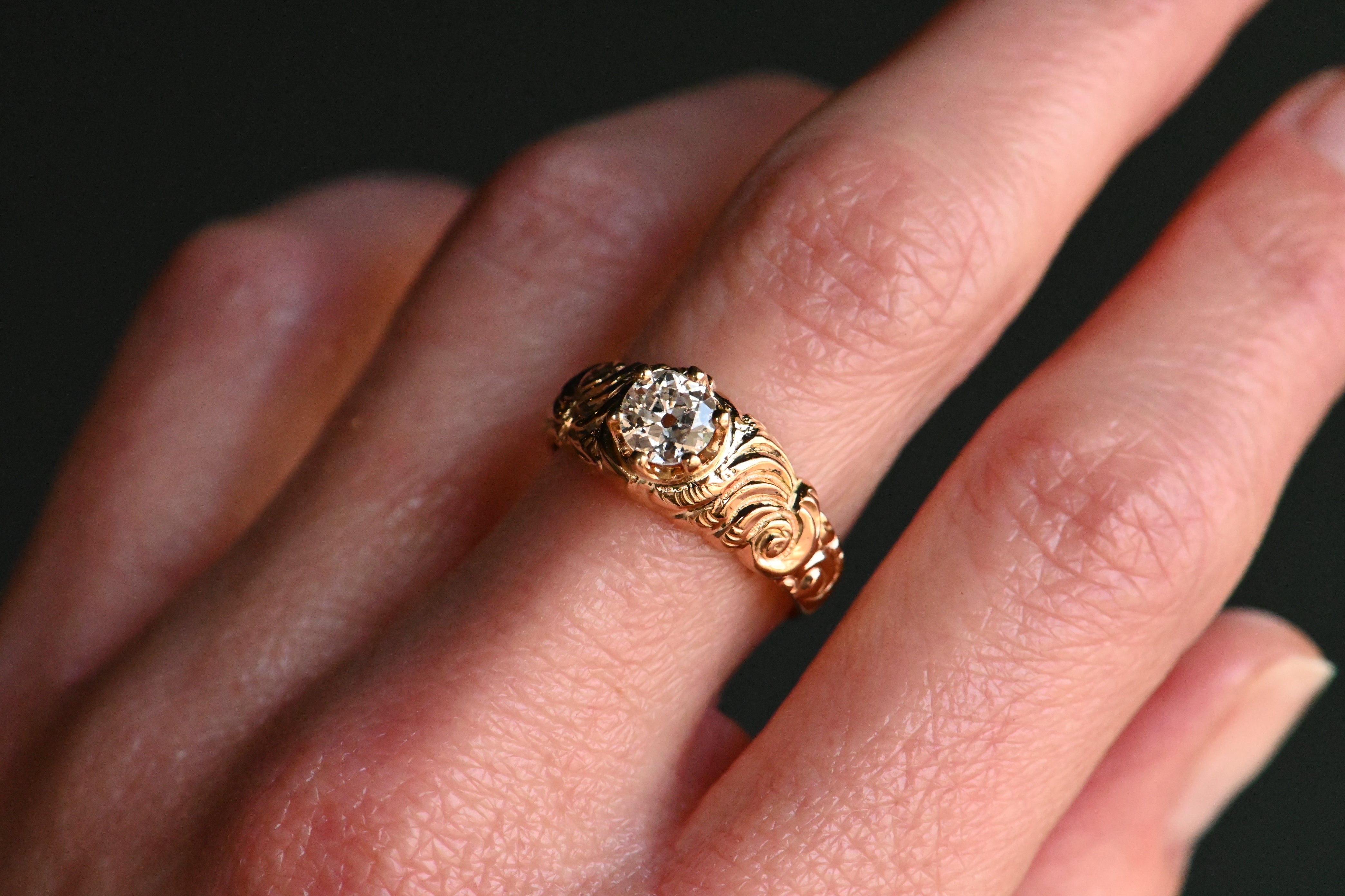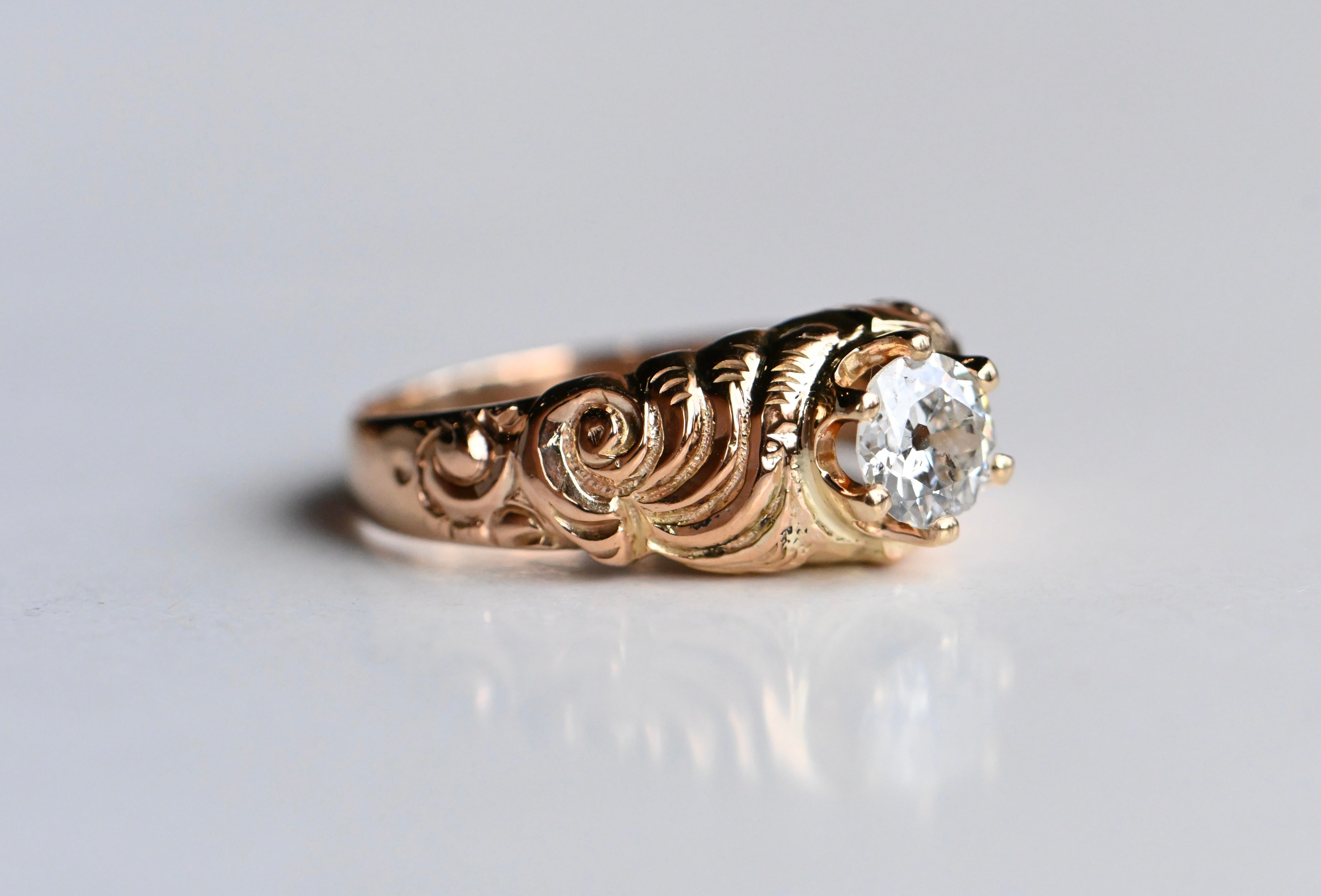 A striking old cut diamond ring with a mounting from the Victorian Era and a 1930s-Era diamond head. The marriage of the 19th century rose-gold shank and the low-slung, six prong crown head is oh-so-good! The diamond here is a .57 carat Old European Cut with a large culet, rugged facets and twinkling fire. It is far from perfect, with natural inclusions salt-and-peppering the body of the stone, but these don't detract from the lively sparkle and vibrancy of the diamond. The shoulders of the mounting are carved with a dense and lush floral motif, with roses rising up out of the gold.