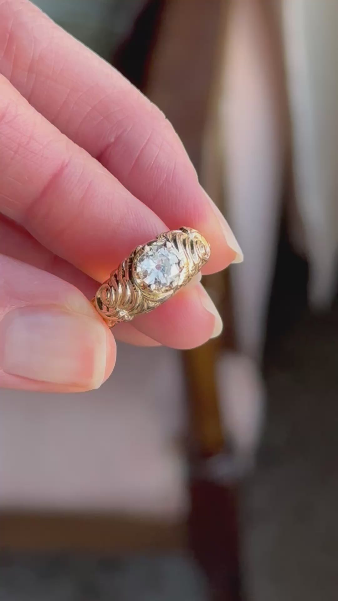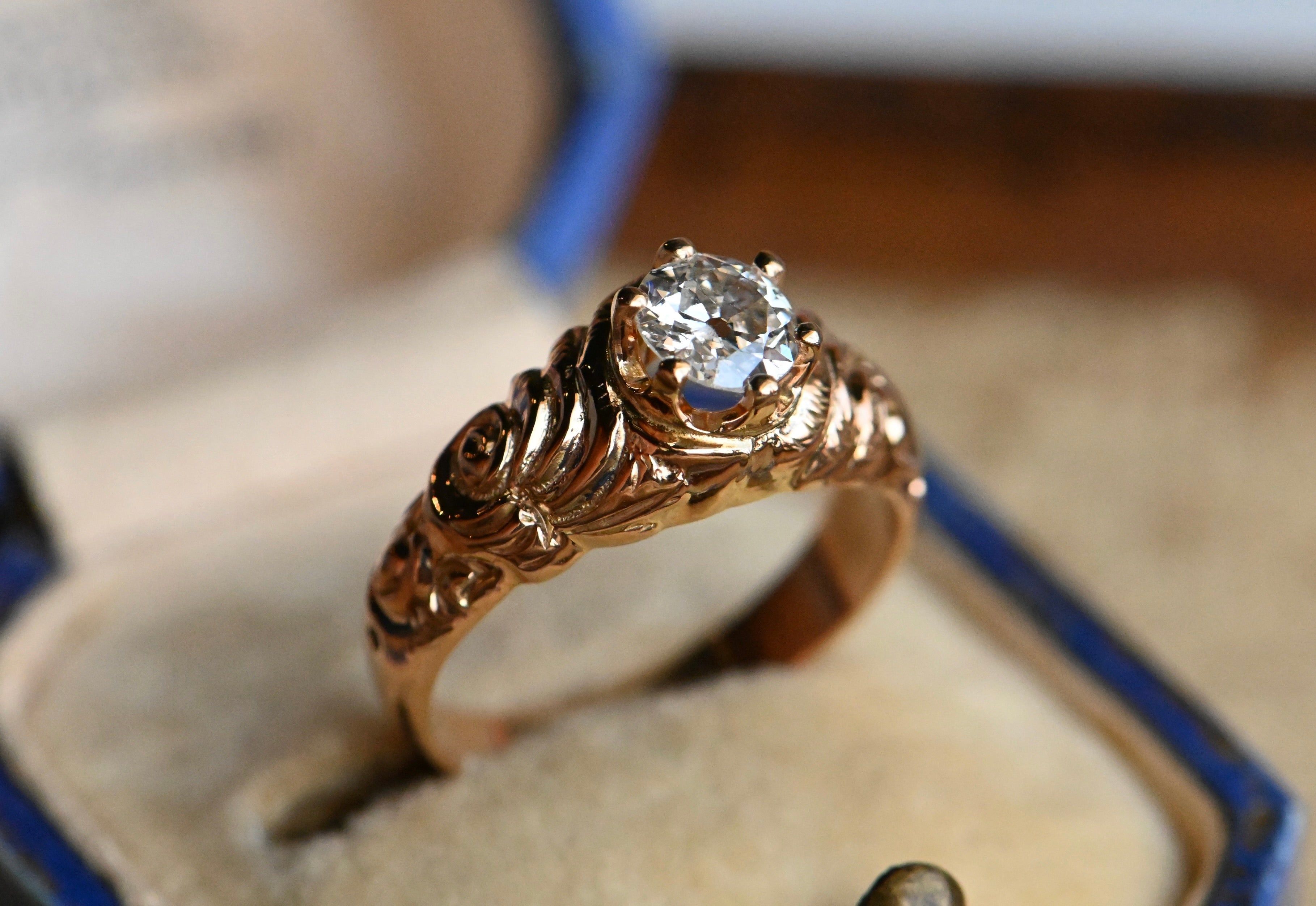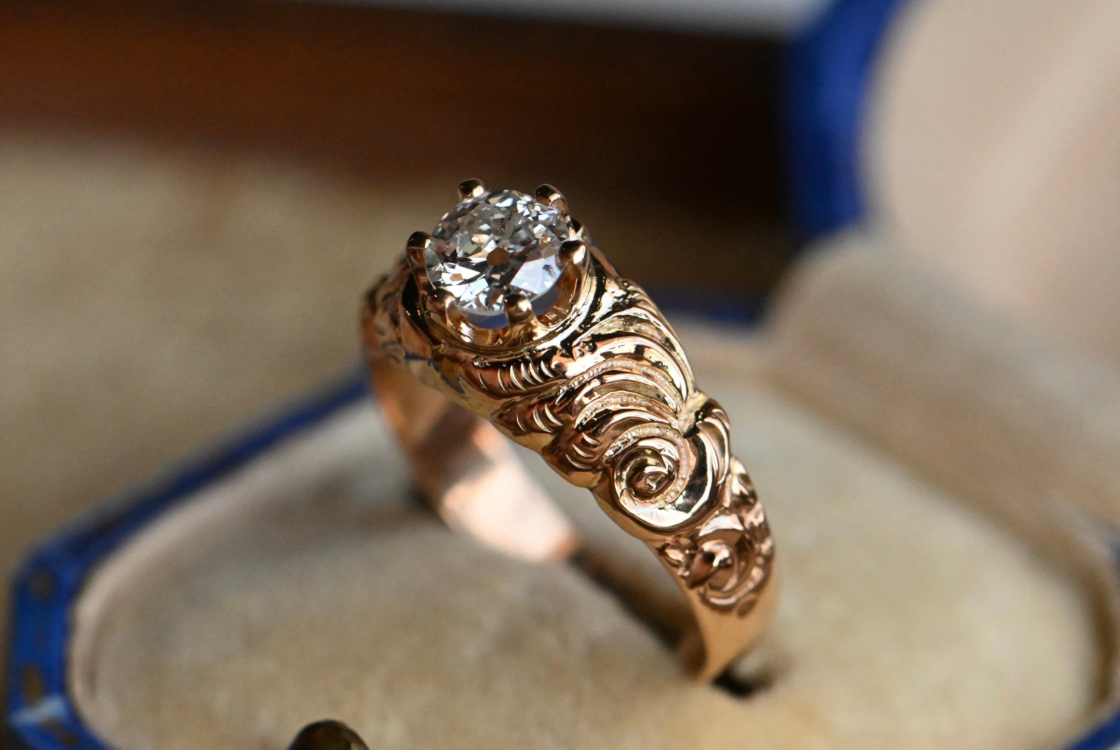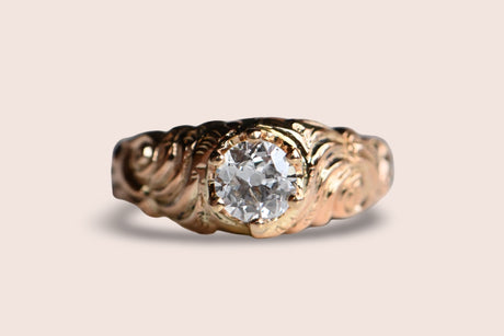 A striking old cut diamond ring with a mounting from the Victorian Era and a 1930s-Era diamond head. The marriage of the 19th century rose-gold shank and the low-slung, six prong crown head is oh-so-good! The diamond here is a .57 carat Old European Cut with a large culet, rugged facets and twinkling fire. It is far from perfect, with natural inclusions salt-and-peppering the body of the stone, but these don't detract from the lively sparkle and vibrancy of the diamond. The shoulders of the mounting are carved with a dense and lush floral motif, with roses rising up out of the gold.