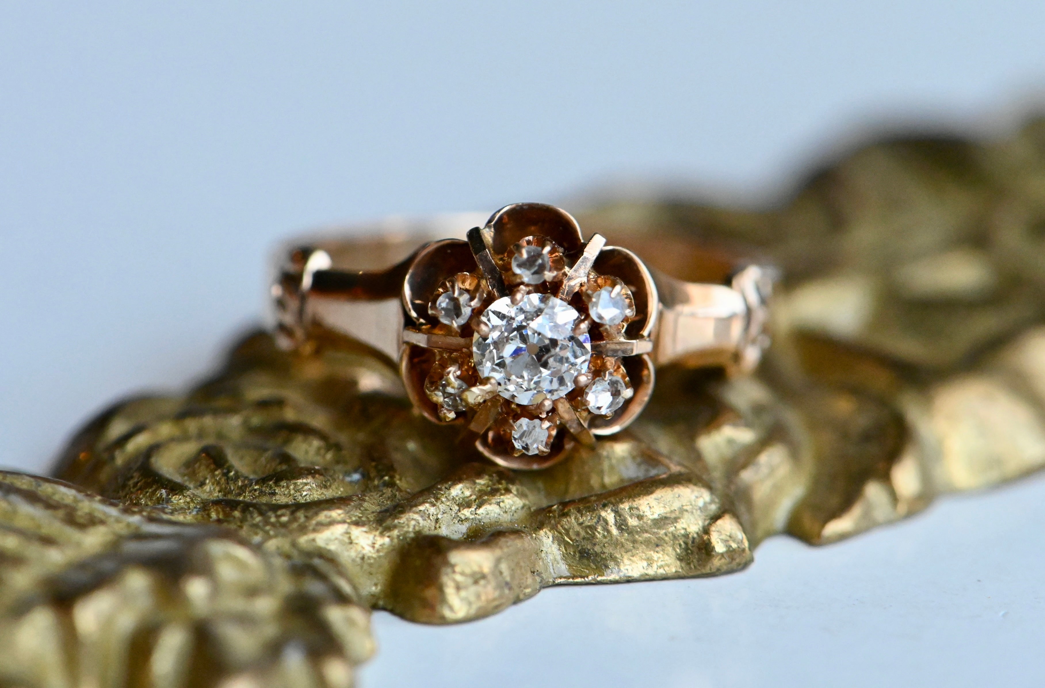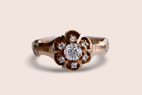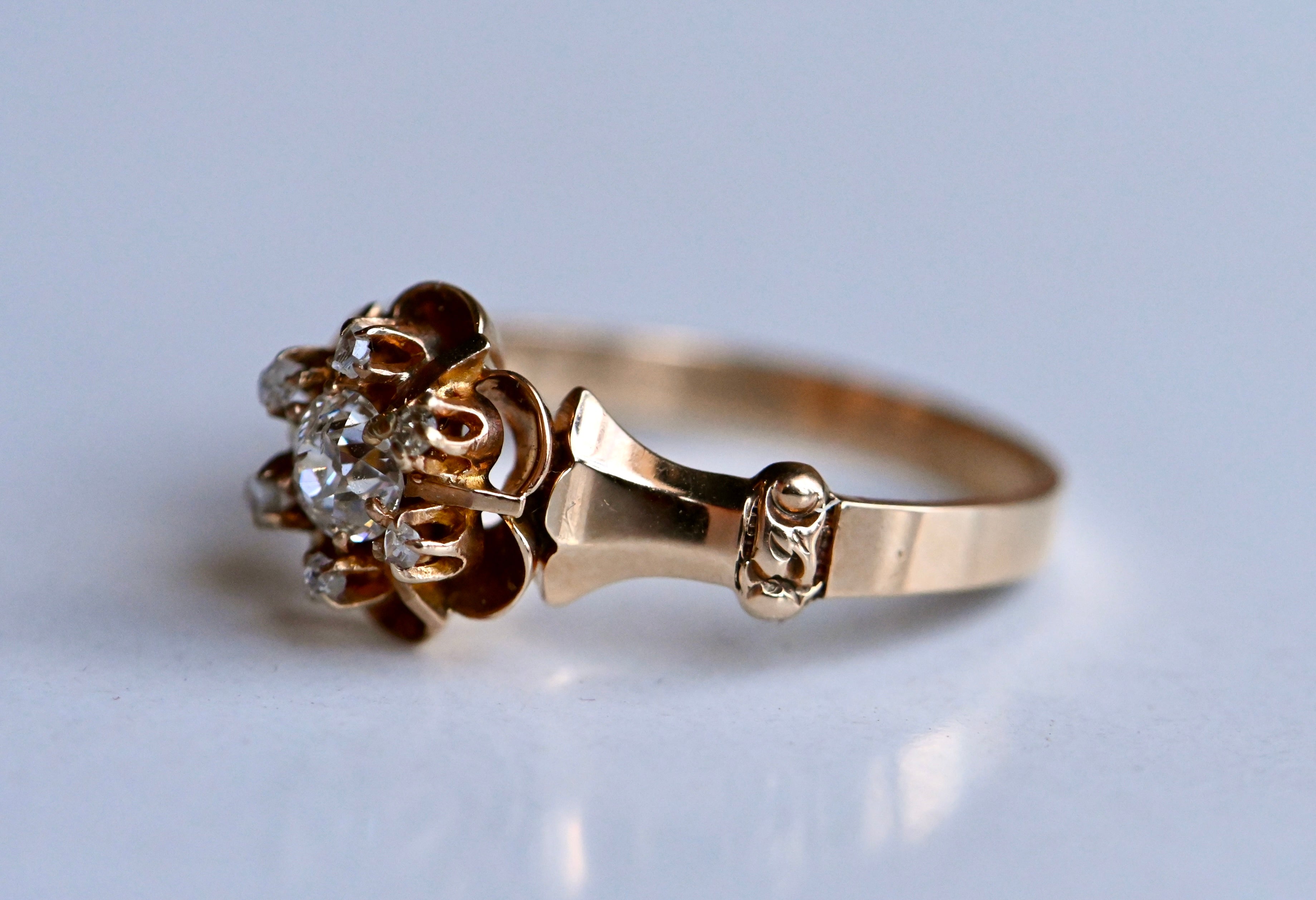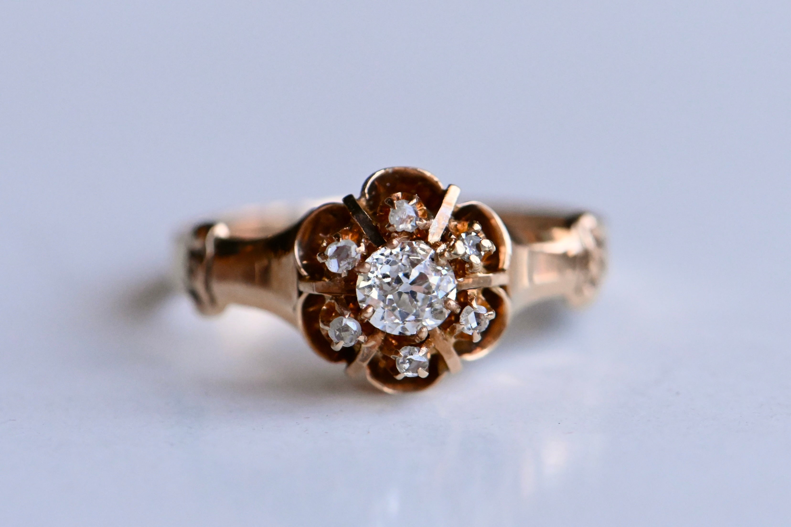 A turn-of-the-century Old Mine Cut diamond cluster ring with a buttercup head in 10K blushing gold. The diamonds gather in the flower-shaped cluster - a .30 carat diamond at the center and a trim of six smaller rose cut diamonds - and seem to float above the ring. Polished bar "spokes" between the rose cuts add a special detail. The shoulders are fluted and flared, absolutely classic to the late 1800s-early 1900s ring design. A sparkling constellation of century-old diamonds! The inside of the band is stamped with the maker's mark - Allsopp Bros. of Newark, NJ.