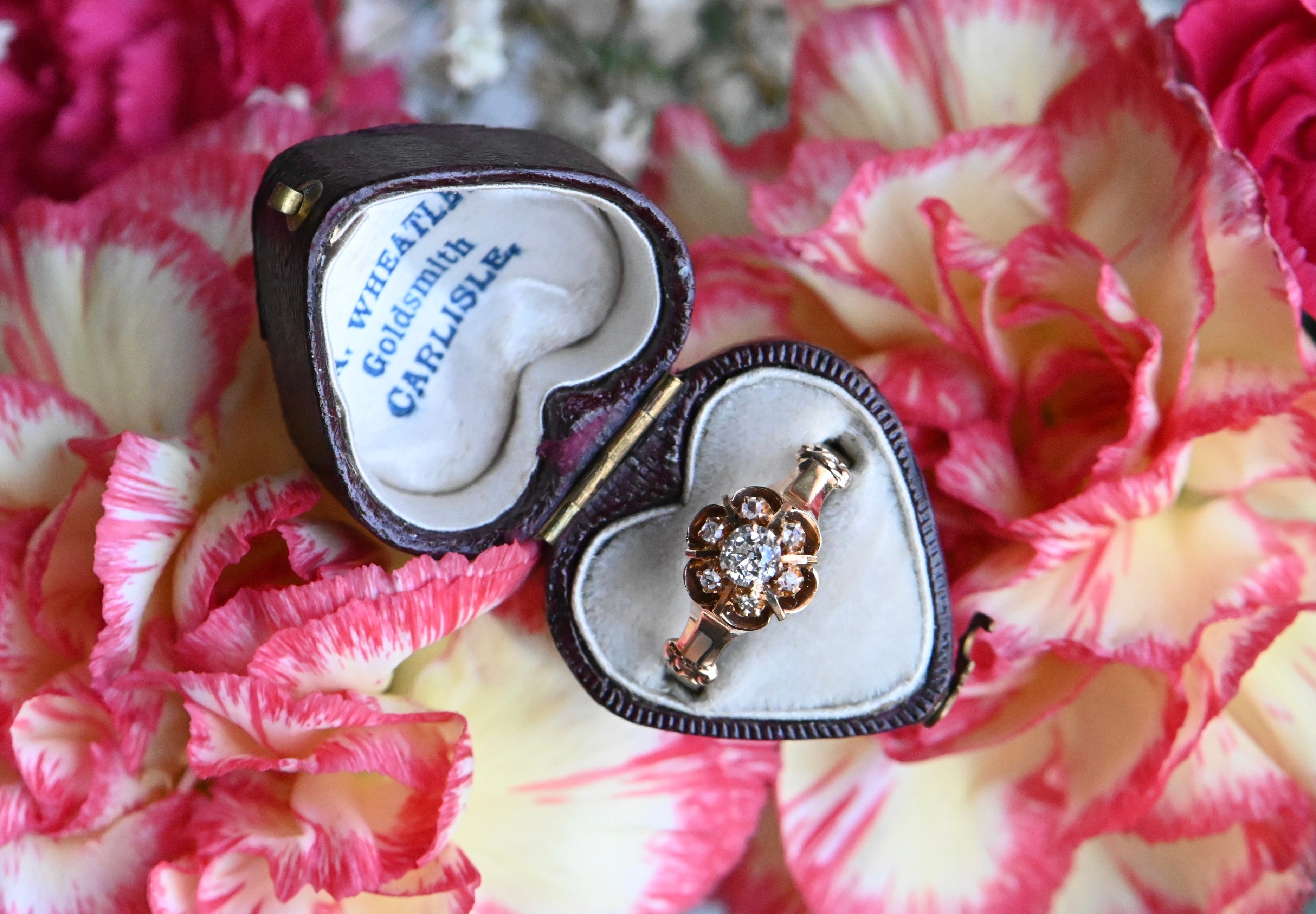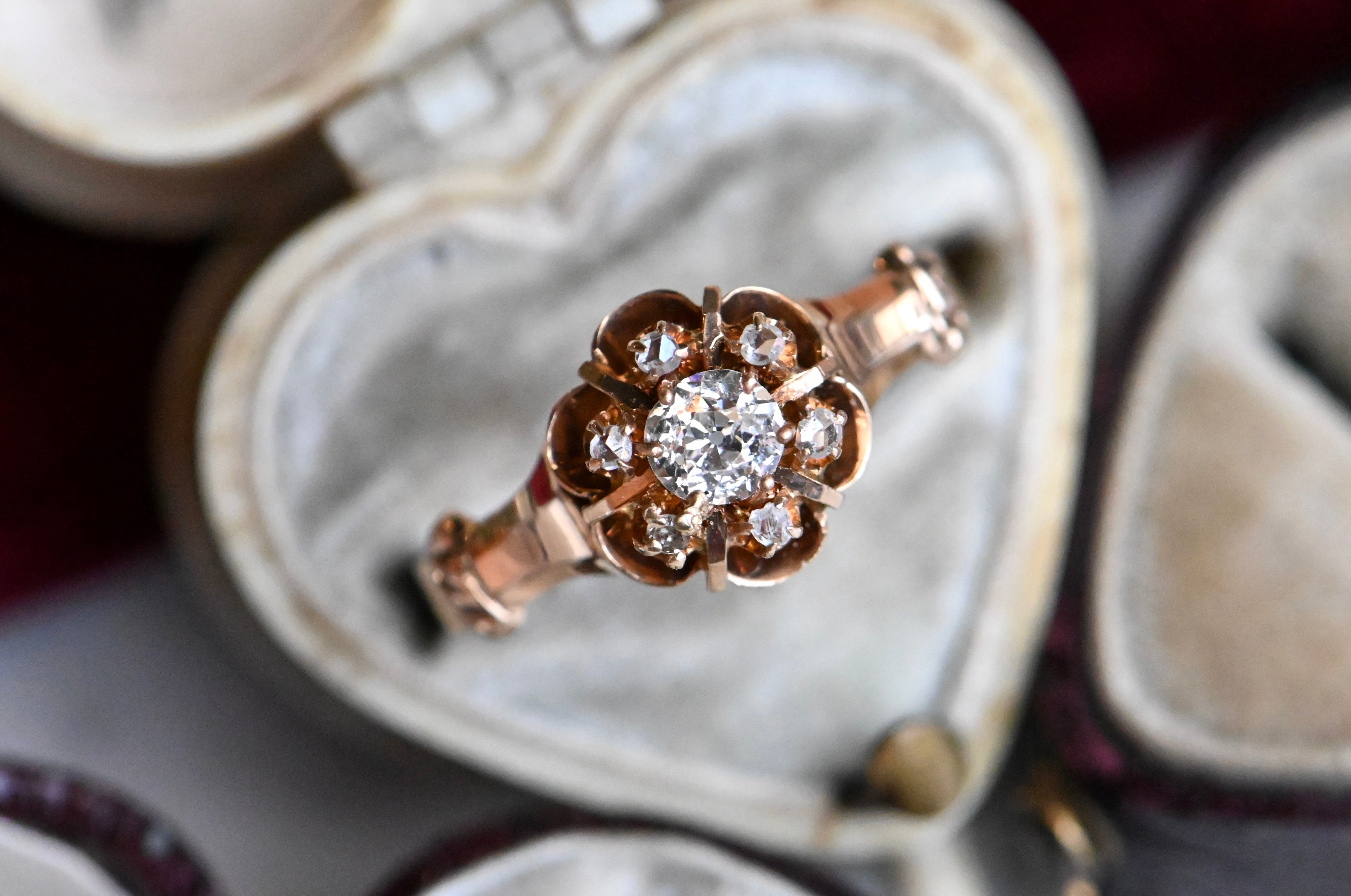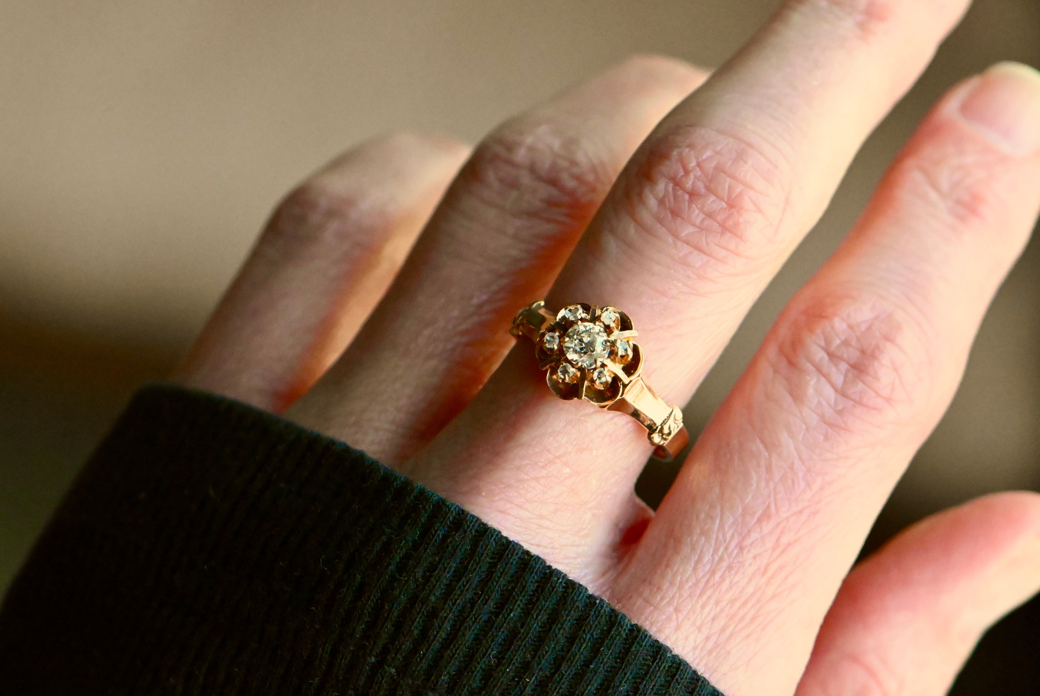 A turn-of-the-century Old Mine Cut diamond cluster ring with a buttercup head in 10K blushing gold. The diamonds gather in the flower-shaped cluster - a .30 carat diamond at the center and a trim of six smaller rose cut diamonds - and seem to float above the ring. Polished bar "spokes" between the rose cuts add a special detail. The shoulders are fluted and flared, absolutely classic to the late 1800s-early 1900s ring design. A sparkling constellation of century-old diamonds! The inside of the band is stamped with the maker's mark - Allsopp Bros. of Newark, NJ.