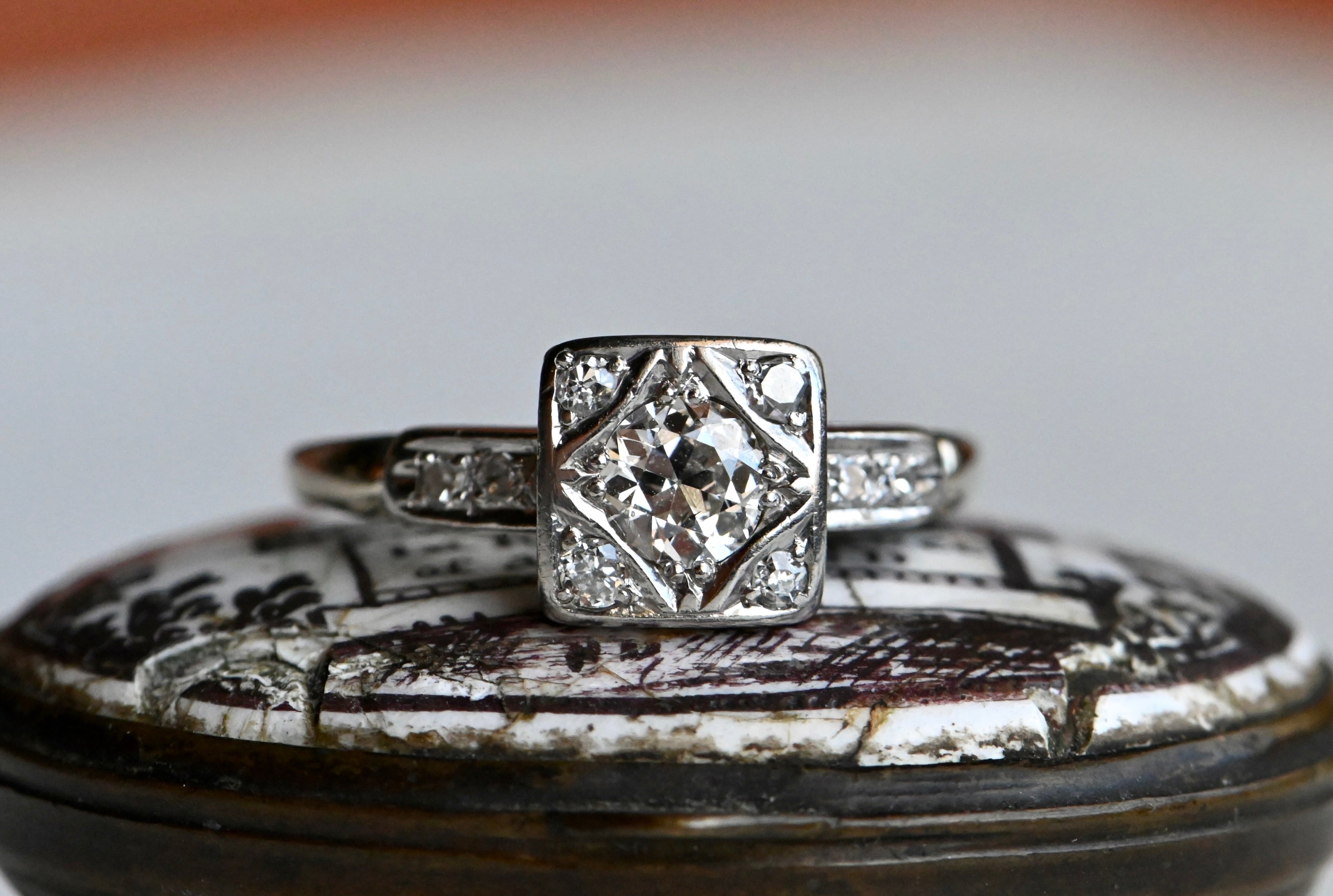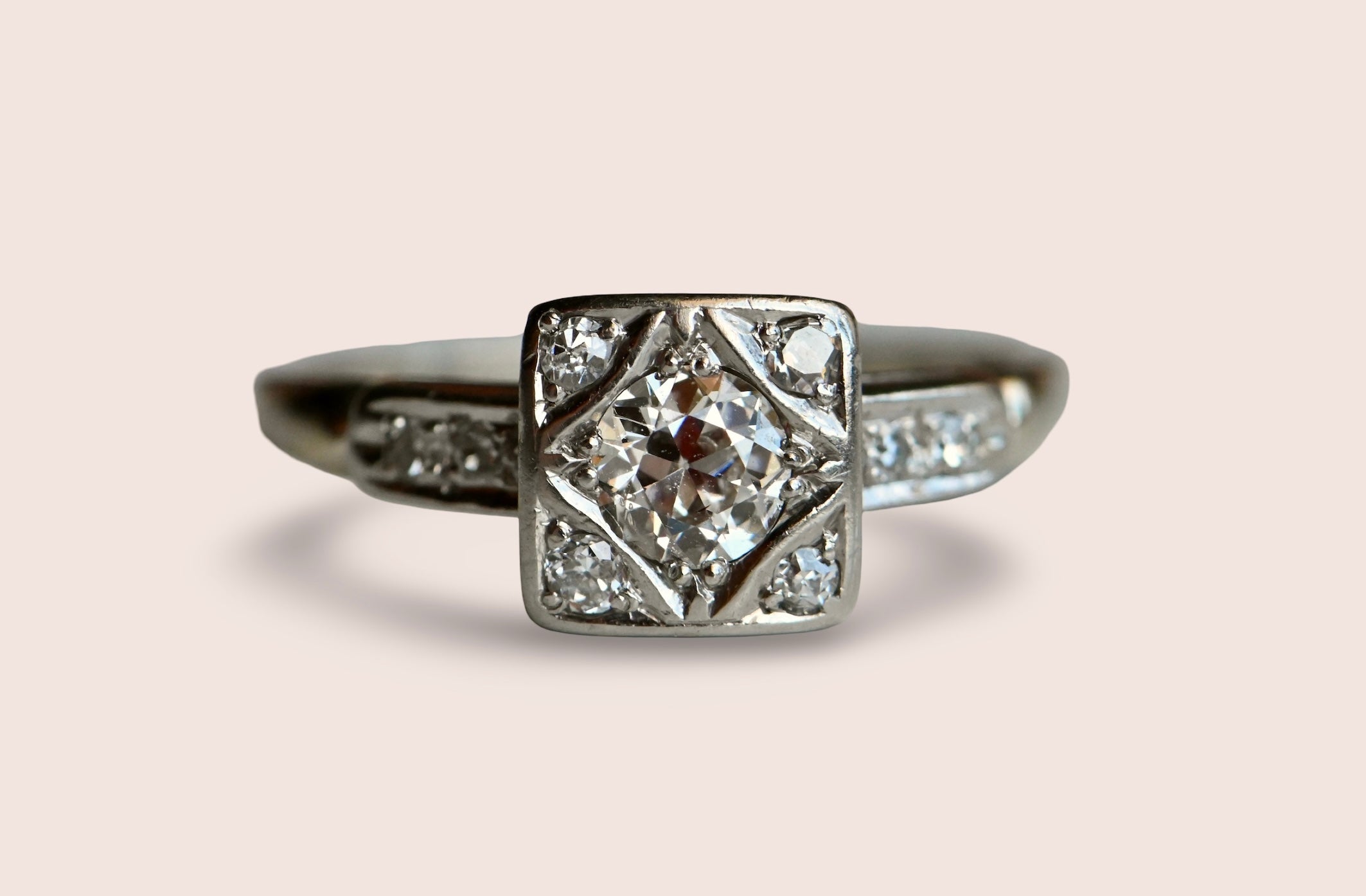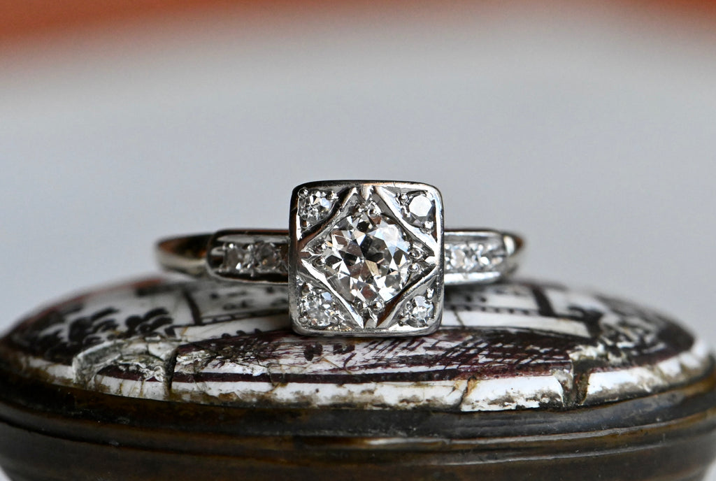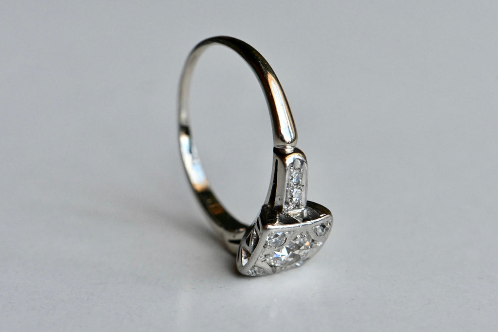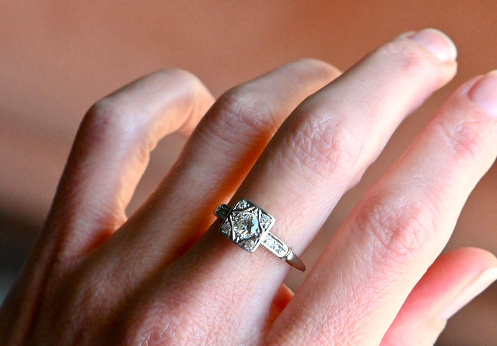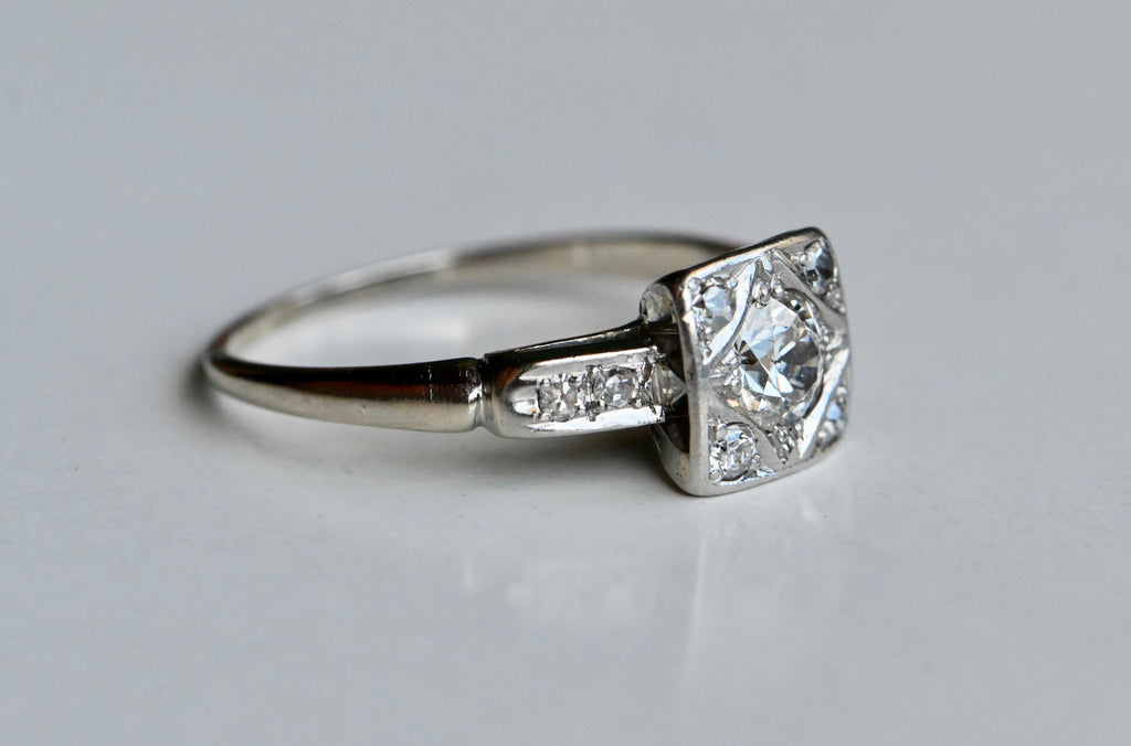 A pretty .35 carat Old European Cut diamond solitaire with a superb Art Deco mounting. This ring is a study in geometry, with square, triangular, round, and diamond-shaped design elements. The primary diamond is flush set fishtail prongs in a shapely frame. Single cut diamonds tuck into the corners around it, all contained within a square head. Streamlined and classic shoulders with pairs of further single cuts.