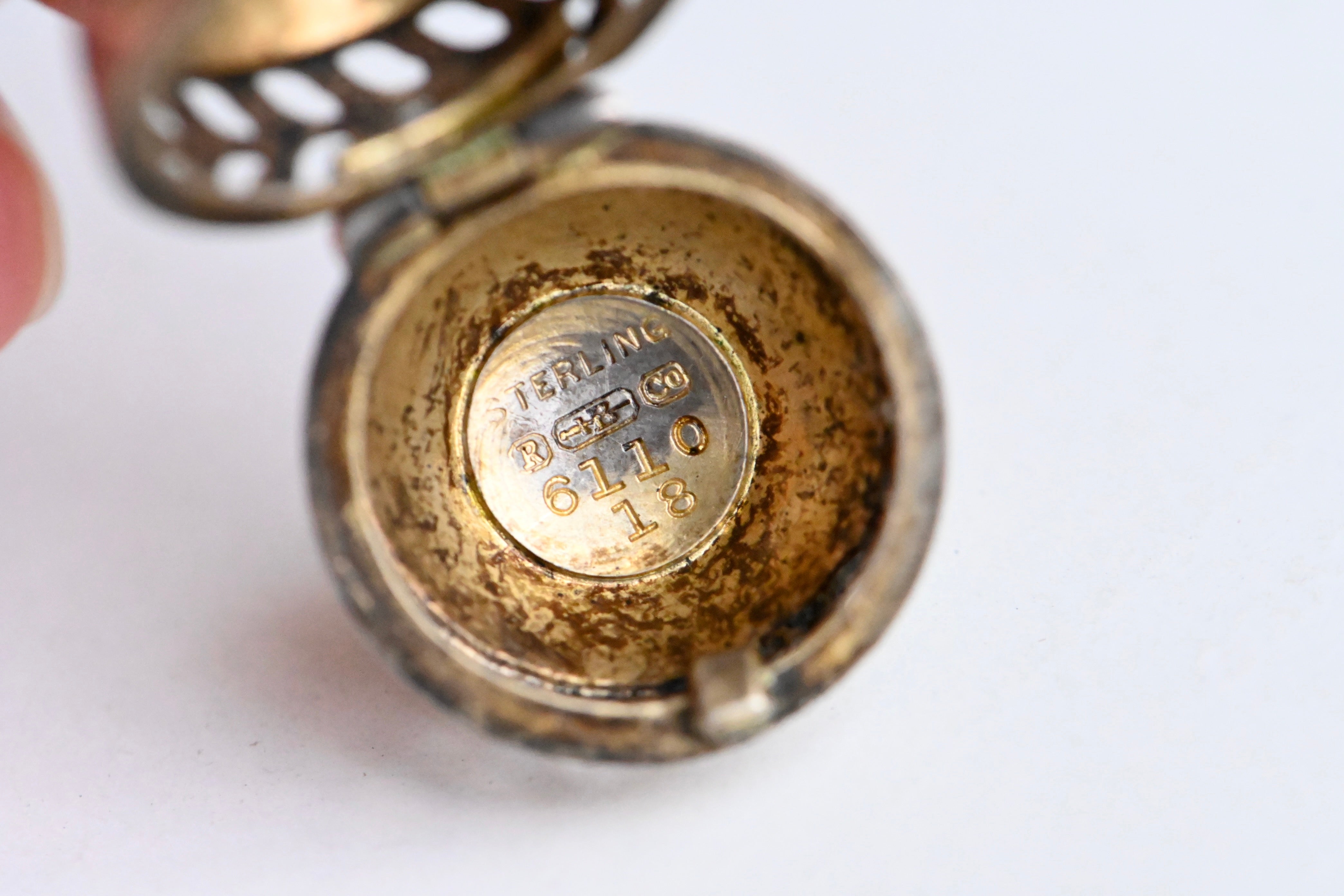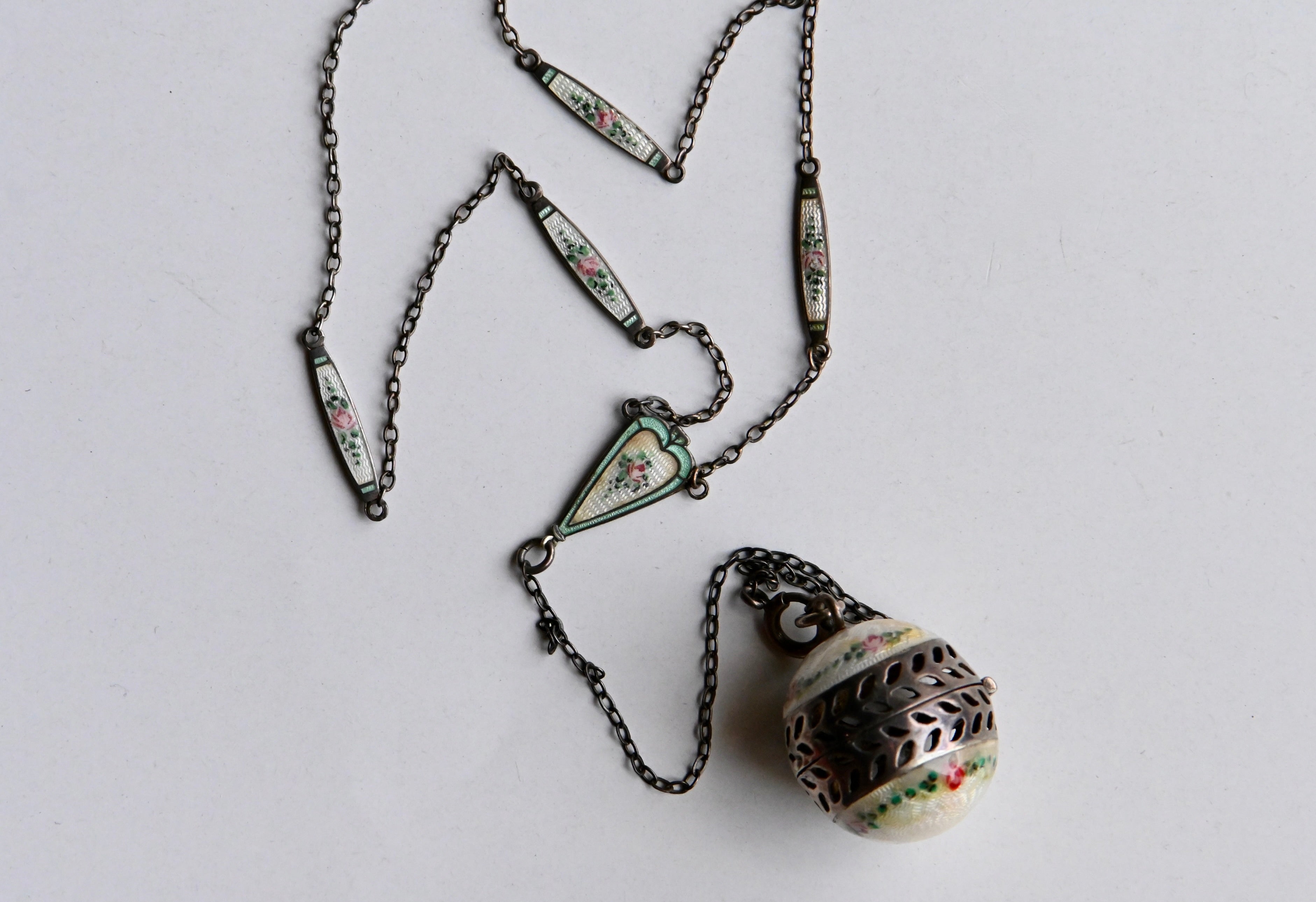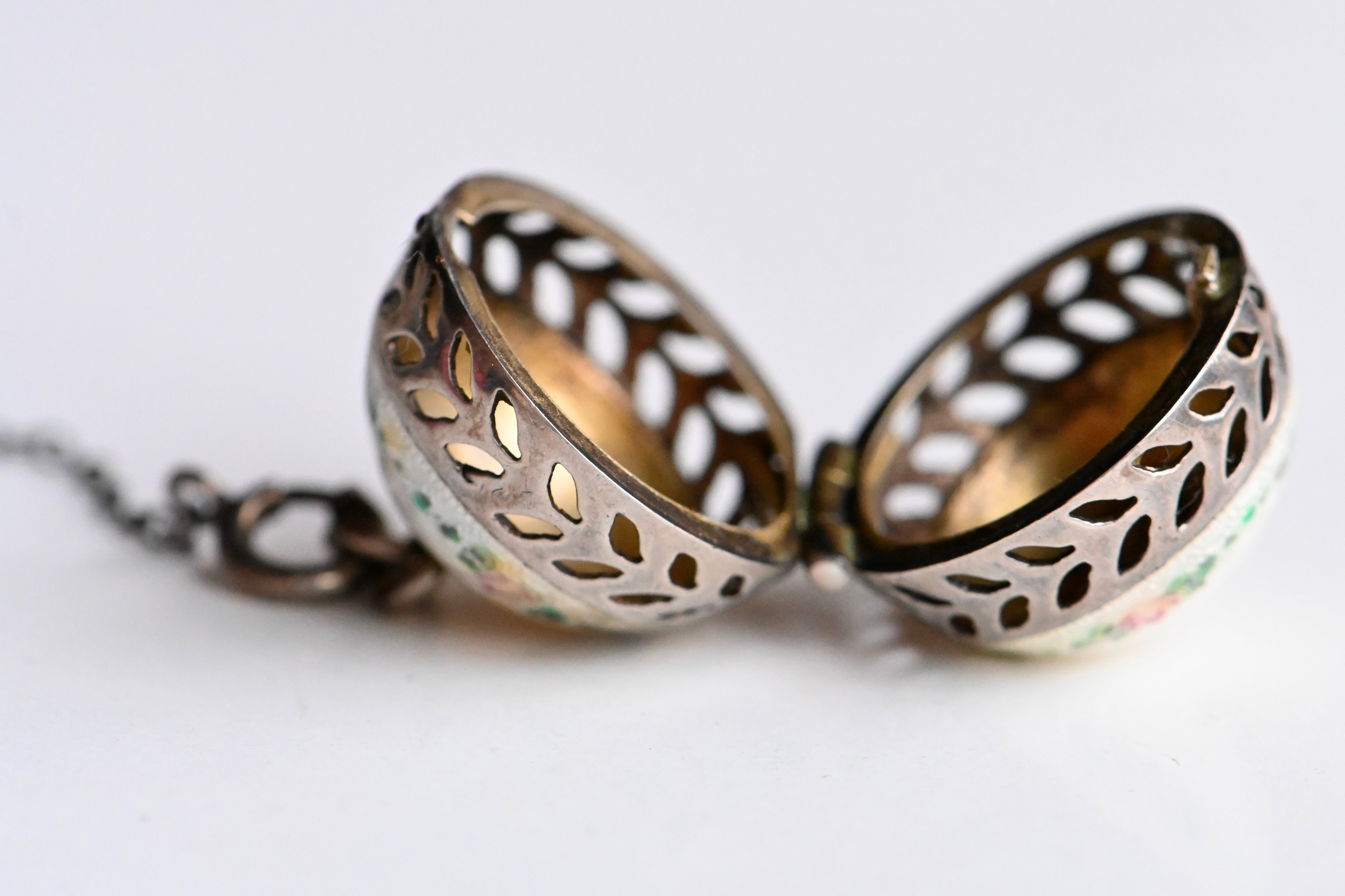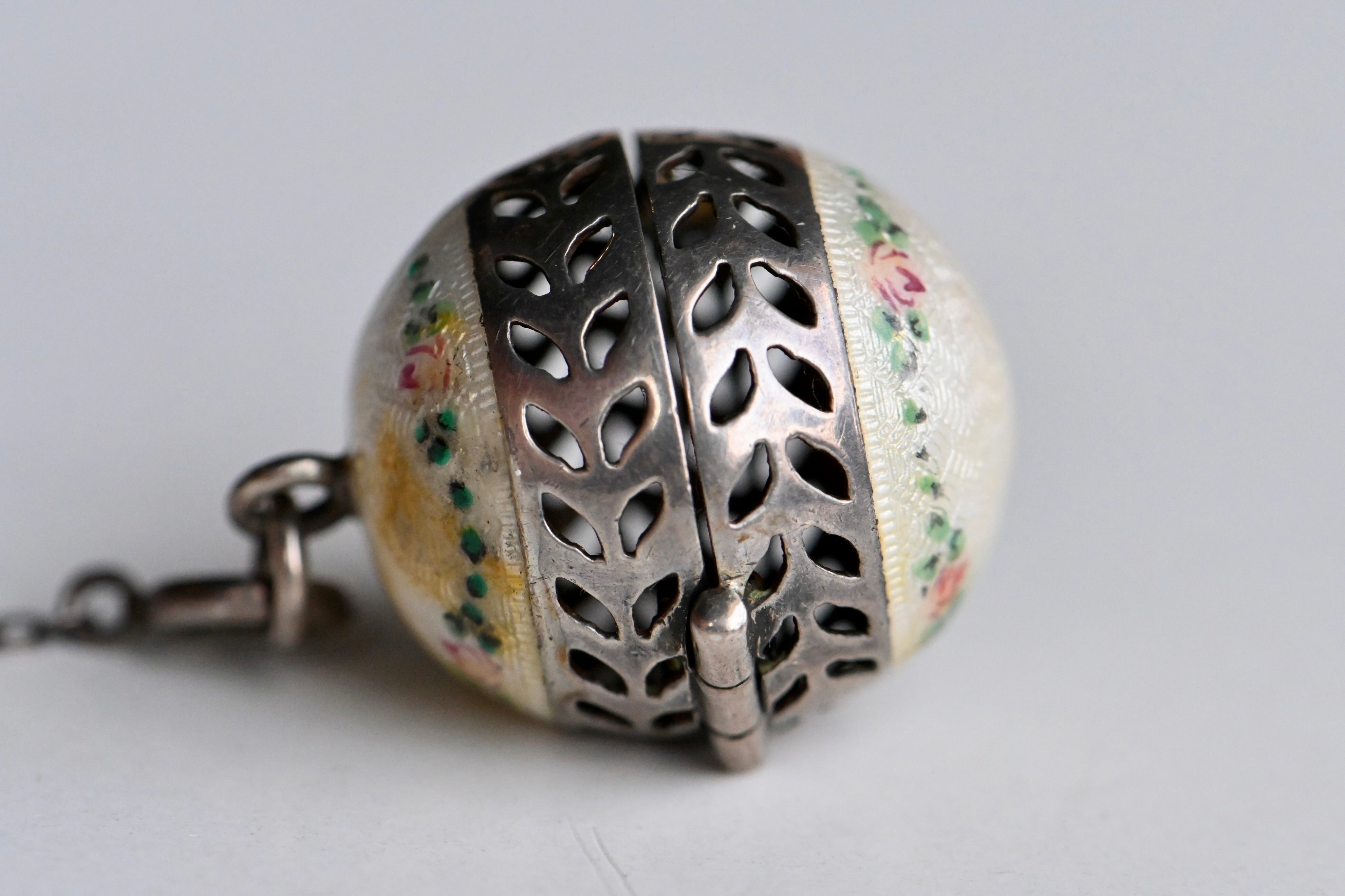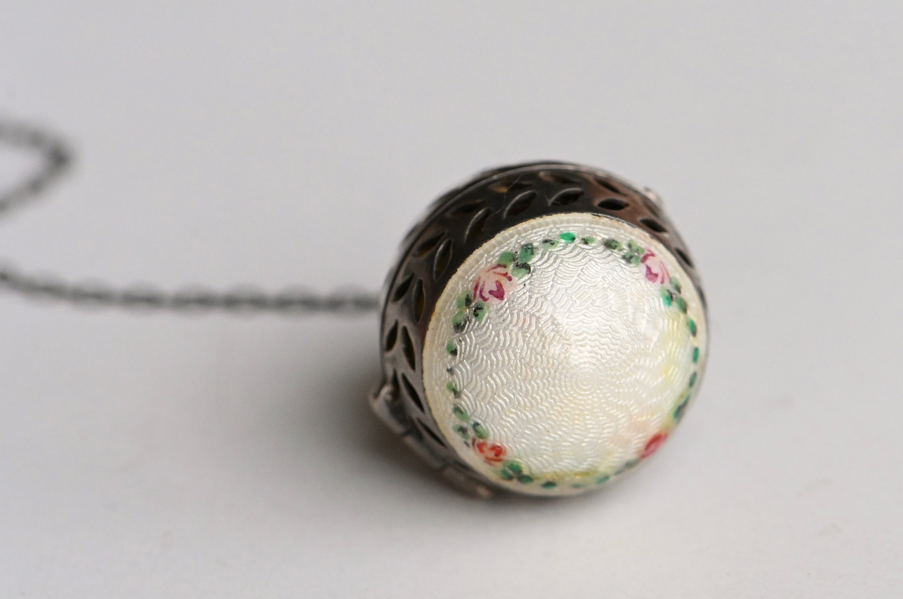 An antique vinaigrette-style orb locket with enamel details and the original "Y" chain. The piece is marked for R. Blackinton & Co., a company founded during the Civil War in Attleboro, MA. This piece dates to the early 20th century, when the company was expanding their production to include novelty pieces, tableware, and vanity accessories. This is a perfume locket, or vinaigrette, made in sterling silver with vermeil finish inside and guilloché enamel details. The enamel is white with hand painted blossom and leaf details. The "Y" chain has enameled stations to match the locket - six bar-shaped and one heart shaped where the chain drops to the pendant.
