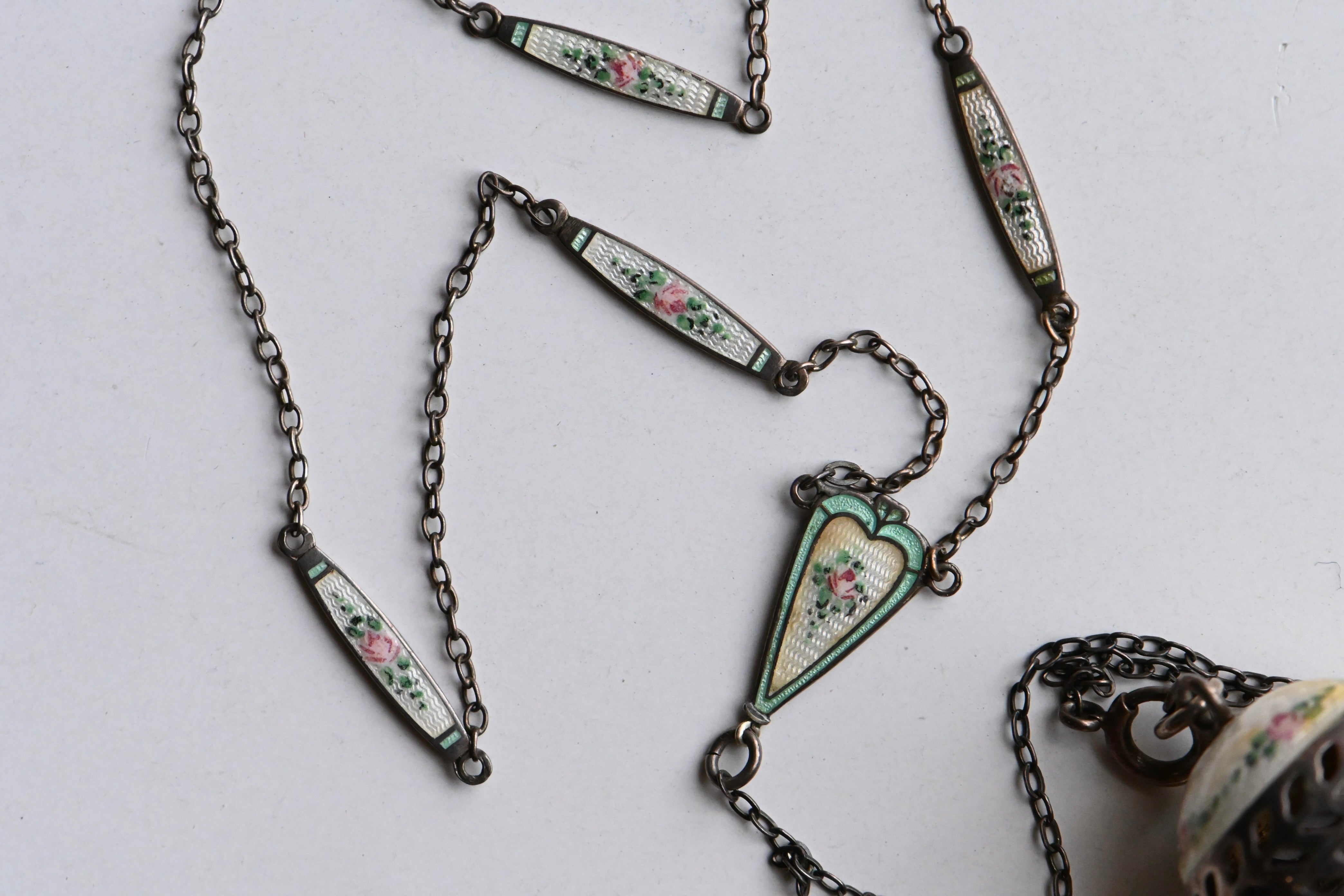 Antique sterling silver guilloché enamel vinaigrette pendant and "Y" chain