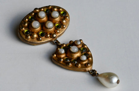 A rare and opulent piece from French designer Henry Perichon (1910-1971), who worked in Lyon making bespoke pieces for the Comédie Française, French cinema, Hollywood and private clients. The piece is a three-part brooch that may also be worn as a pendant: an upper (oval), a center (shield) and a faux pearl teardrop at the bottom. Perichon's work reminds me of some of the "Golden Age" pieces of Joseff of Hollywood here in the U.S. - statement "costume" pieces, often historically inspired and flawless in design. Perichon was inspired by the jewelry of the Renaissance and Baroque periods and favored materials like brass, glass, and other modest materials. This piece is gilt brass with granular details, peridot colored rhinestones and faux glass pearls. The painted nacre on the pearls has faded, leaving them a milky-white color. Overall condition is still lovely and the piece is a delight to wear. French trombone clasp. Comes with a 24" gold fill rope chain.