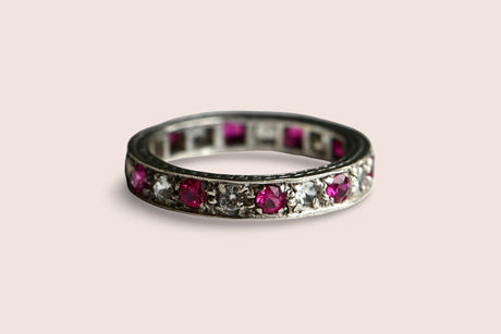 A beautiful Art Deco eternity ring in 9 CT with alternating round ruby and clear pastes and hand engraved sides. Vibrant pink stones with à jour backs. Excellent condition. English in origin.