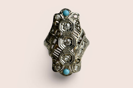 Antique 1920s Art Deco 18K diamond and turquoise filigree cocktail ring