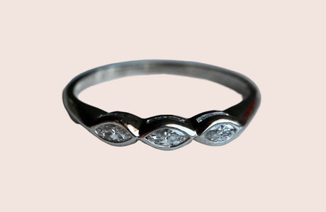 A 14K ring with three horizontal-set marquise diamonds and a sweet inscription penned on the inside. The bezel setting follows the contours of the diamonds and protects them from chipping or snagging on clothes. This would make a lovely wedding or anniversary band or simply a shapely, sparkly addition to a ring stack. Excellent condition.
