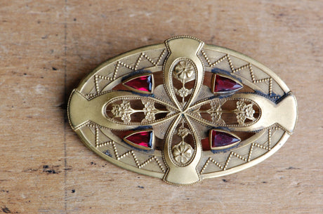 A ca. 1910s gilt brooch in oval shape with openwork, glass accents, and crisp floral details. This piece may originally have been a sash ornament, worn at the waist or somewhere on the bodice. It would be beautiful worn similarly, or on a lapel, scarf, beret, etc. The brooch is large but light, with four arrow-shaped, ruby-grapefruit colored glass stones positioned in the openwork quadrants. Little metalwork flowers - baby's breath or something small and spring-y - fill the spaces between the glass. The frame is solid with faux granular details. Bright gold, gilt finish. Pin closure. Excellent Edwardian condition!