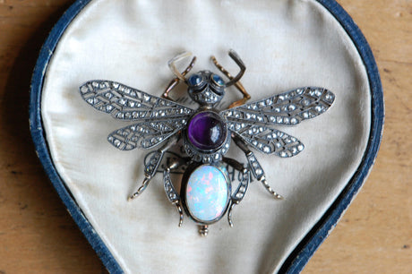The brooch is large, barely fitting in the palm of my hand, at a boastful 2" x 2 5/8". The antenna are elbowed and tipped with diamonds. The legs are incredibly articulated and even hand engraved with little hatch-mark "hairs." The head has openwork "eyebrows" and round sapphire cabochons. The thorax is a 3 carat amethyst, the abdomen a fiery, 3.2 carat natural opal. Remarkable gems and range of color across the brooch.