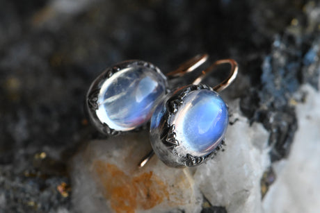 The newest in this amazing collection of wearable Georgian-style ear drops . . . MOONSTONE! These shimmering, galactic beauties appear to be lit from within with a cool, calm, glowing light. At turns crystal-white, milky blue, and dusky purple, these cabochons promise to be a daily-wear favorite. We are . . . OVER THE MOON (sorry!)