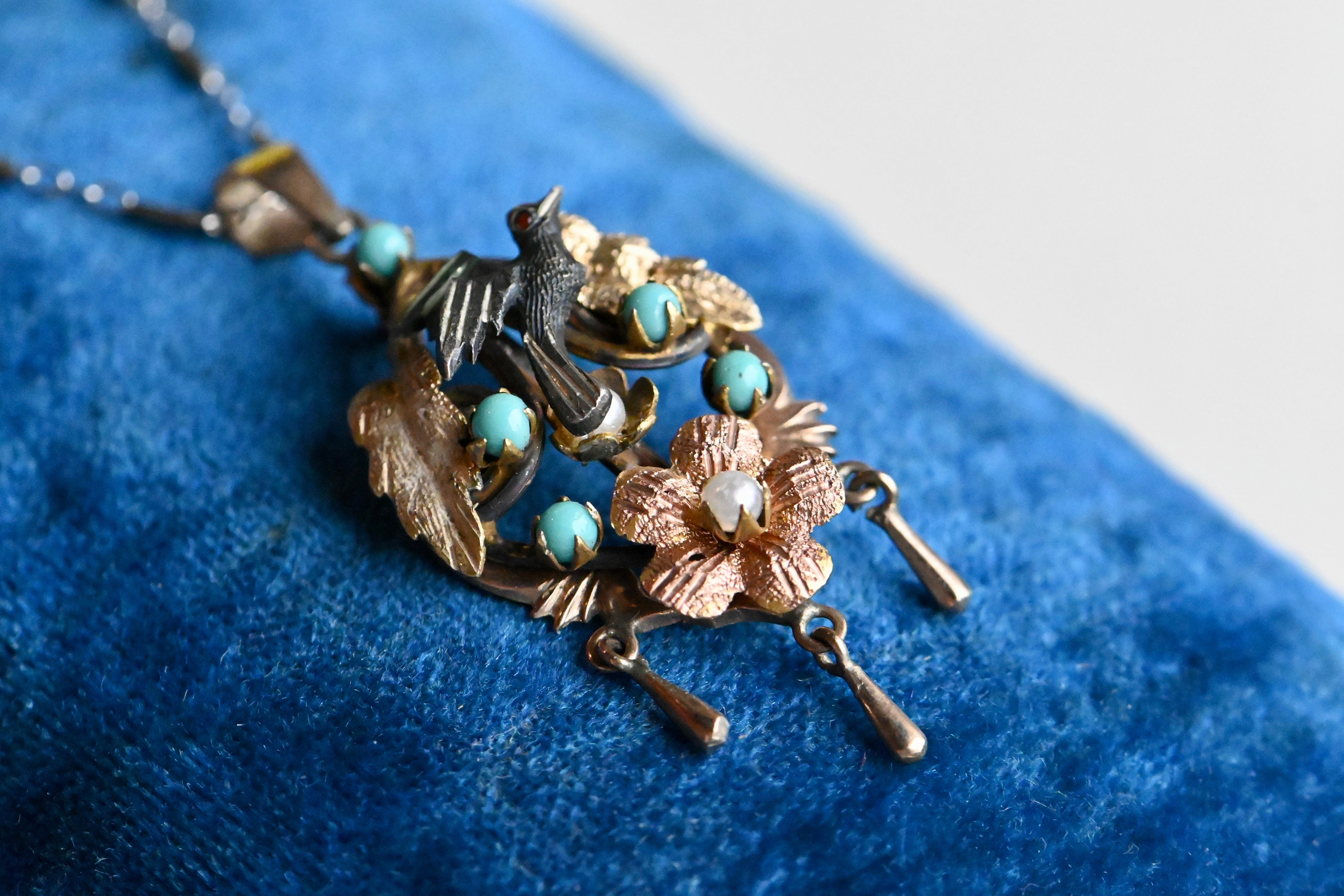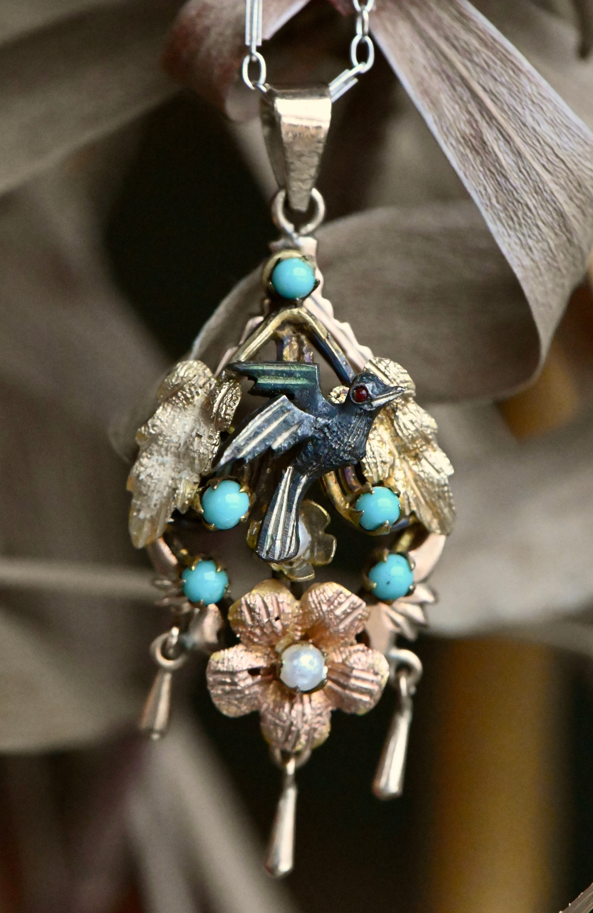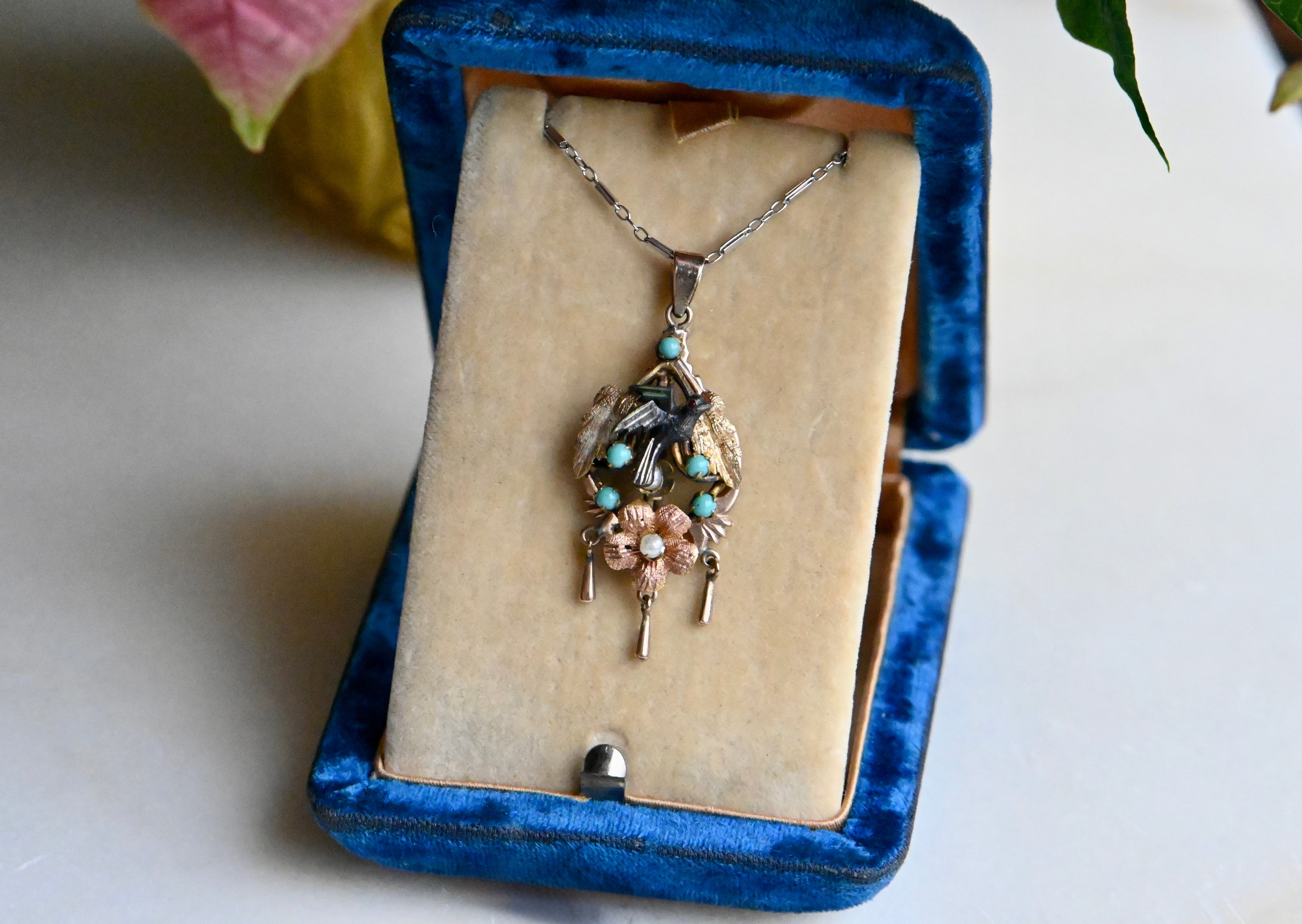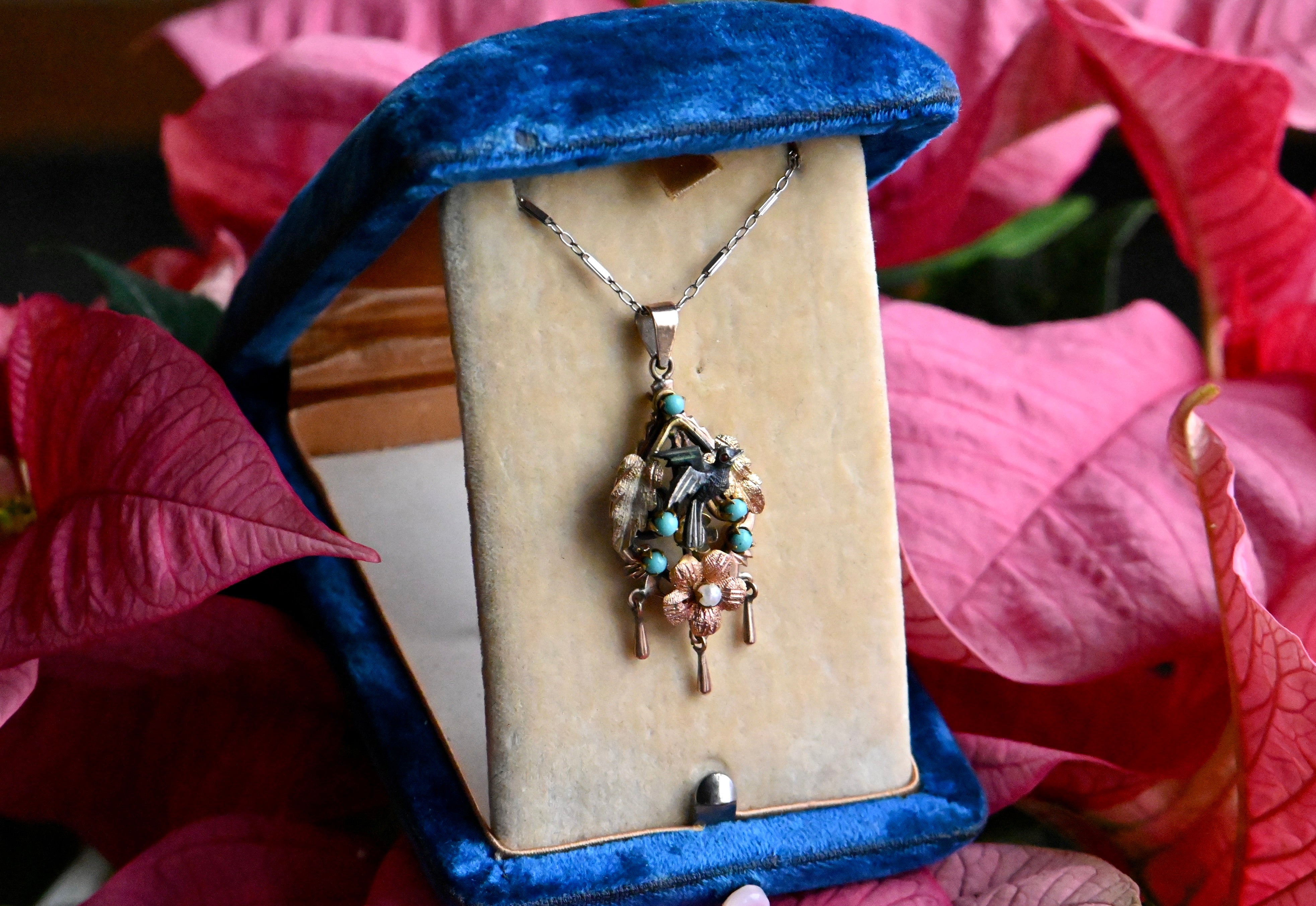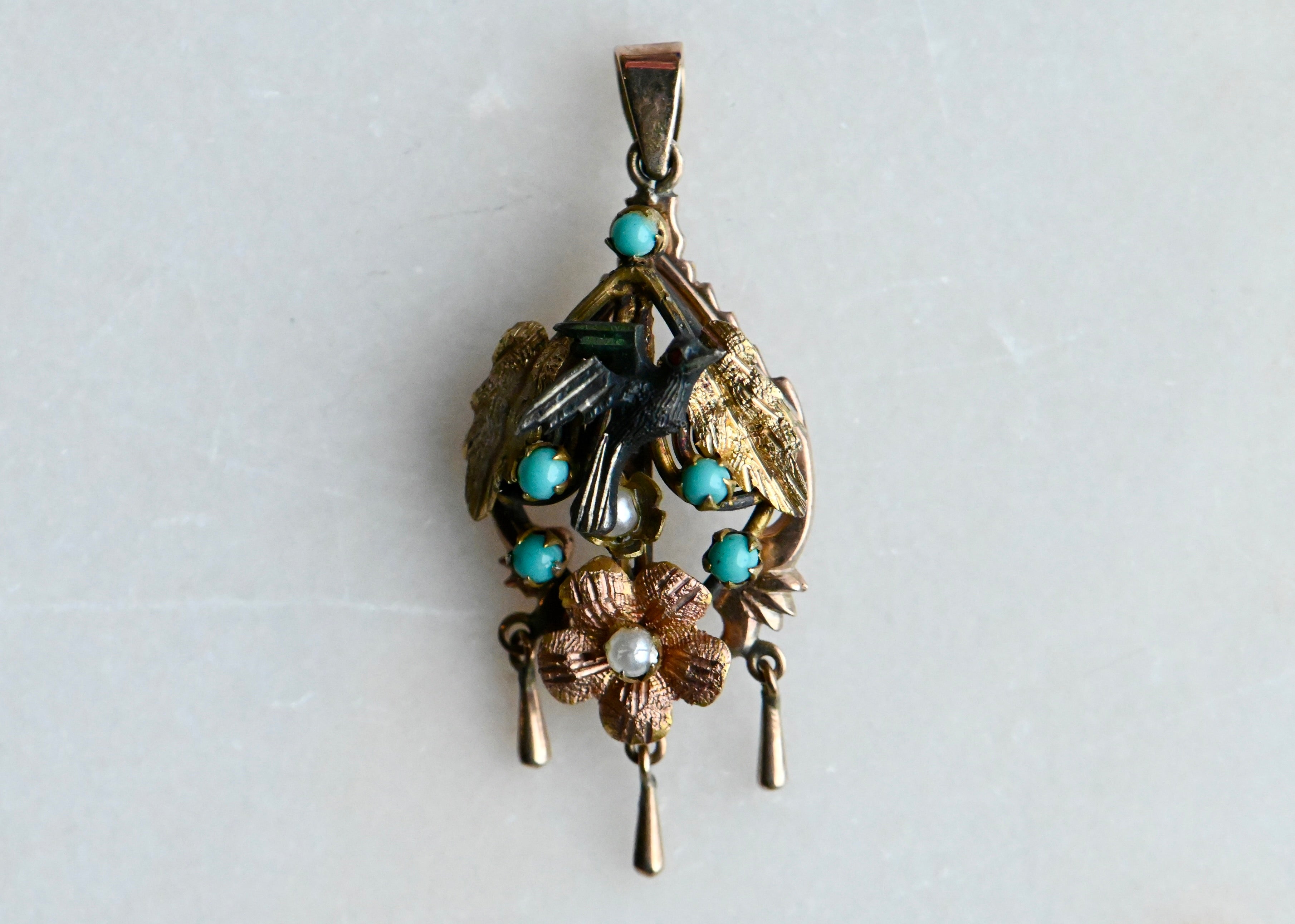 A darling pendant with a bird perched between carved gold leaves, turquoise embellishments, and a pearl-studded flower. This style of pendant - also often seen in earring pairs - was made in Mexico as well as Europe in the mid-late 19th century. In Mexico, the "Pajaritos" motif was heavily influenced by European (Colonial Era) aesthetics. The little scene shows a silver-winged bird tending its lush nest. Turquoise and pearls accent and three little drops create a fringe. Marked for 12K gold, which was used briefly from the late 1800s-1930s. Two tone yellow and rose gold with an oxidized silver bird. Beautiful dimensions! Comes with a 14K white gold chain.