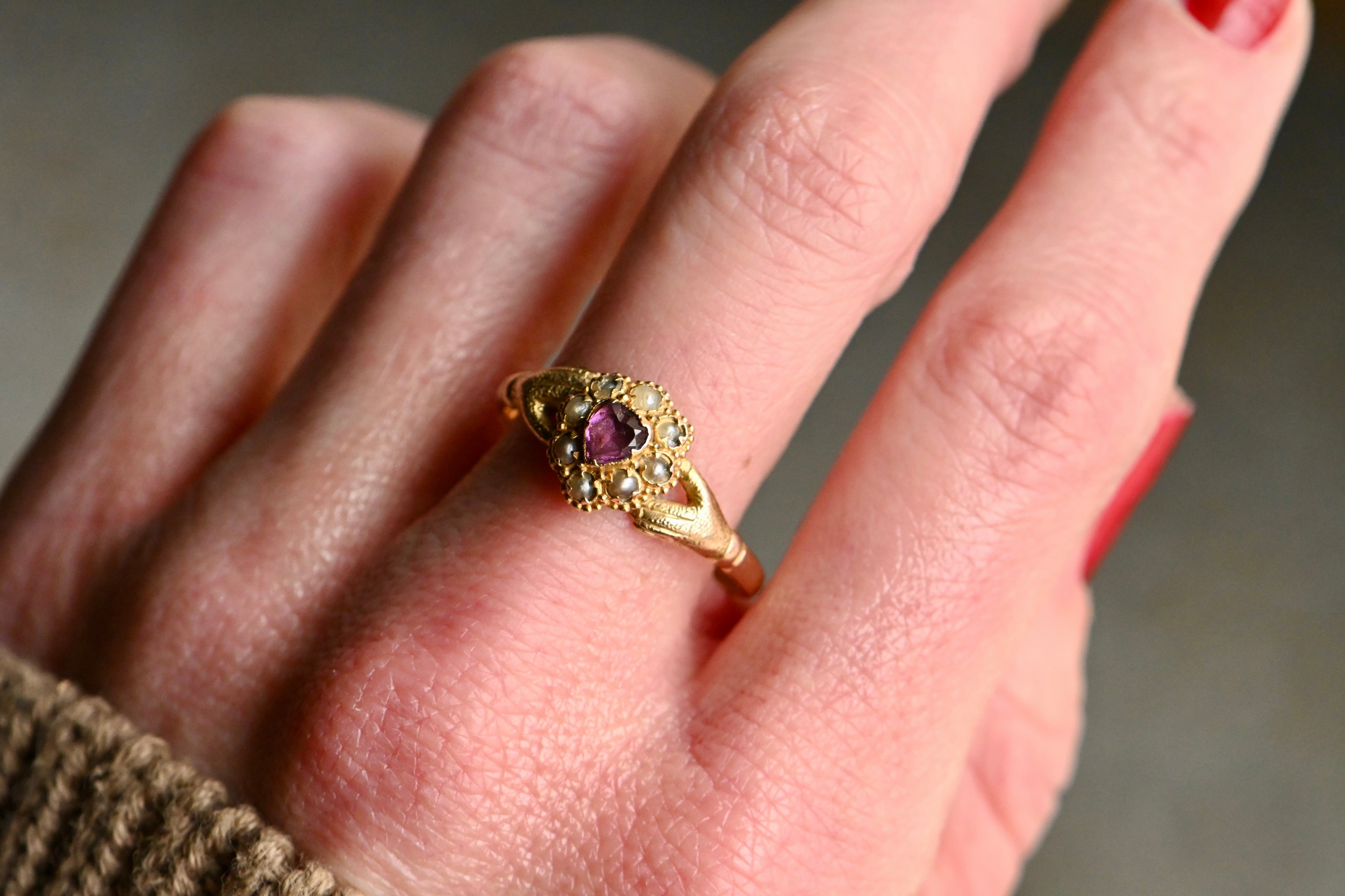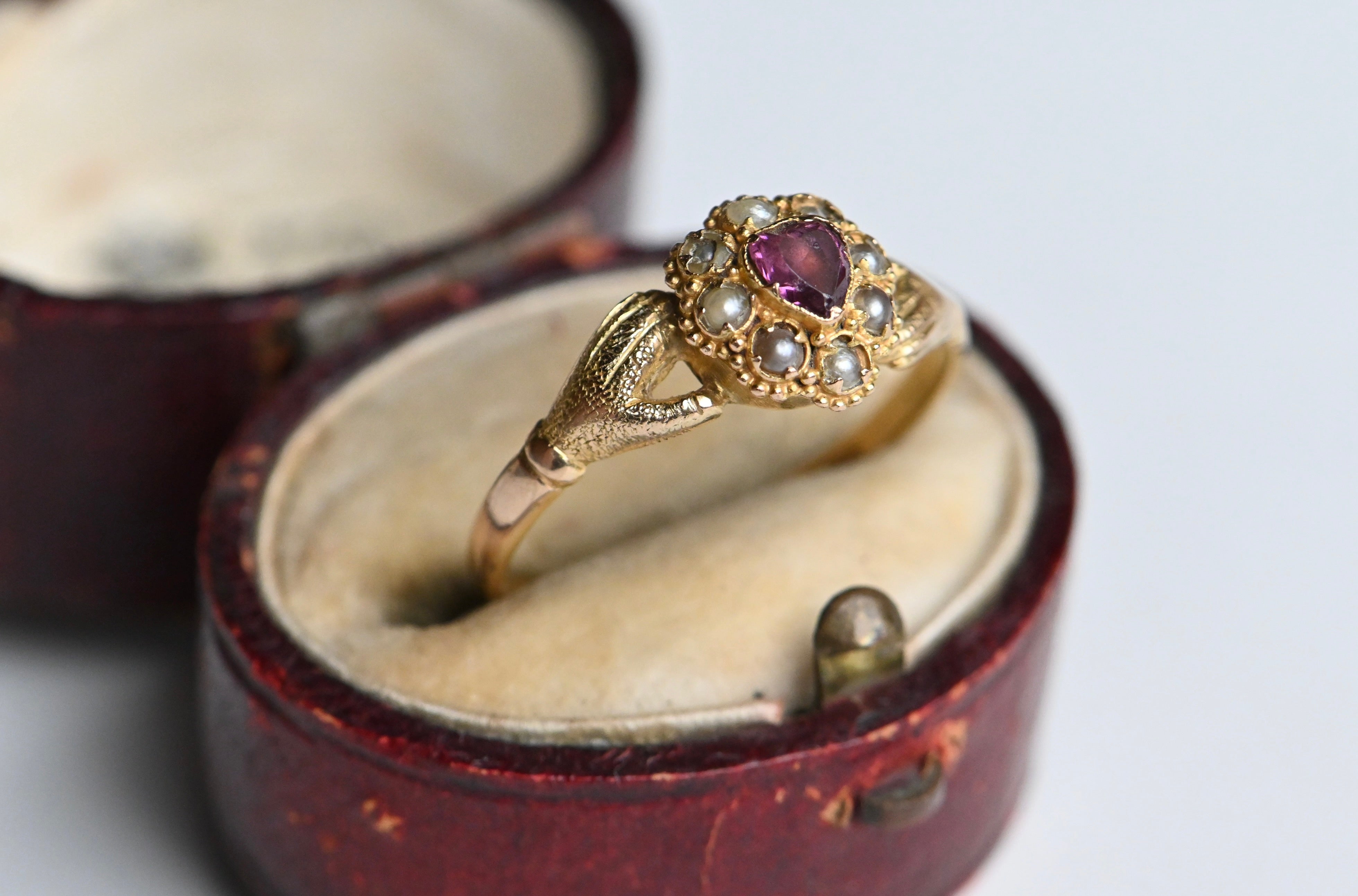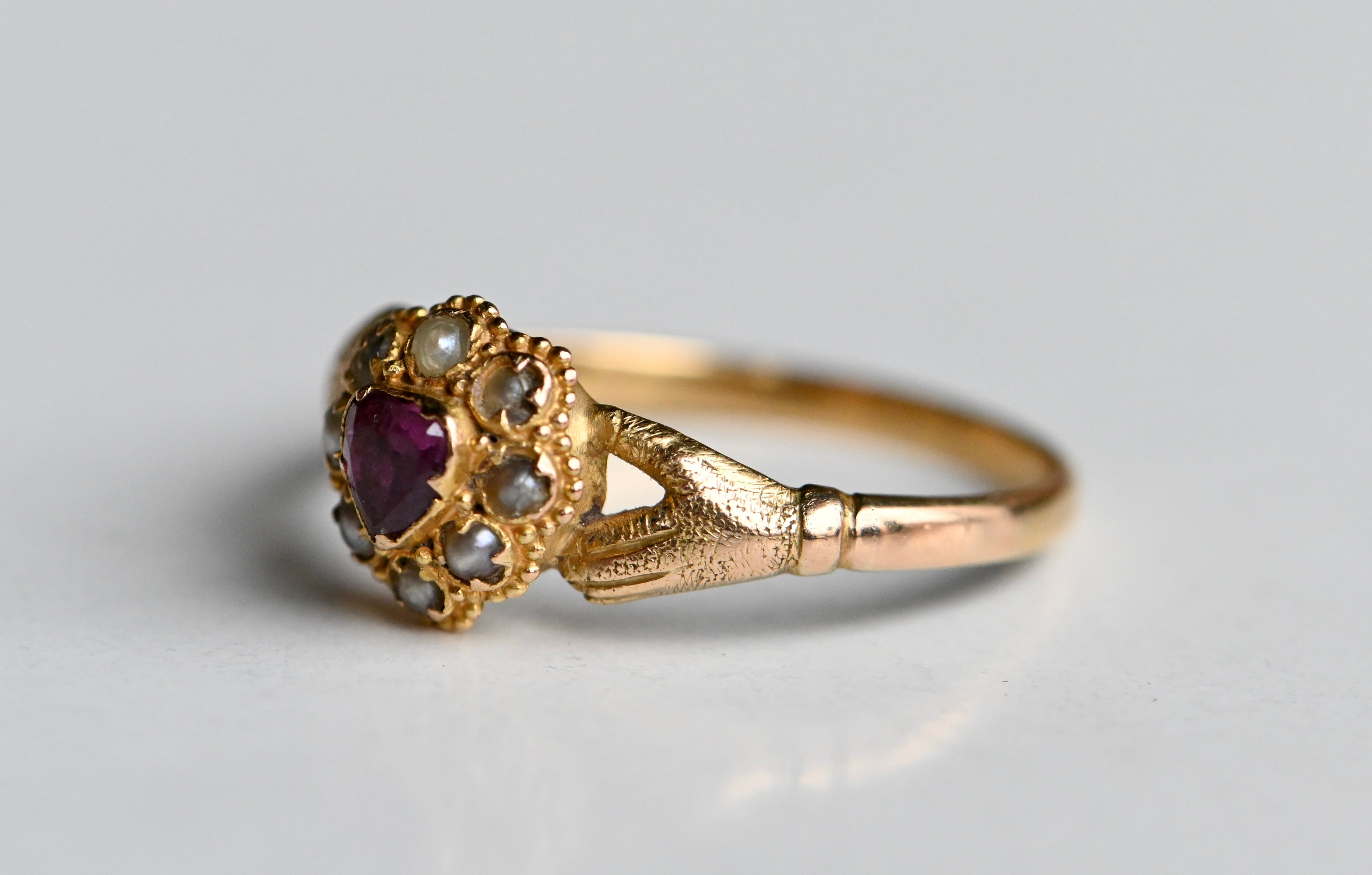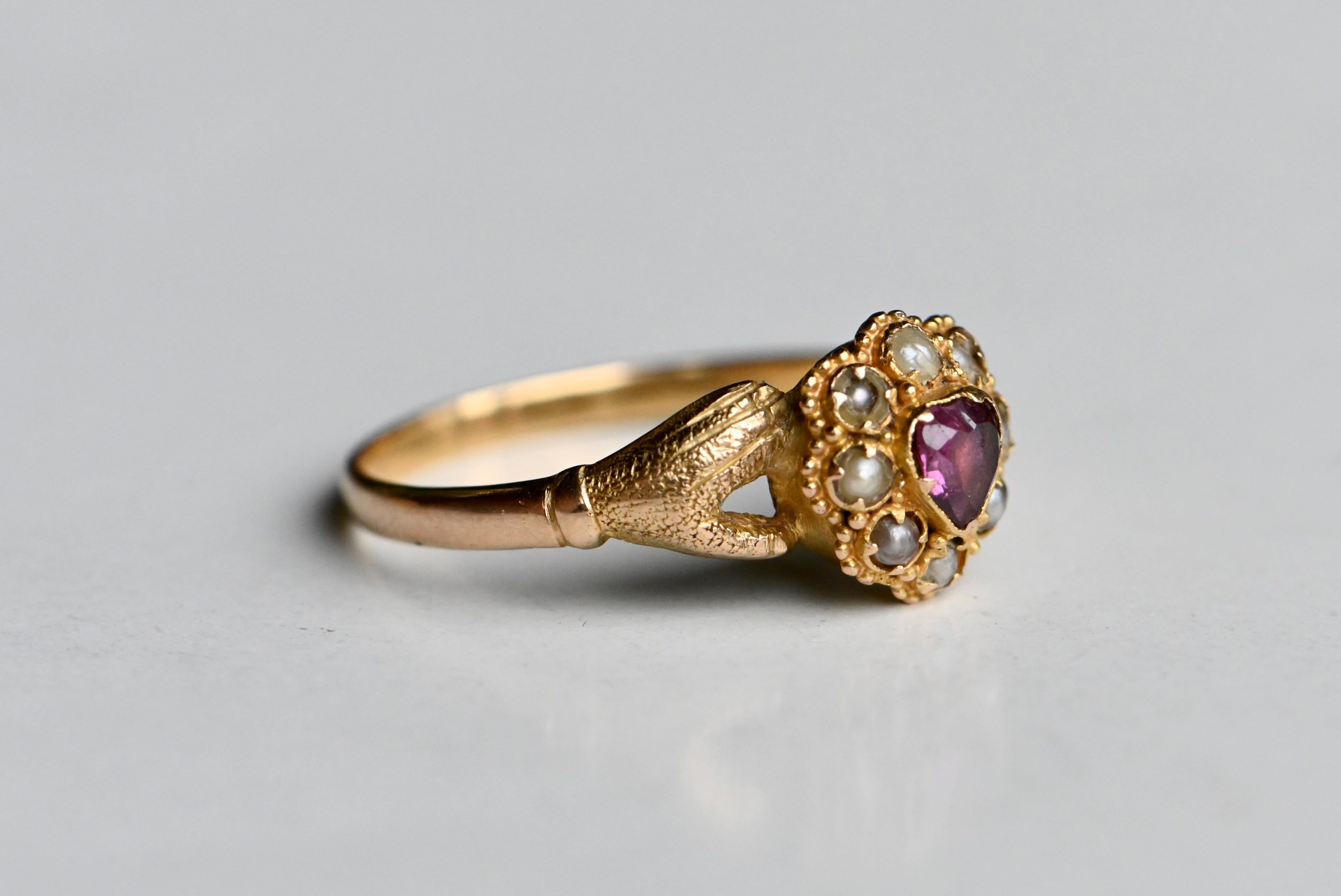 A mid-Victorian gold gimmel ring with hands that clasp tenderly and assuredly around a pearl-trimmed ruby heart. The heart is marvelous: a purple ruby corrundum with violet tones. The ruby is original to the ring and set with a closed - and likely foiled - back. The ruby is framed with eight seed pearls in various states of wear, also all original to the ring. I considered replacing some of the pearls, but decided against it. I leave it up to you! The mounting is a 15 CT blend of yellow and rose gold, with rose gold coming through more obviously on the shank. The hands are textured and nicely articulated. This was originally a compartment ring, with a little crystal-lidded compartment on the underside of the face. The crystal and the contents are now absent, but the compartment remains.