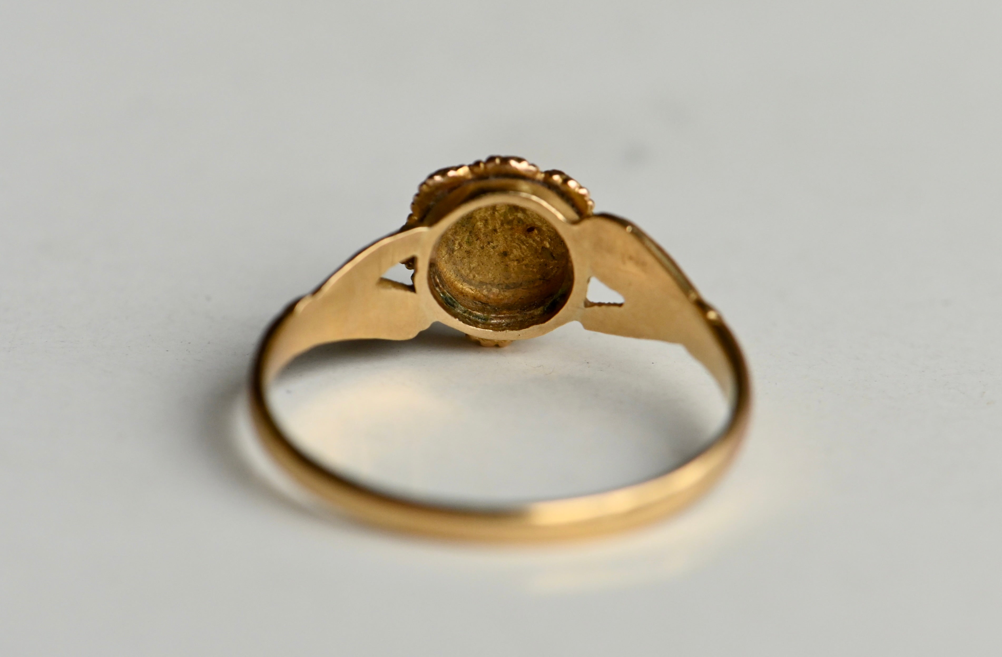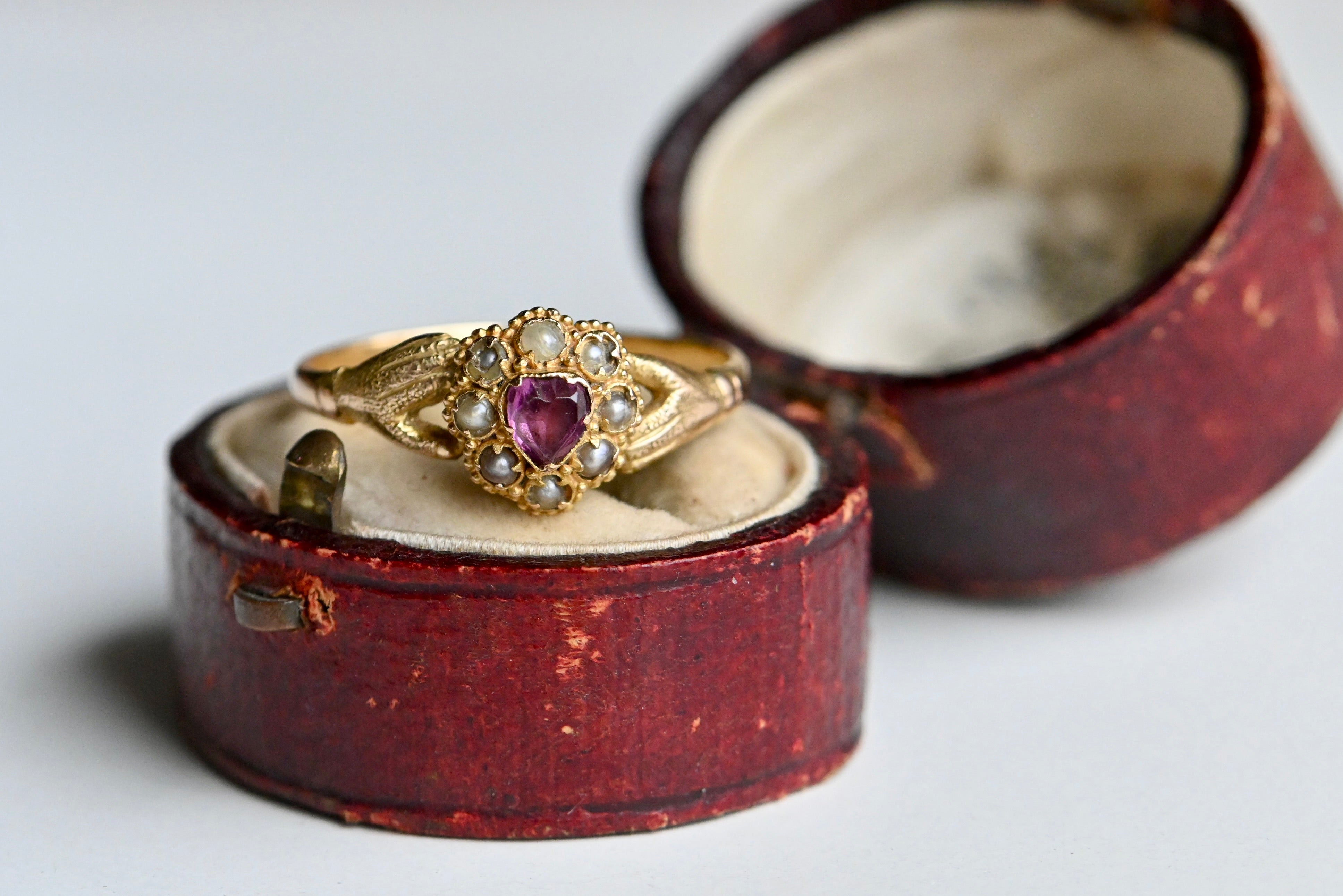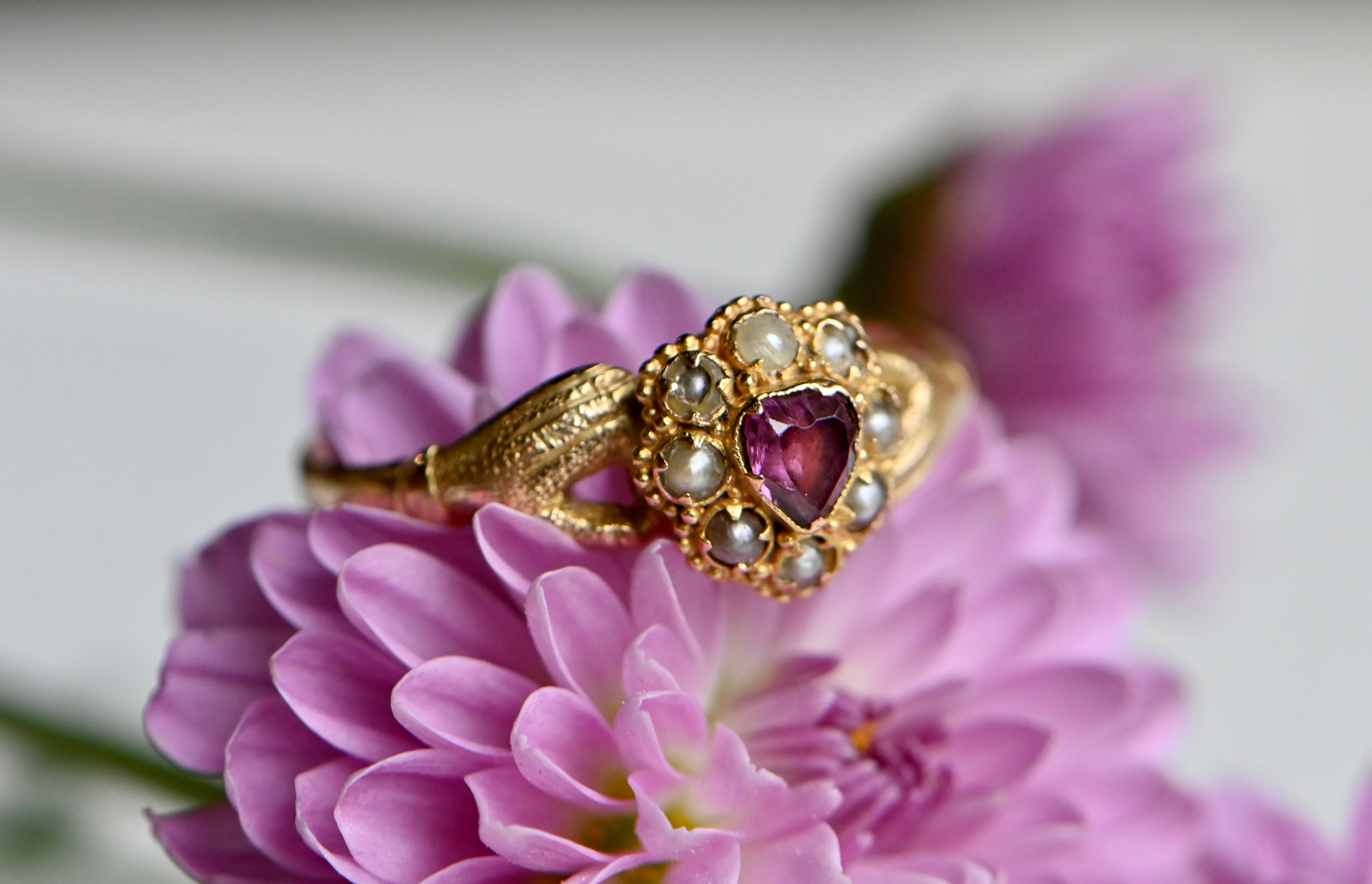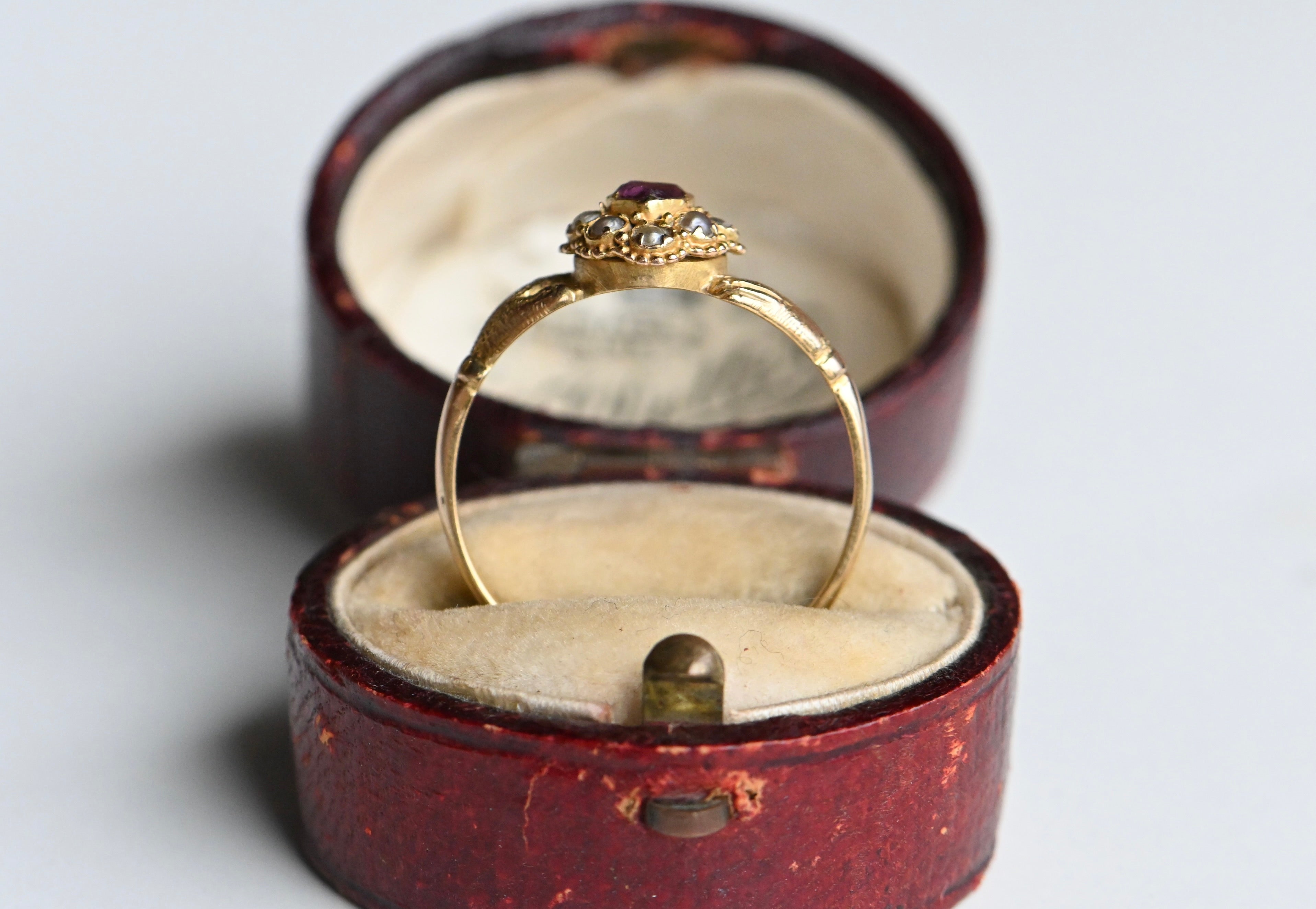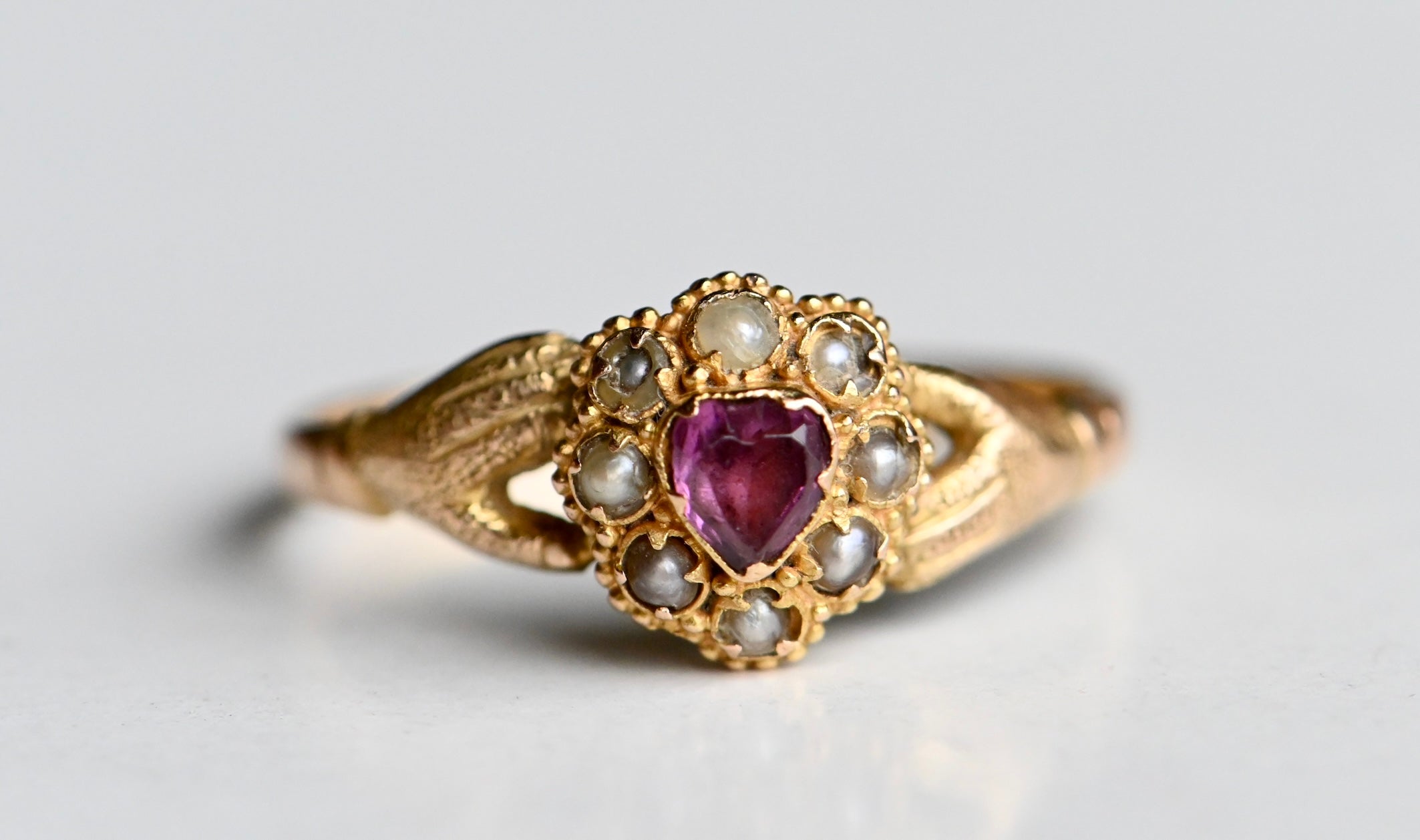 A mid-Victorian gold gimmel ring with hands that clasp tenderly and assuredly around a pearl-trimmed ruby heart. The heart is marvelous: a purple ruby corrundum with violet tones. The ruby is original to the ring and set with a closed - and likely foiled - back. The ruby is framed with eight seed pearls in various states of wear, also all original to the ring. I considered replacing some of the pearls, but decided against it. I leave it up to you! The mounting is a 15 CT blend of yellow and rose gold, with rose gold coming through more obviously on the shank. The hands are textured and nicely articulated. This was originally a compartment ring, with a little crystal-lidded compartment on the underside of the face. The crystal and the contents are now absent, but the compartment remains.