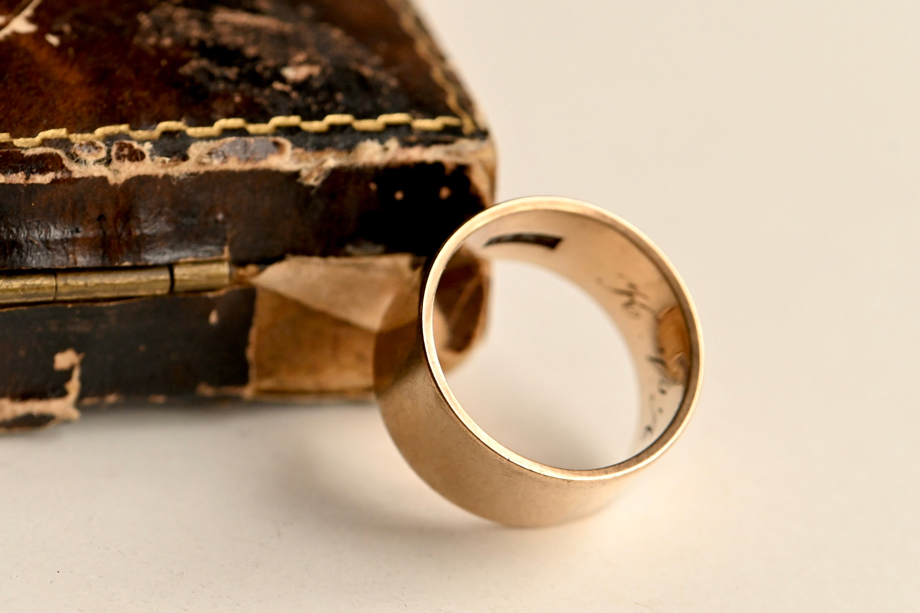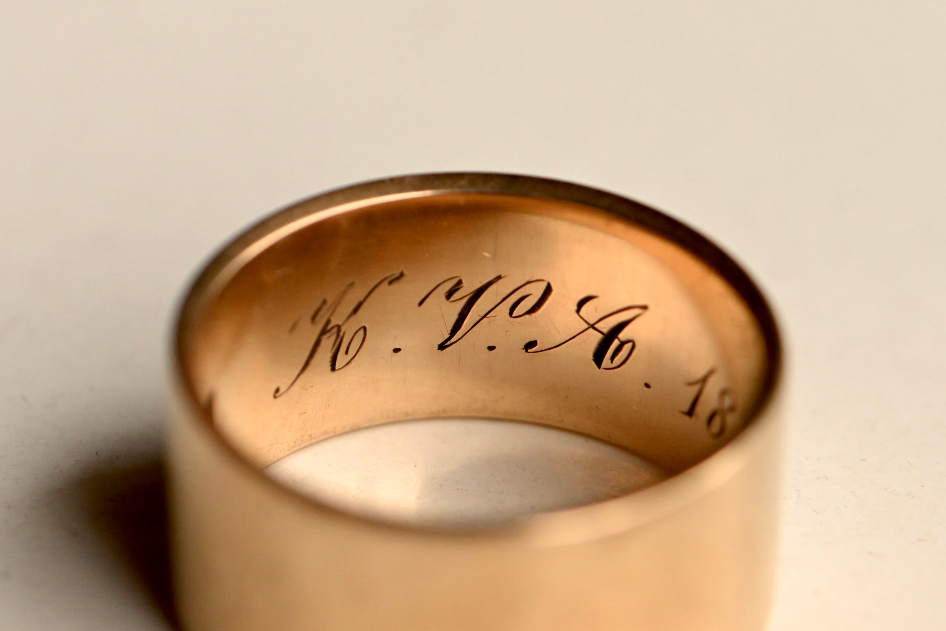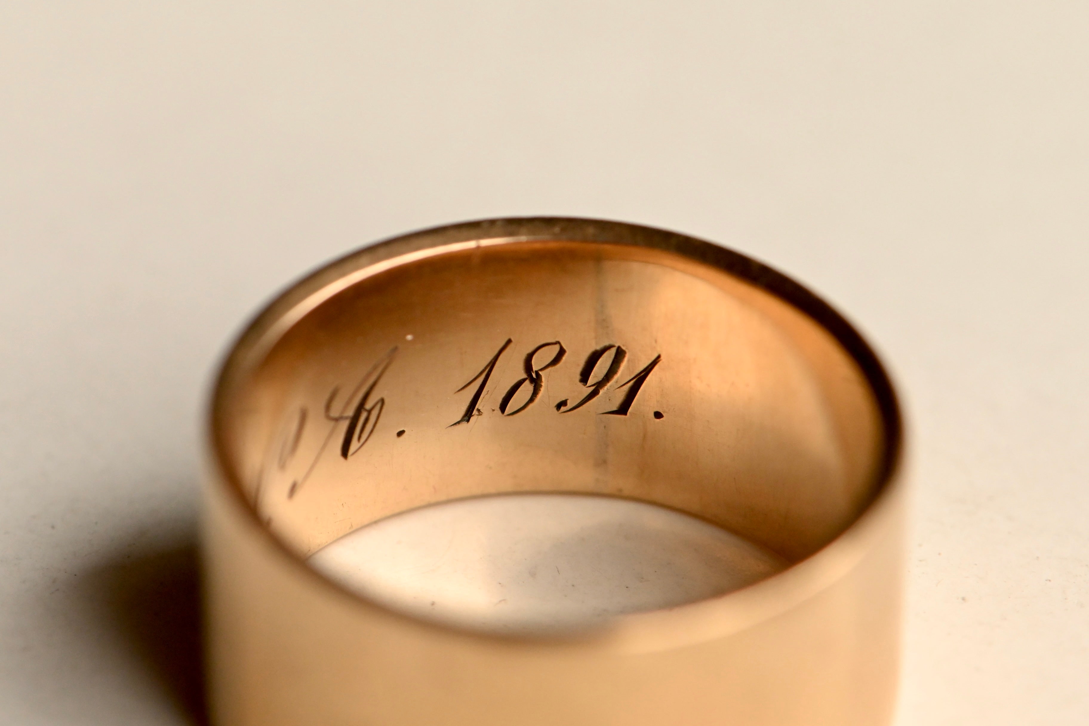 A marvelous wedding band engraved for the year 1891 and hallmarked for J.R. Wood & Sons of NY, NY. The J.R. Wood and Sons Company started making jewelry in the 1850s and by the 1890s they were pioneering "seamless" soldered bands and rings, like this one. Flat edged and uniform in with (9.2 mm), this is a classic cigar band style ring. Engraved "K.V.A. 1891" and in superb condition for 135 years!