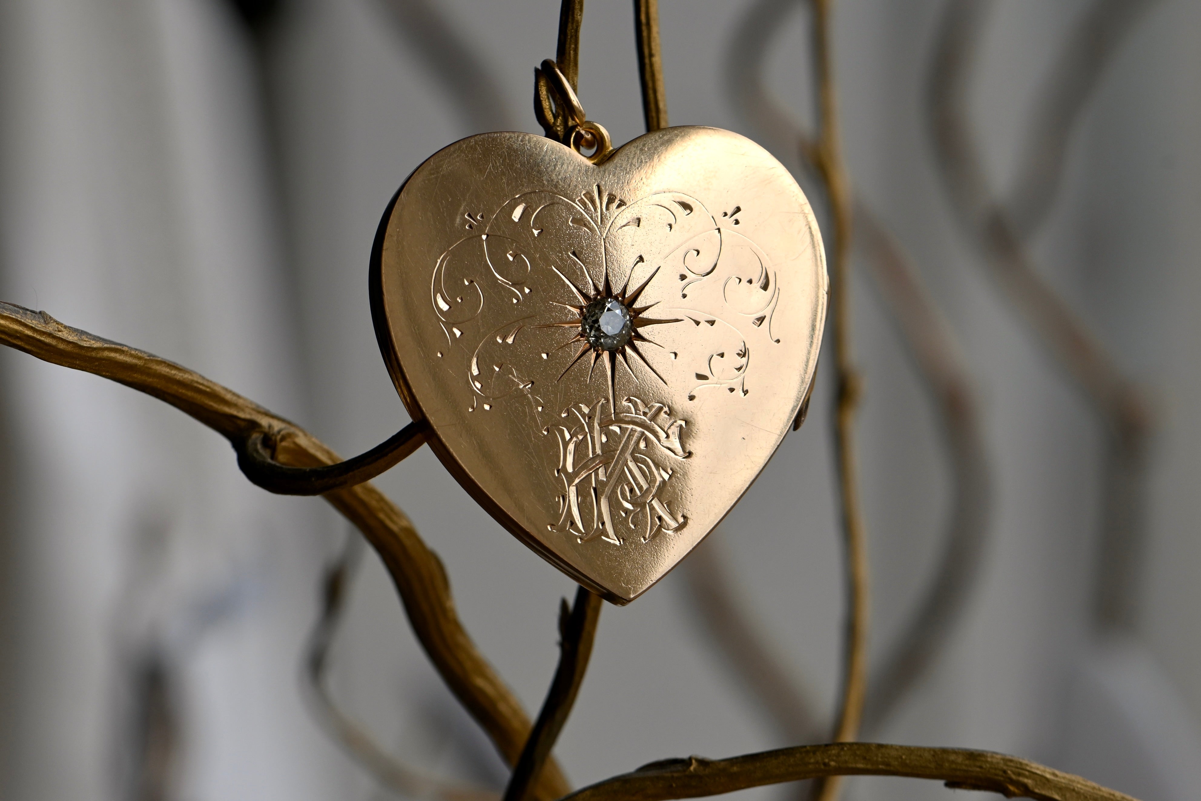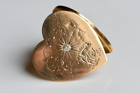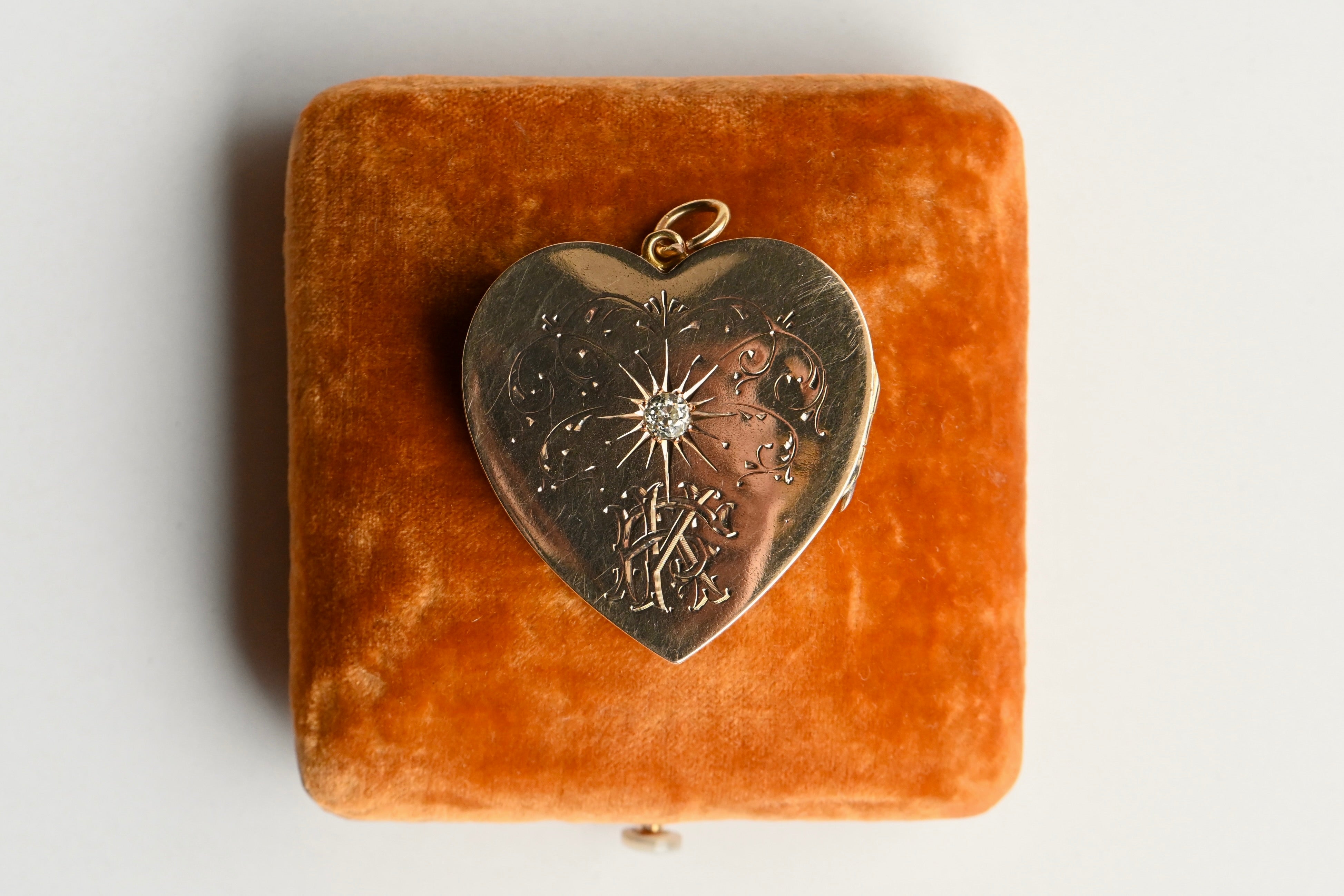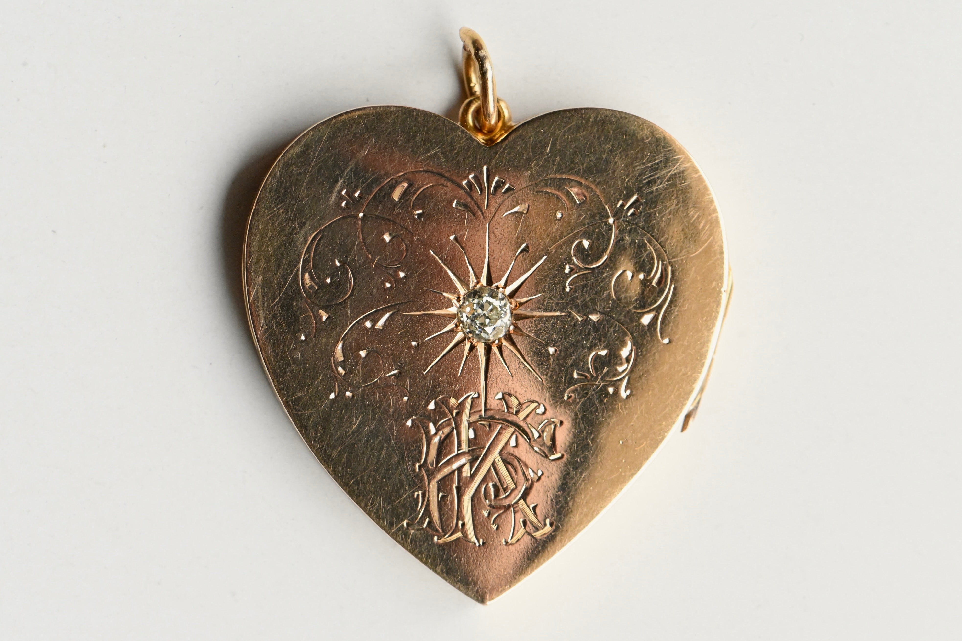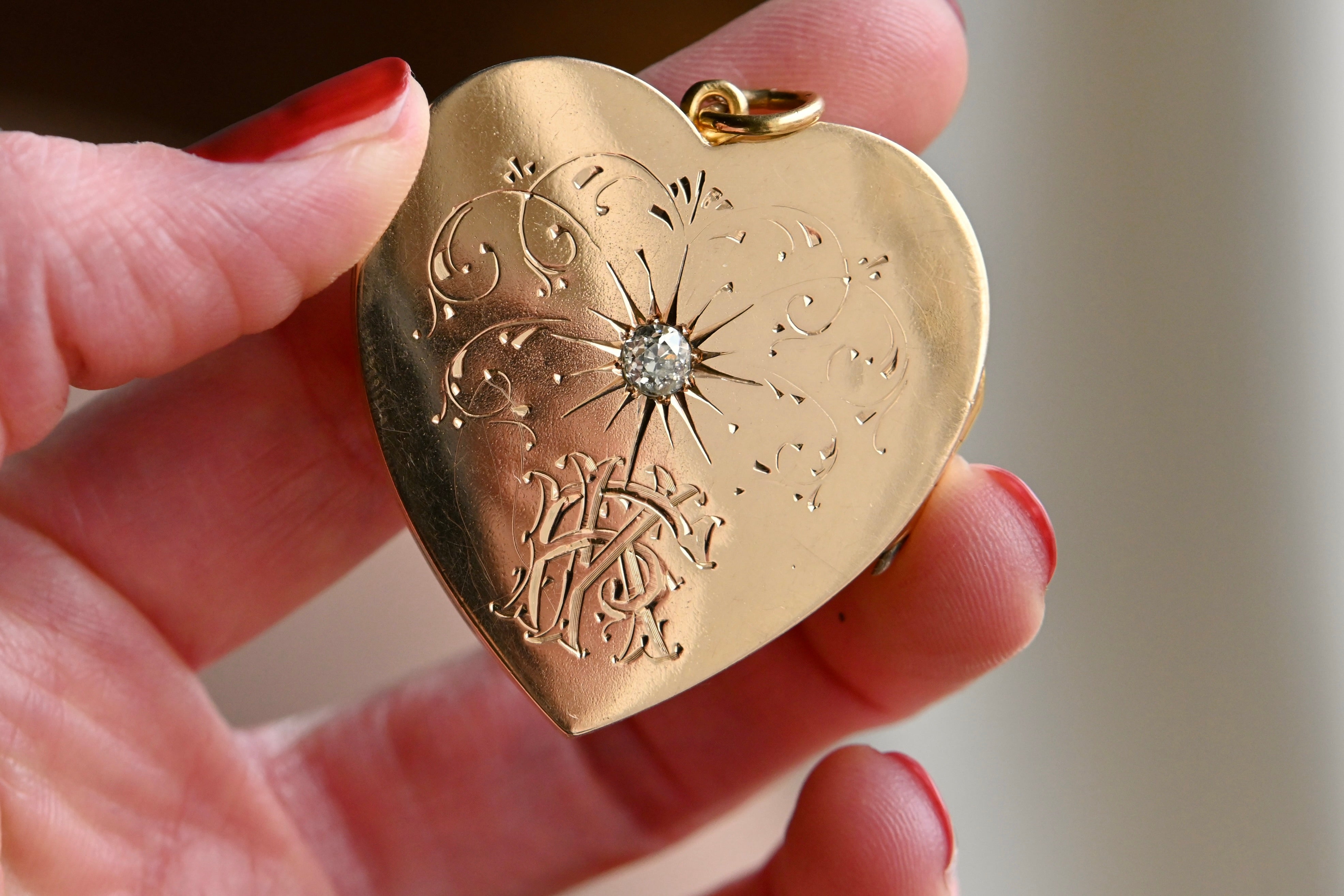 An oversized 18K heart locket with hallmarks for London in the year 1913. The locket face features a sizable (nearly .50 carat) old mine cut diamond in a starburst recess, with engraved flourishes framing and the initials "FK" or possibly "KF." The engraving is masterful as is the diamond setting. The verso is plain save the hallmarks. The locket has flat edges and a uniform width of 5mm. Closes with a secure "snap," excellent condition. A gorgeous example of an early 20th century high-karat locket.