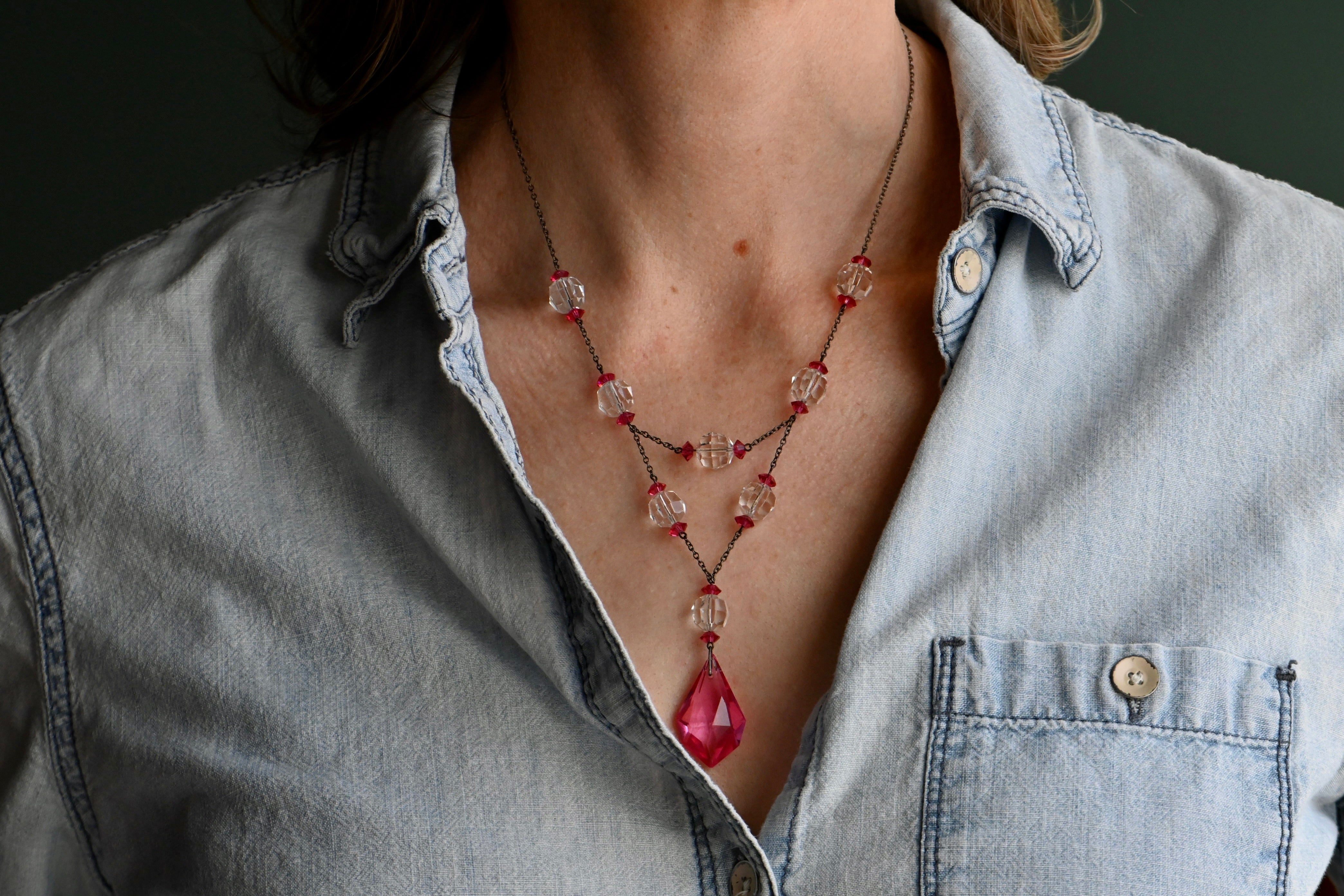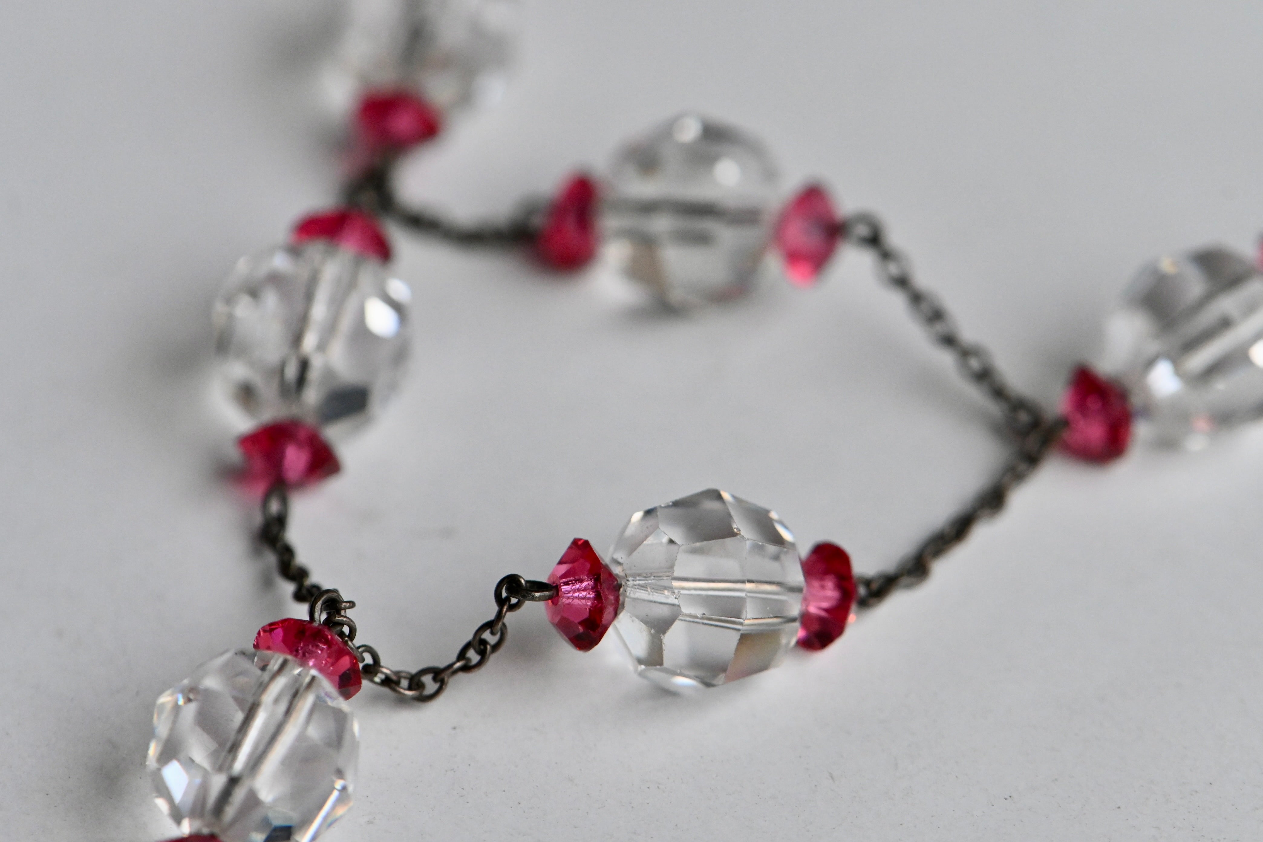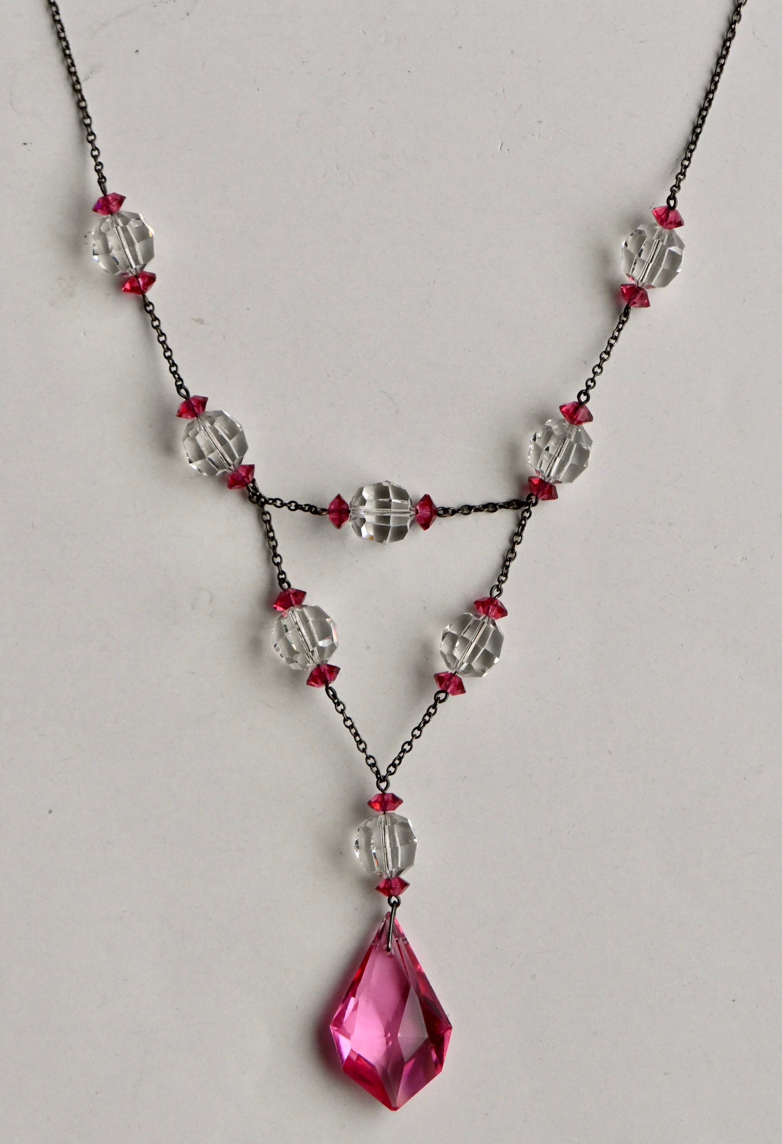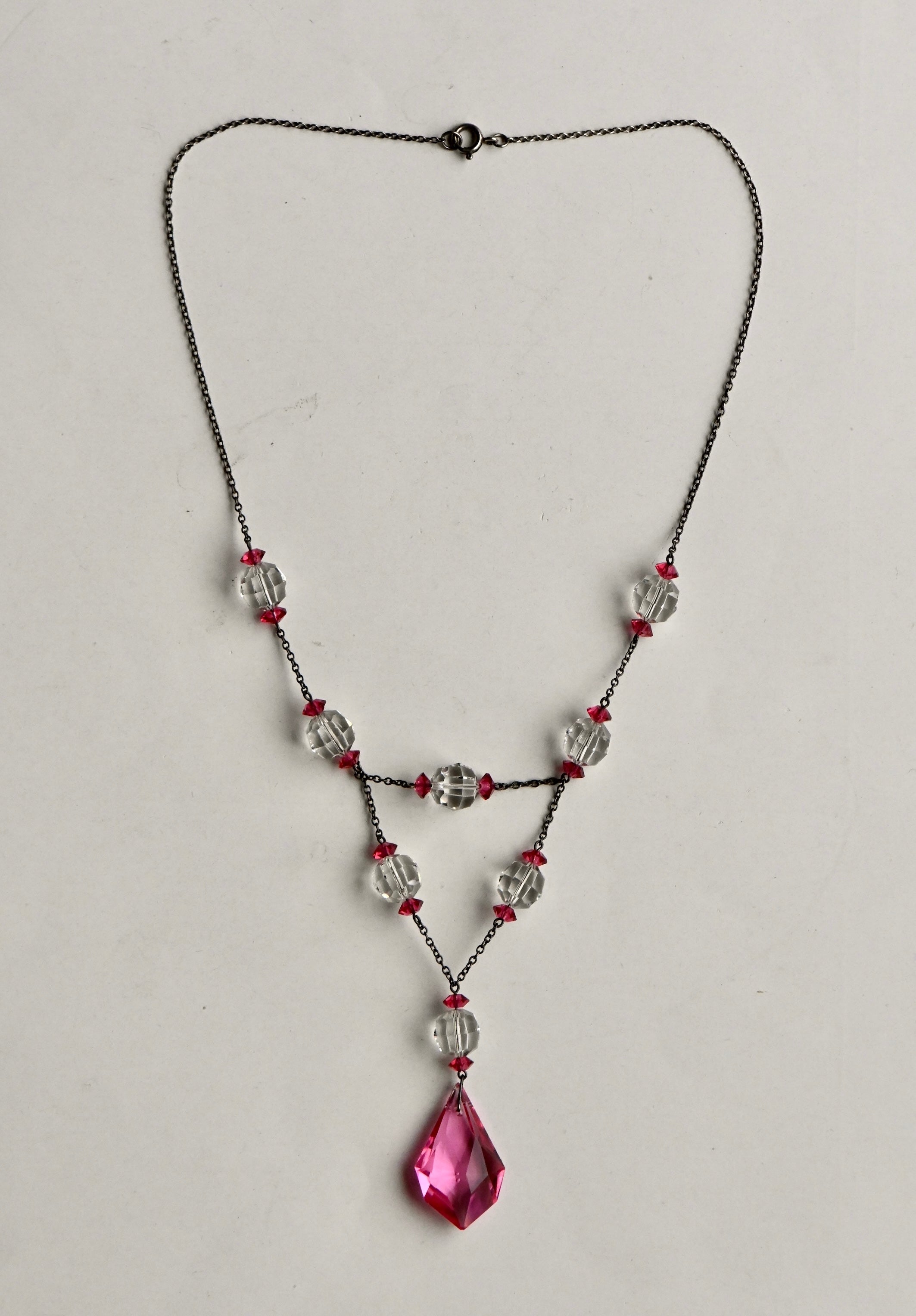 A ca. 1920s two-tiered festoon necklace with hand-cut crystal beads. The necklace has a delicate cable link chain spaced with trios of clear and bright pink beads. The clear crystal beads are faceted rounds (9mm) and the pink beads are faceted disks. A short chain suspends one such trio near the hollow of the neck, with the rest of the necklace continuing on to suspend a beautiful pear-shaped pink stone. The beads are in excellent condition with only a few "flea bite" nicks consistent with age. Secures with a spring ring clasp. Nearly 20g of Art Deco beauty!