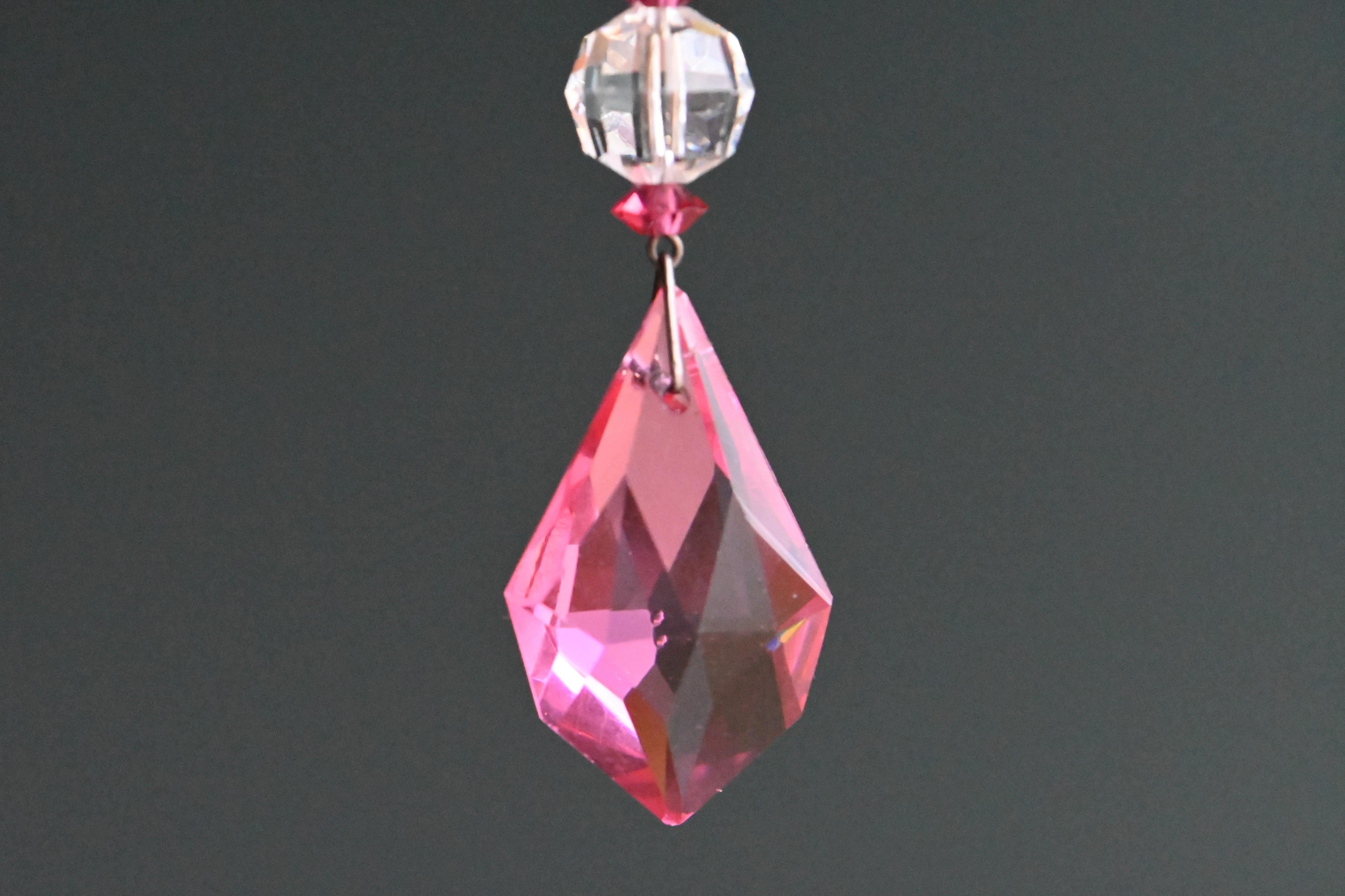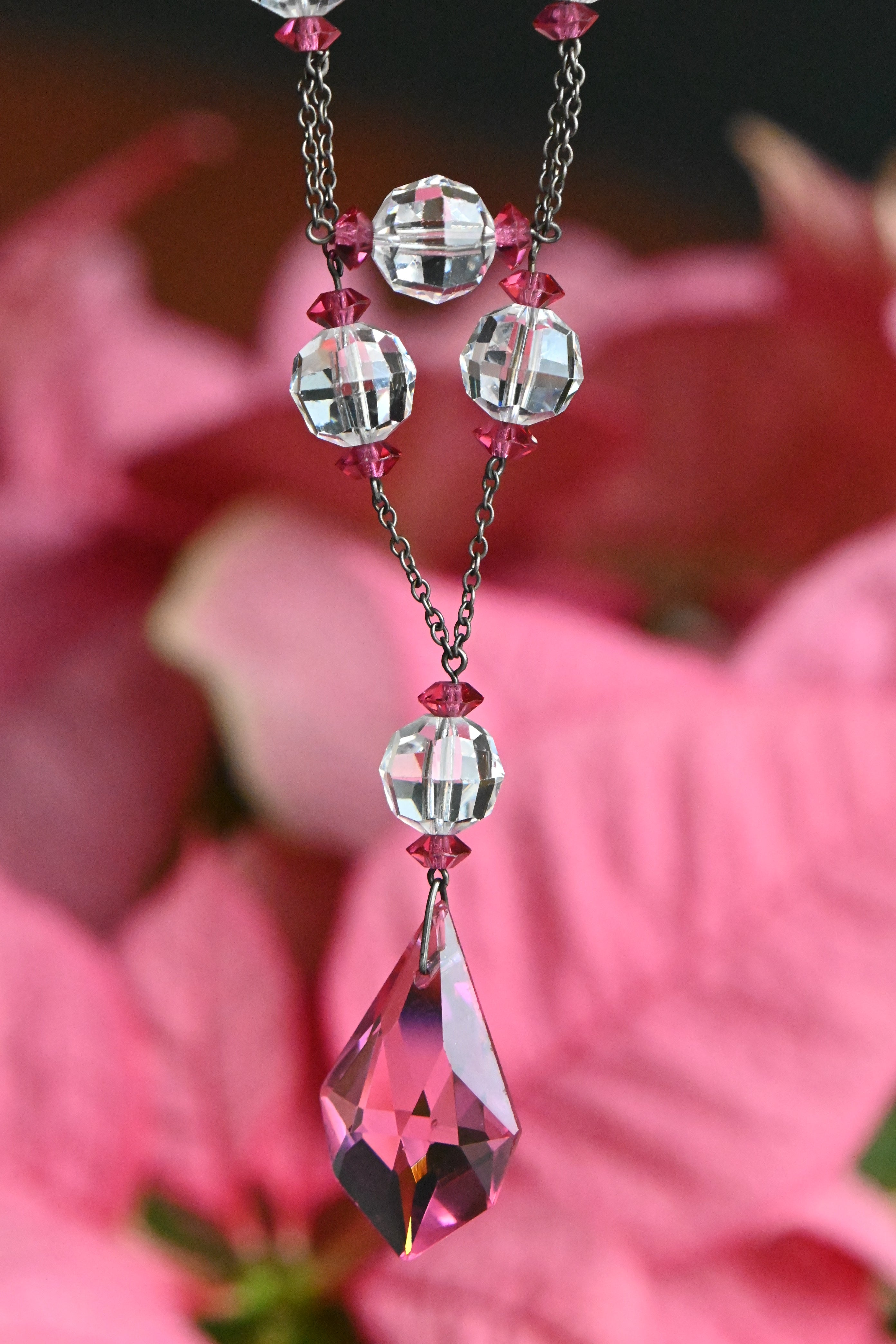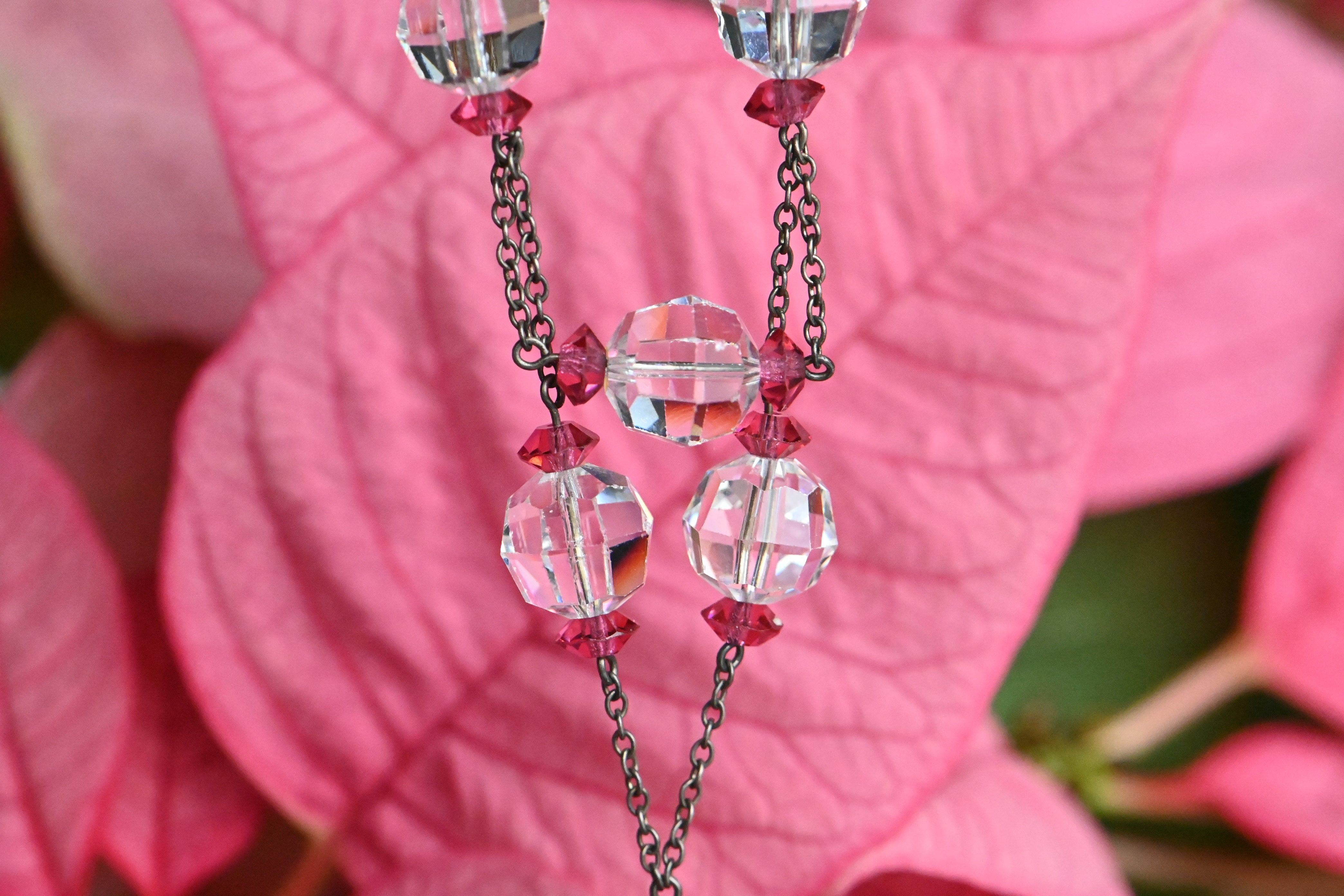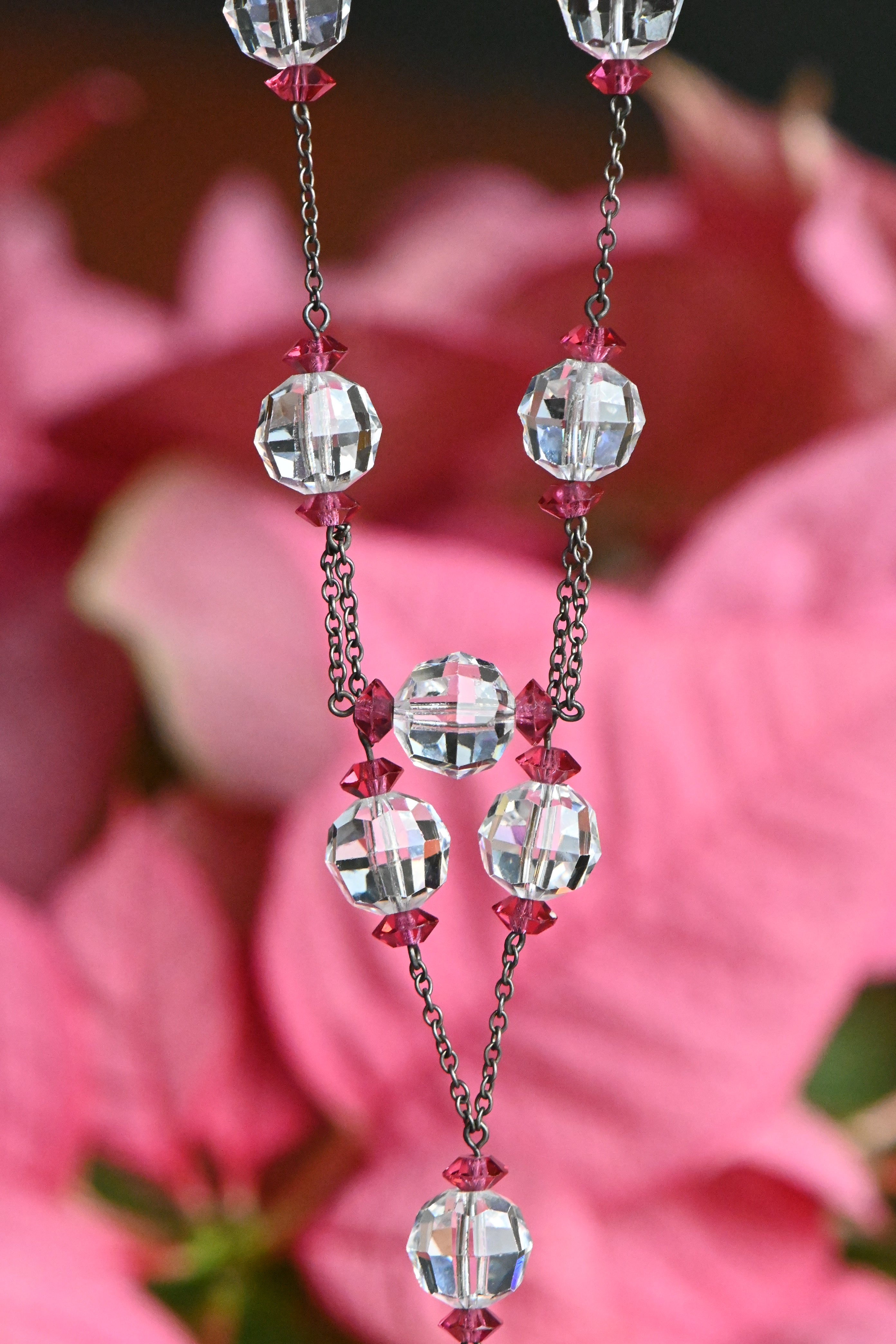 A ca. 1920s two-tiered festoon necklace with hand-cut crystal beads. The necklace has a delicate cable link chain spaced with trios of clear and bright pink beads. The clear crystal beads are faceted rounds (9mm) and the pink beads are faceted disks. A short chain suspends one such trio near the hollow of the neck, with the rest of the necklace continuing on to suspend a beautiful pear-shaped pink stone. The beads are in excellent condition with only a few "flea bite" nicks consistent with age. Secures with a spring ring clasp. Nearly 20g of Art Deco beauty!
