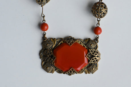An Art Deco molded glass and cast brass filigree necklace in a delicious shade of orange. The persimmon-colored, opaque glass is an unusual and wonderful color to see in jewelry from this period and the round and spool-shaped beads are superb. Cast brass sphere stations and an ornate medallion feature give this piece wonderful texture and detail. Excellent condition.