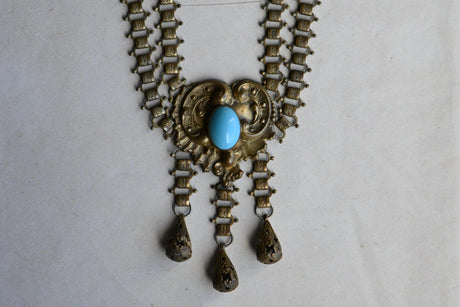 Antique 1930s cast brass festoon necklace with turquoise glass