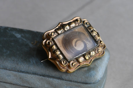 A mid-Victorian mourning brooch with a hair work compartment and a decorative Baroque-style frame. The rectangular pin is beautifully modeled and thickly plated in yellow gold. The scroll and leaf details around the border are thick and nicely articulated. A fitted frame of glass holds a little lock of brown hair at the center of the pin. Tube hinge and "c" clasp. I suspect this was a sentimental piece worn for a living loved one at the time.