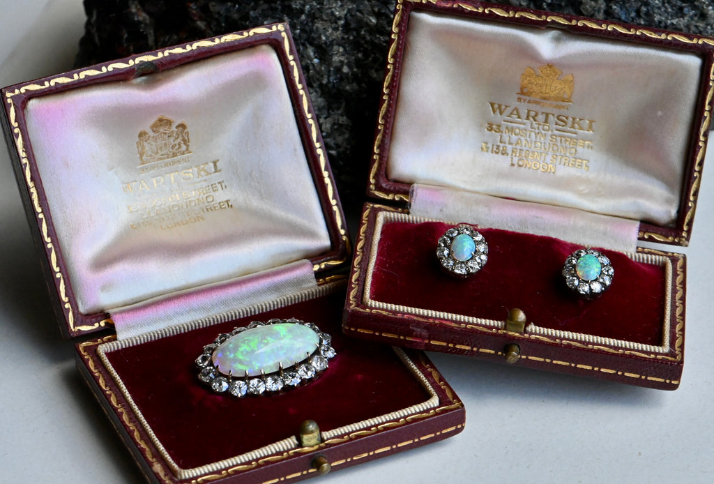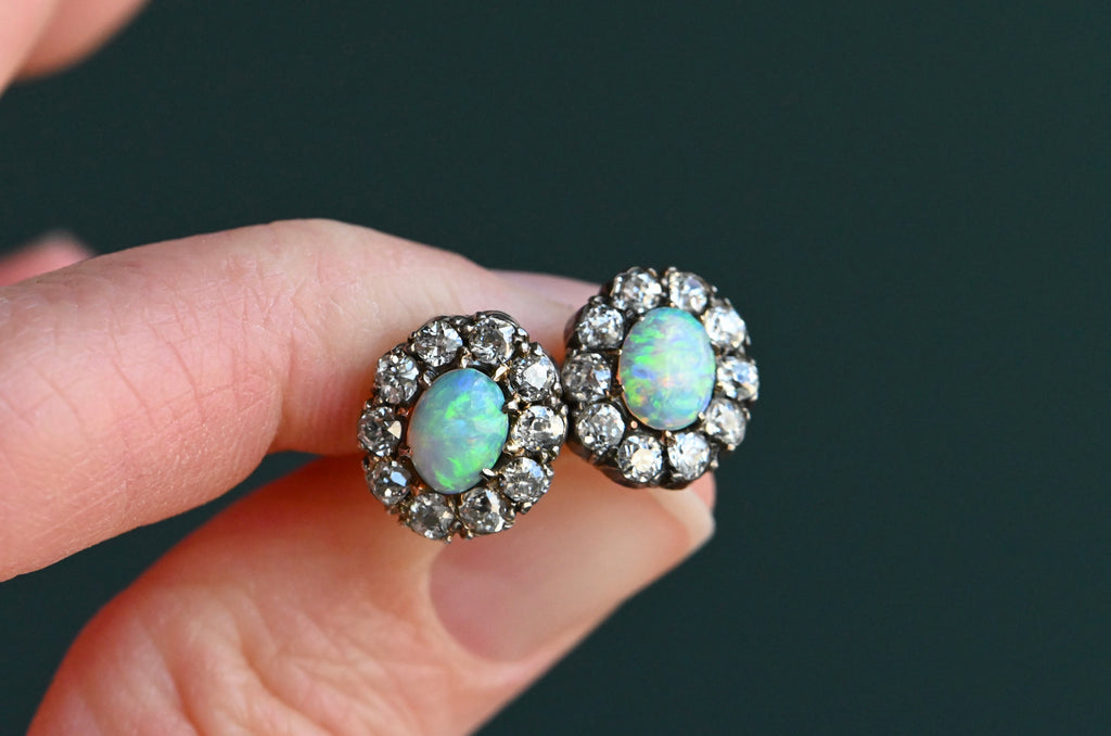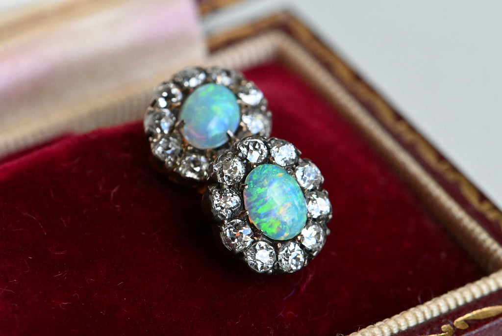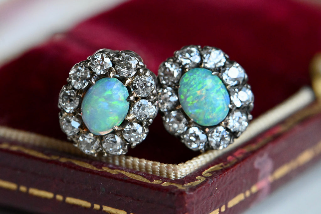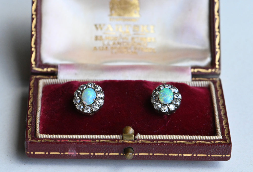 Antique 1910s Edwardian opal and diamond halo earrings in original Wartski box