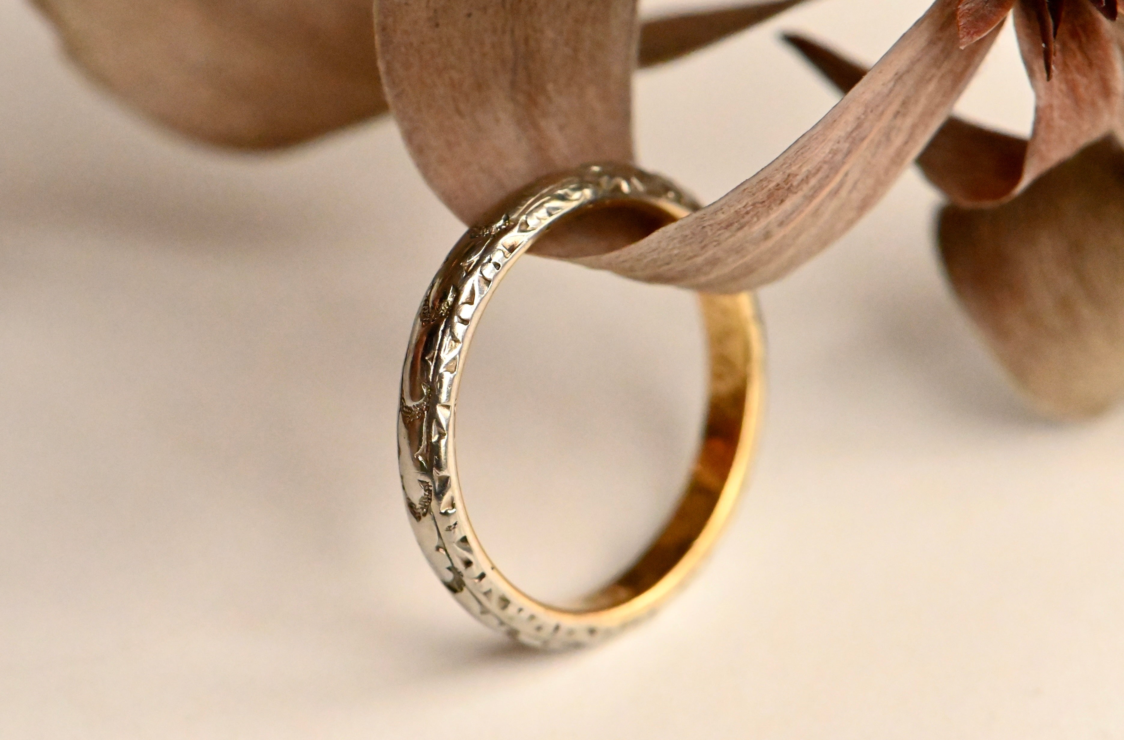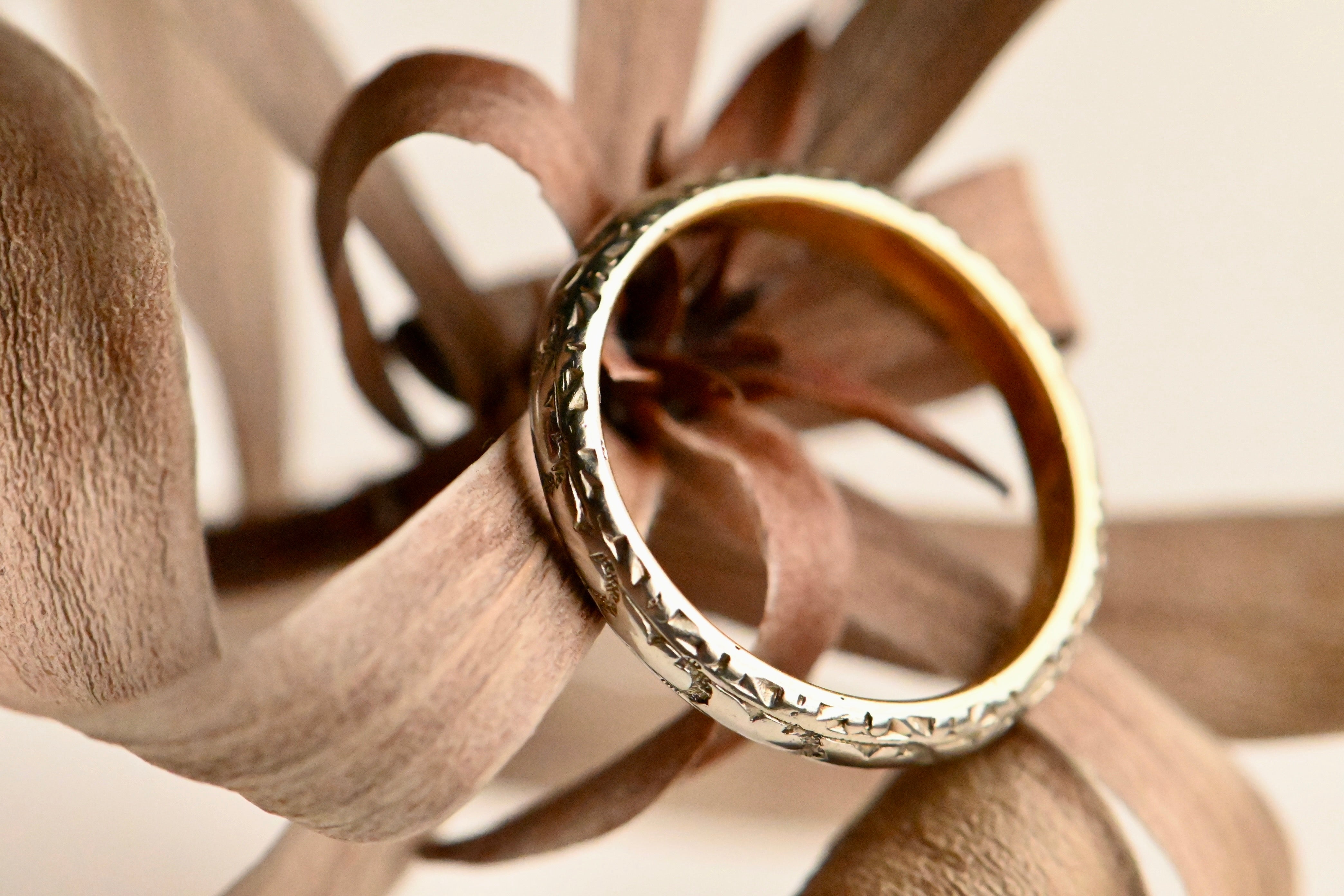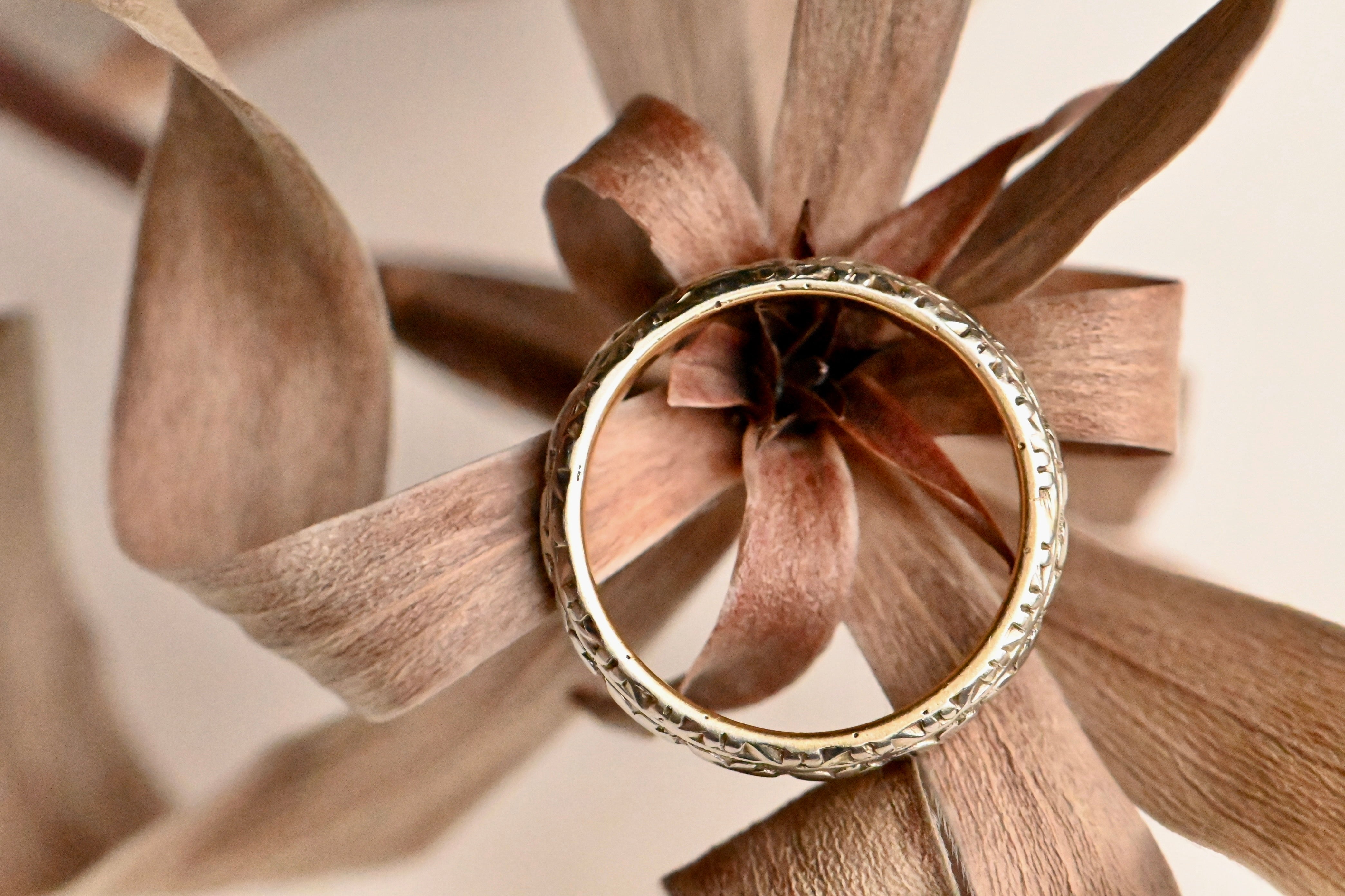 A WWI-Era platinum and 22K gold-lined wedding band engraved for a wedding on May 29th, 1917. We can assume that the lives of this couple were most definitely impacted by the U.S. entry into WWI, which occurred about two months prior to their wedding. This band features a faded orange blossom pattern with engraved sides. The interior is engraved for the couple and their wedding date.