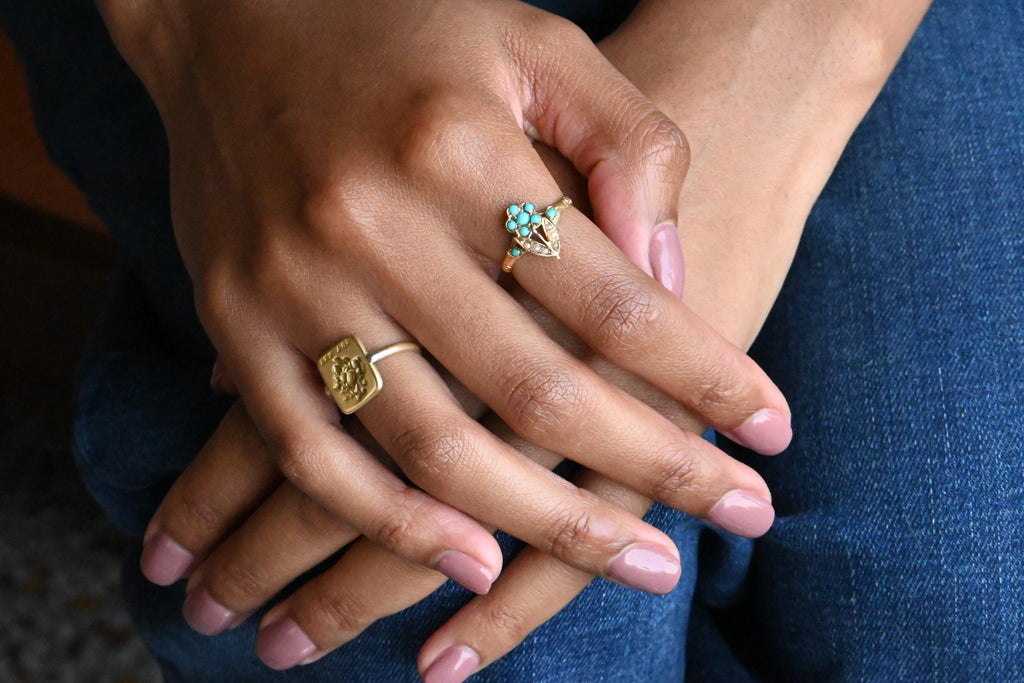 A Late Victorian Forget-Me-Not ring in 15 CT gold with turquoise and pearls. The Forget-Me-Not was a symbol of true love and remembrance to the Victorians and this ring features a single-stem in bloom with leaves. The flower is represented by six turquoise cabochons and the leaves are set with split pearls. Each shoulder has a further turquoise inset as well as an engraved blossoms a bit further down the shank. A remarkably delicate ring that has survived 150 years! We replaced three absent pearls to prepare this for sale, but it required nothing else. Excellent condition.