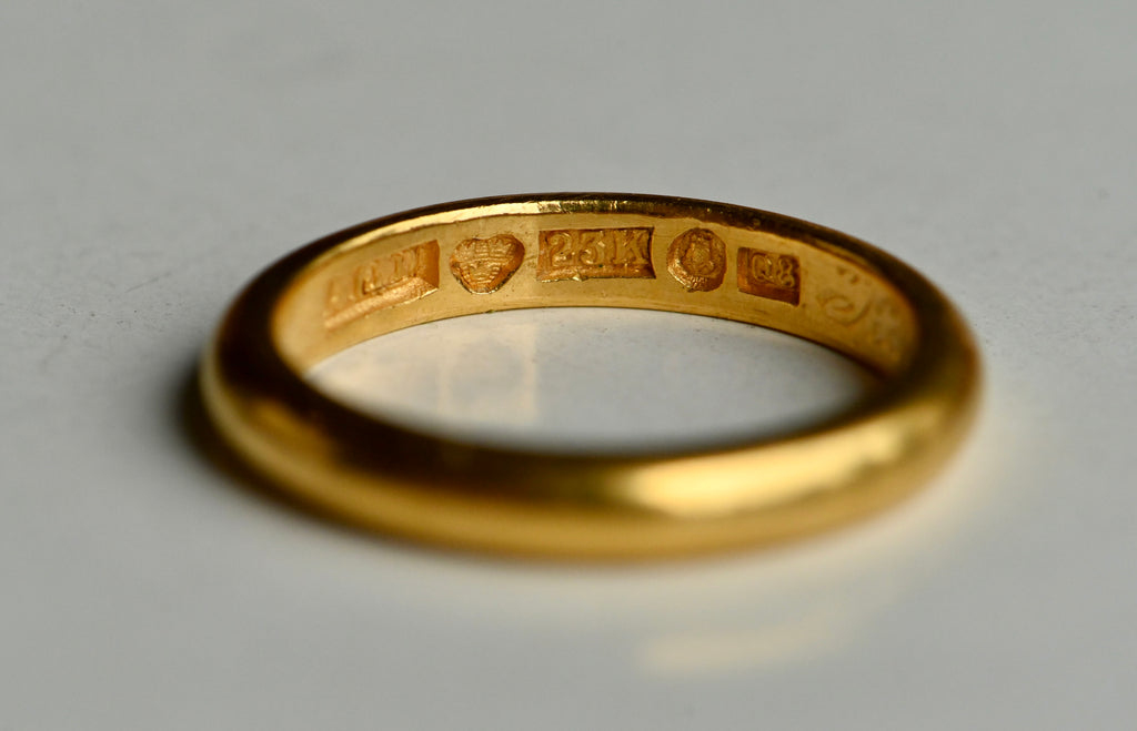 A 23K vintage wedding band hallmarked for the year 1942 in Stockholm, Sweden. Plain, simple and perfect. This band glows with with 83 years of history and patina. Fully hallmarked and excellent condition.