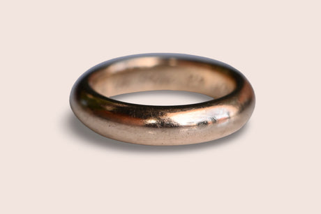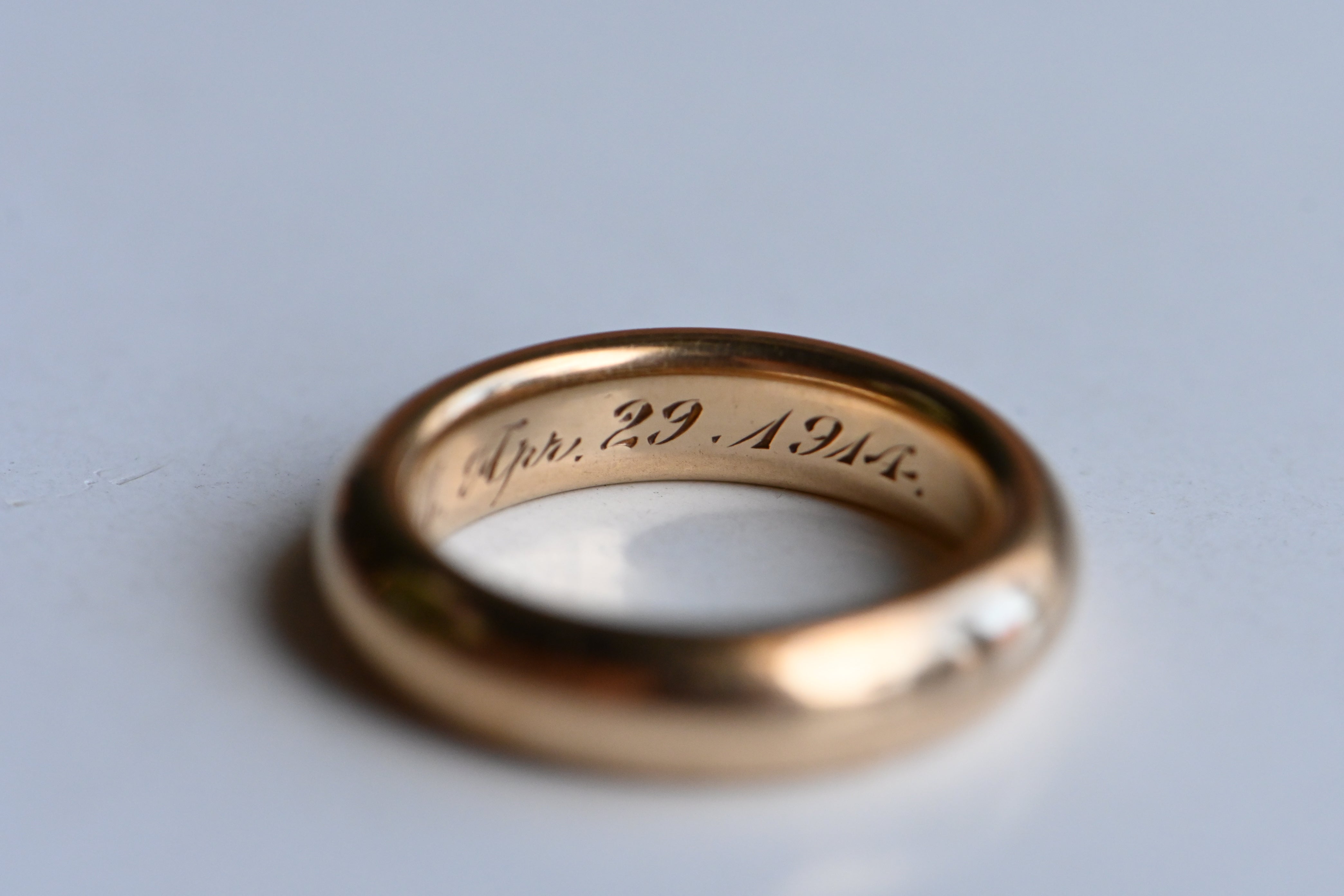 An early 20th century 18K band engraved for a wedding on April 19th, 1914 - just a couple months before the start of WWI. This band has the coveted "donut" shape and accompanying heft that we all love. 8.4 grams and built to last another century with you.  Super comfortable with a solid and time-tested form. Hallmarked for the J.B. Bowden & Co. firm, founded in 1832 and known for their "seamless" wedding bands and rings.