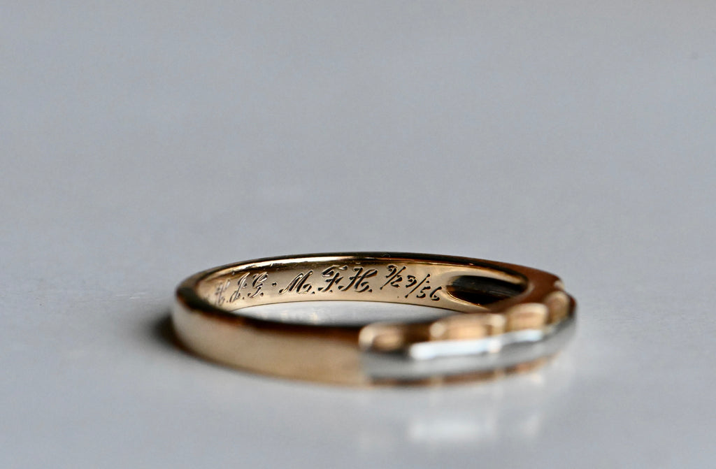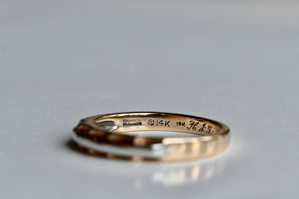 A Detroit-made wedding band engraved for a wedding on September 29, 1956. The band was made by Traub Manufacturing Co., Detroit, MI. Their "Orange Blossom" collection was an extensive and hugely popular line of jewelry. It is exciting to find a two-tone band from their mid-century collection. This one is 14K yellow gold with an 18K white gold accent bisecting a scalloped face. Excellent vintage condition and turning 70-years-old next year!