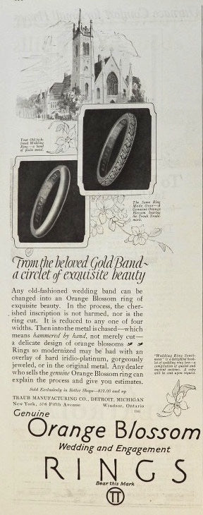 Markings: The mark for Traub Manufacturing Co., Detroit. 14K 18K, the couple's monograms and their wedding date